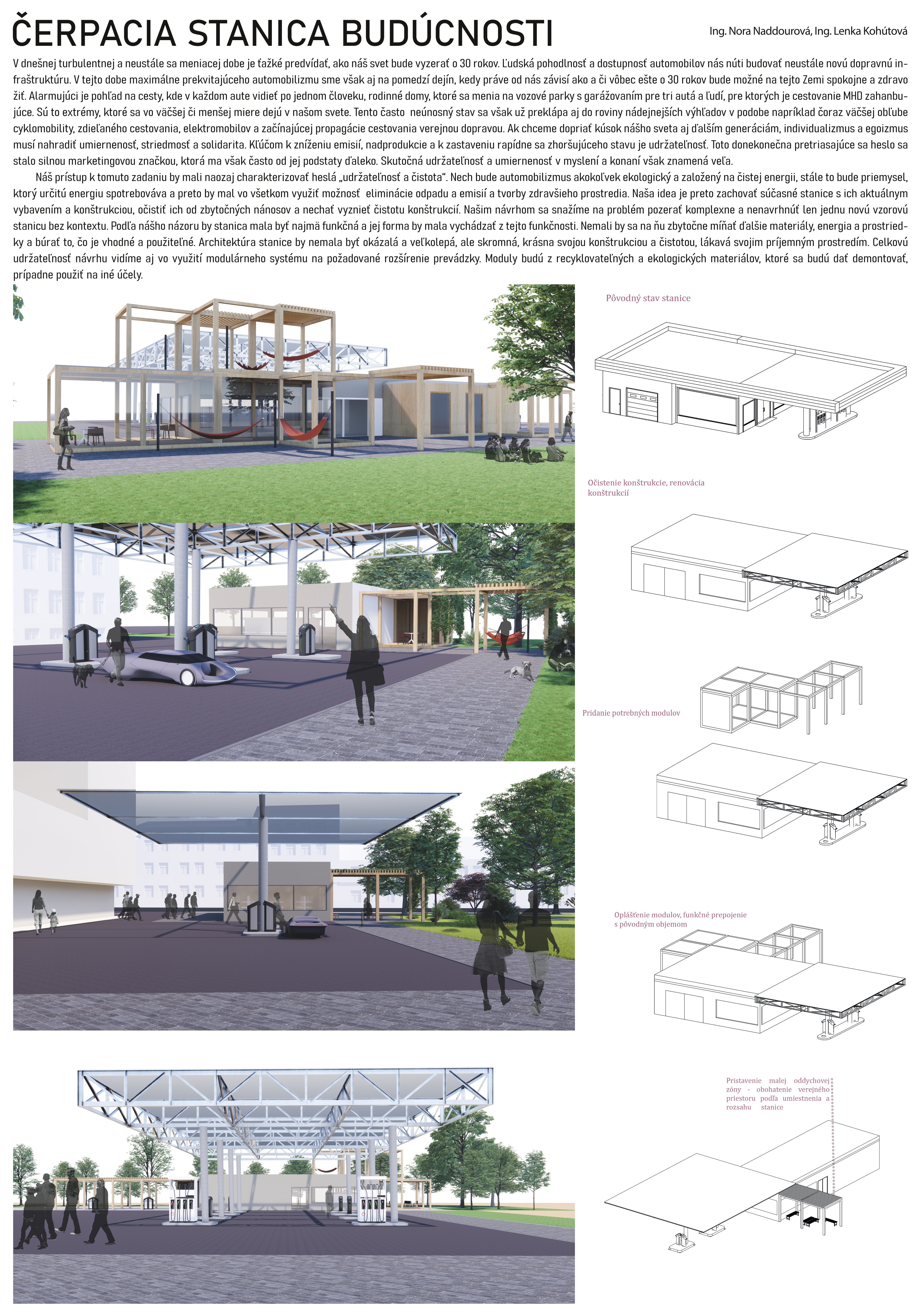 Ako bude vyzerať mobilita a dizajn čerpacích staníc v roku 2052? Ťažká otázka budúcnosti, ktorú bolo potrebné pretaviť do návrhu. Hlavná idea autoriek zachovať v čo najväčšej možnej miere existujúce čerpacie stanice a očistiť ich od nánosov zbytočného materiálu, ktorý nepridáva hodnotu funkčnej ani estetickej stránke, hodnotím kladne. Na problém sa autorky pozerajú komplexnejšie a prichádzajú s rozdelením staníc do troch skupín podľa ich aktuálneho umiestnenia. Návrh reaguje na súčasnú situáciu na trhu s energiami a zdrojmi, ktoré sú obmedzené. Zodpovednejšie by sa mala začať správať celá spoločnosť, aby ďalšie generácie vôbec mali možnosť cestovať. Navrhnuté dostavby mohli byť po architektonickej stránke odvážnejšie.