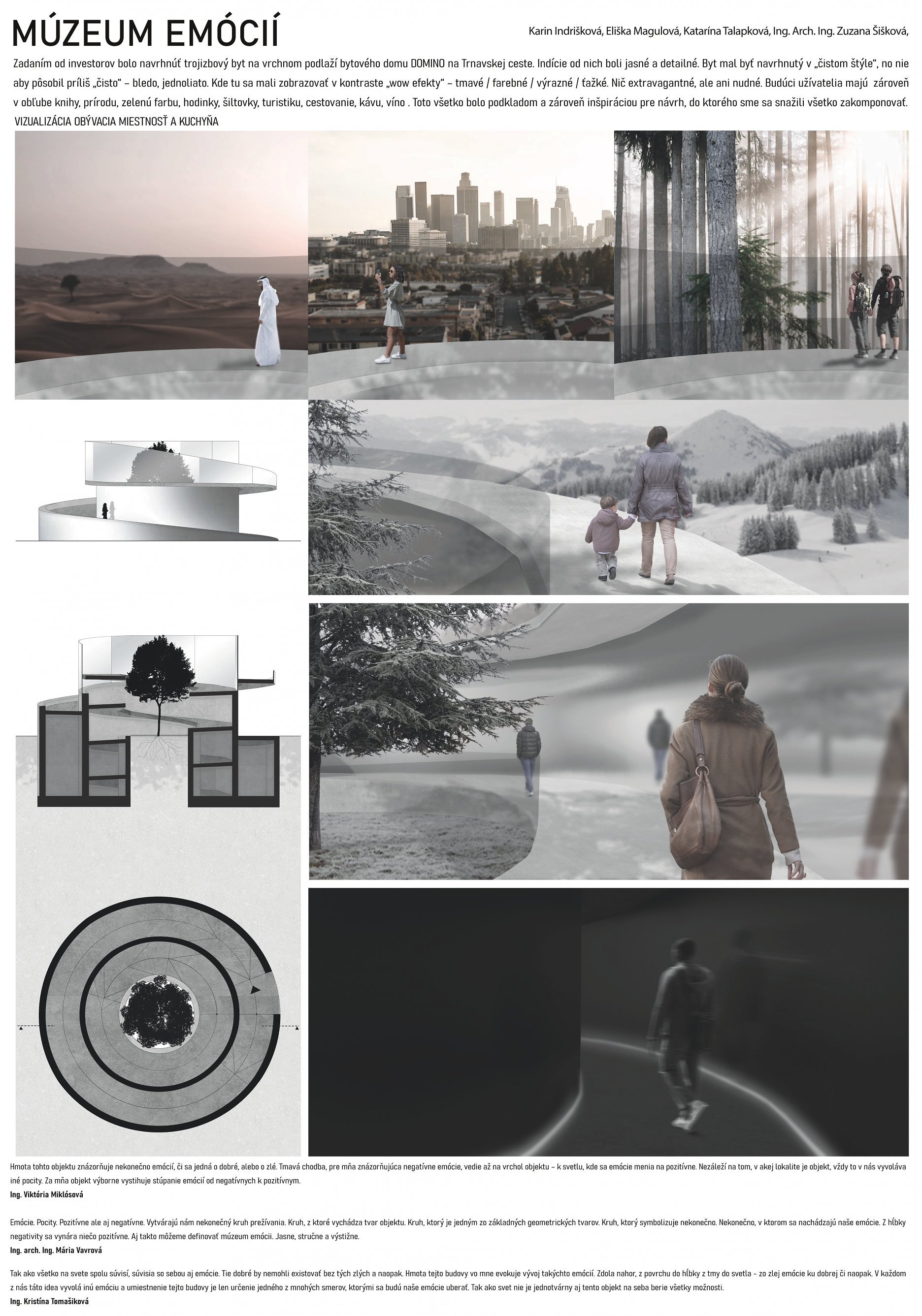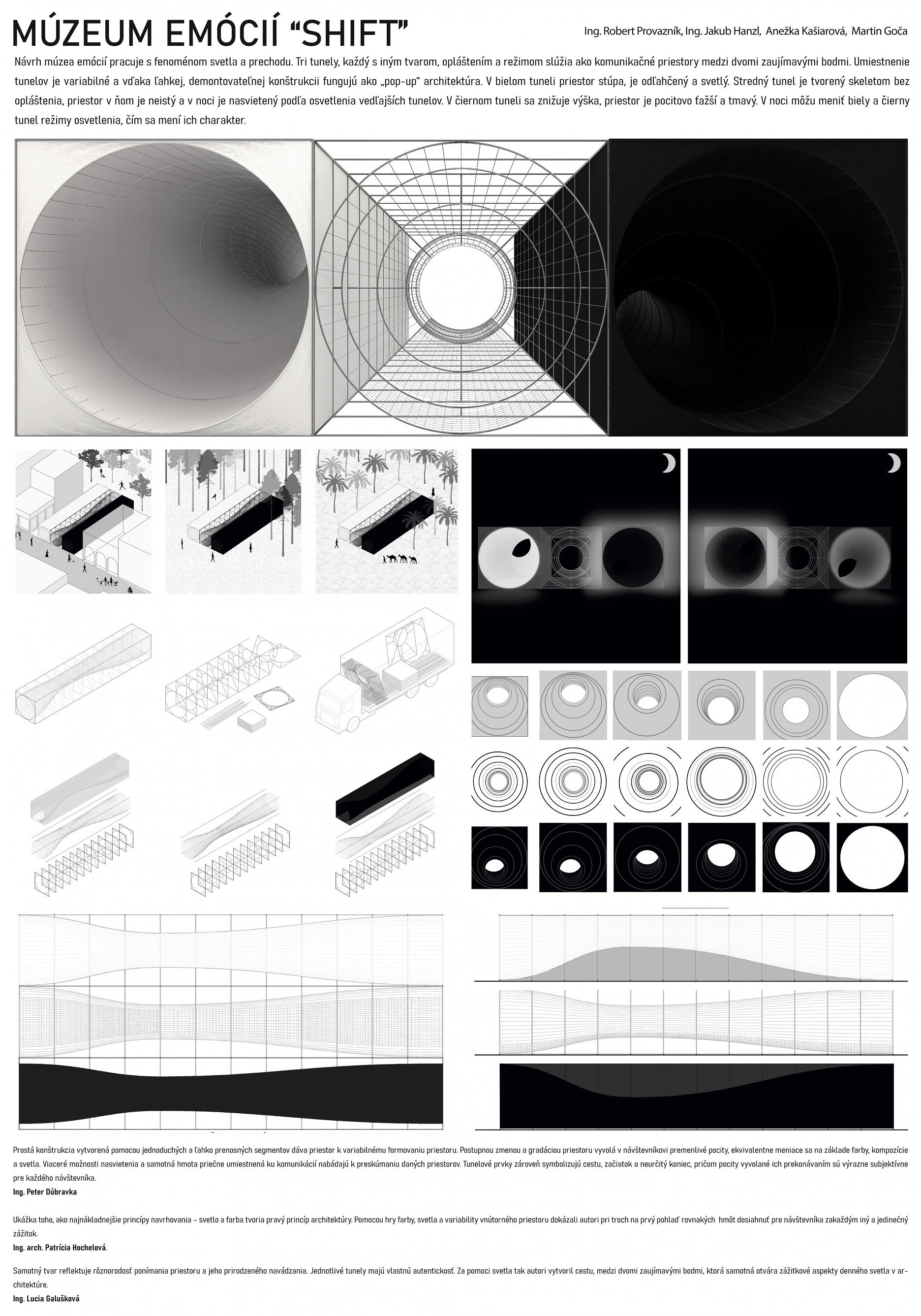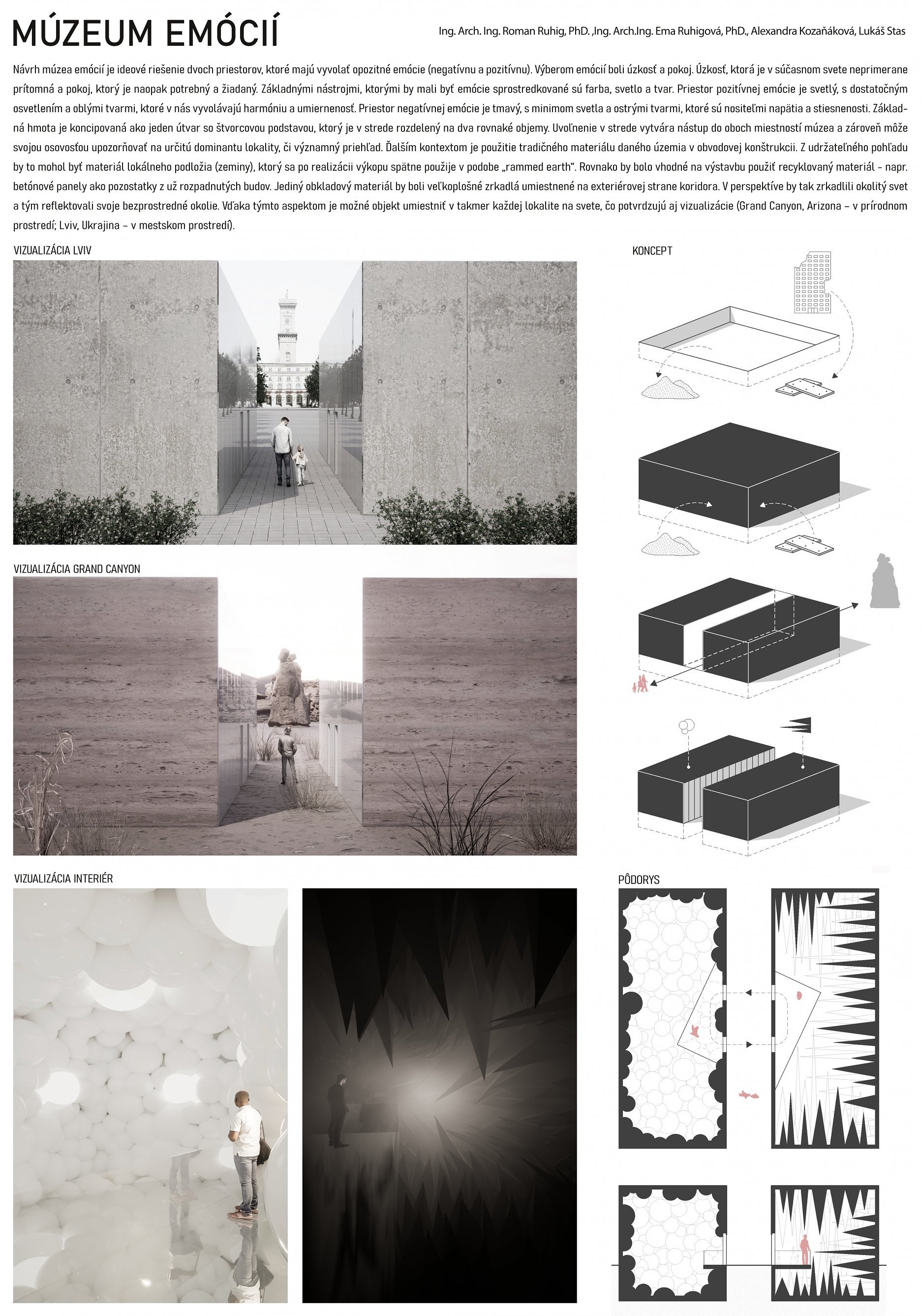 Súťažný návrh je dôkazom toho, ako v nás architektonicky vytvorený priestor dokáže vyvolávať emócie. Odlišná hra tvarov, svetla a farby mení dva hmotovo identické objekty na expozície zanechávajúce v návštevníkovi protikladné zážitky - pozitívny a negatívny. Prezentované emócie - pokoj a úzkosť výstižne reflektujú dnešnú dobu. Jednoduché hmotové stvárnenie je ľahko aplikovateľné do rôznych prostredí, kde vďaka vytvorenému priehľadu a variabilnému materiálovému riešeniu nenaruší okolité štruktúry, naopak ich podporí.