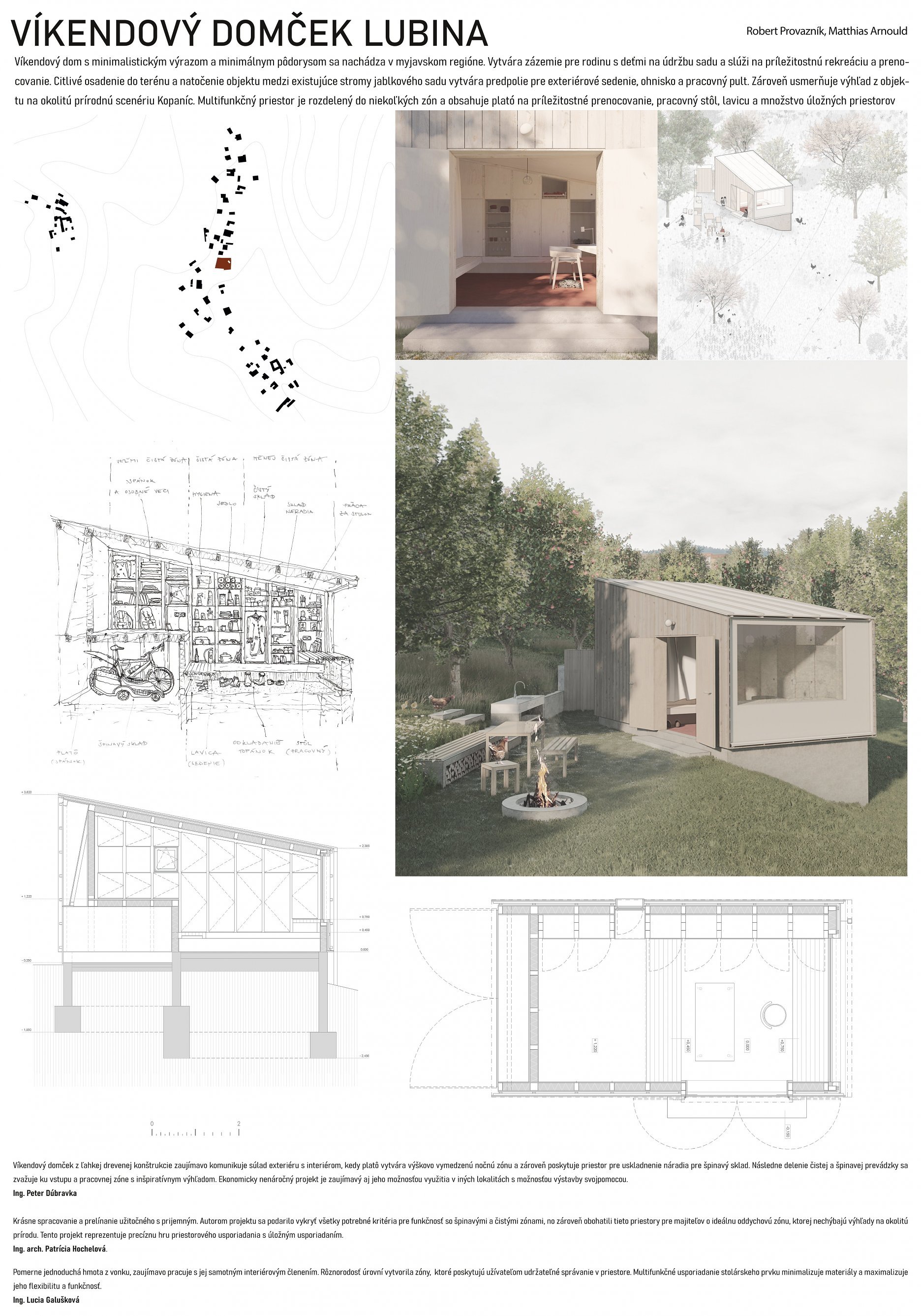 Víkendový domček z ľahkej drevenej konštrukcie zaujímavo komunikuje súlad exteriéru s interiérom, kedy plató vytvára výškovo vymedzenú nočnú zónu a zároveň poskytuje priestor pre uskladnenie náradia pre špinavý sklad. Následne delenie čistej a špinavej prevádzky sa zvažuje ku vstupu a pracovnej zóne s inšpiratívnym výhľadom. Ekonomicky nenáročný projekt je zaujímavý aj jeho možnosťou využitia v iných lokalitách s možnosťou výstavby svojpomocou.