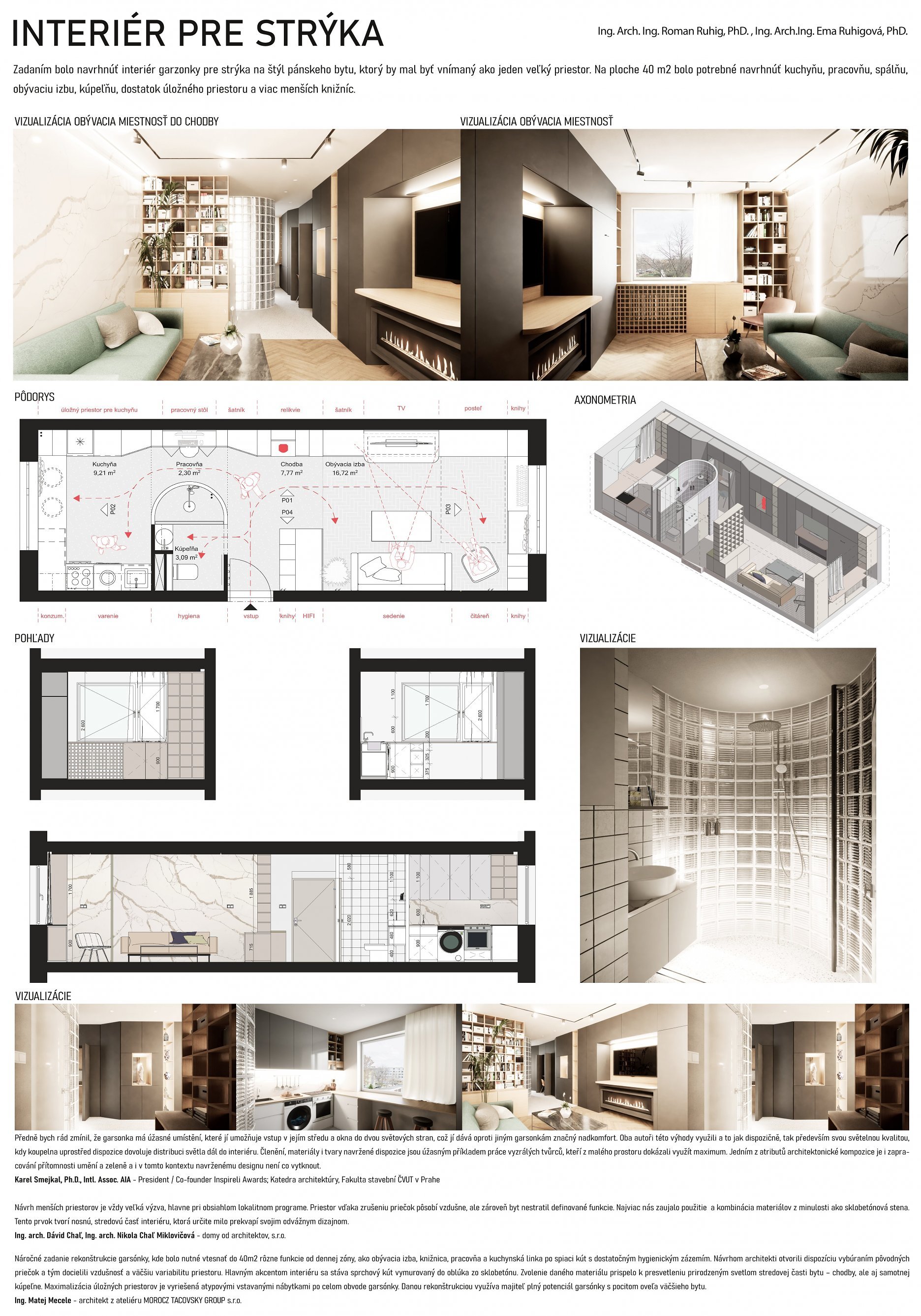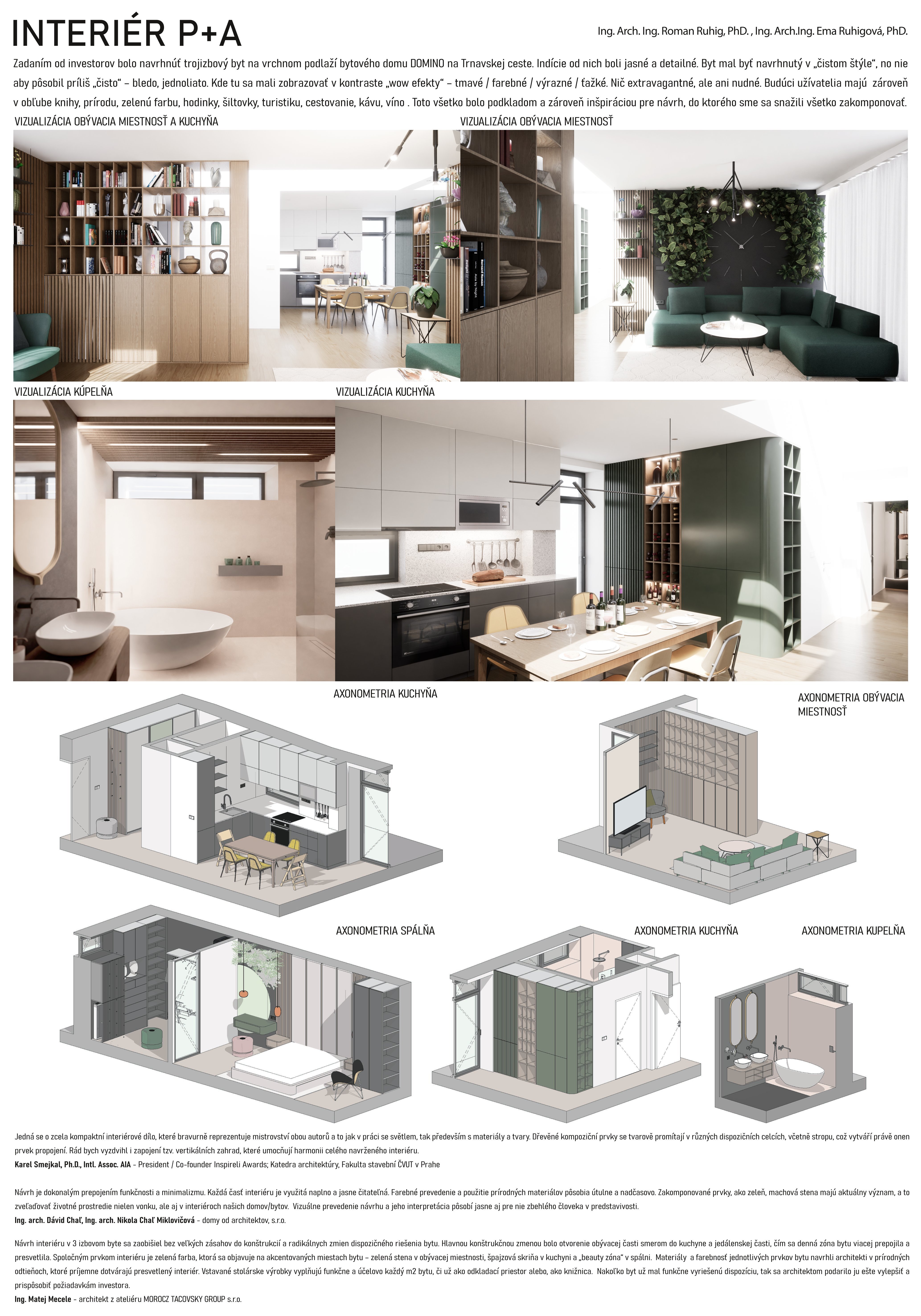 Návrh je dokonalým prepojením funkčnosti a minimalizmu. Každá časť interiéru je využitá naplno a jasne čitateľná. Farebné prevedenie a použitie prírodných materiálov pôsobia útulne a nadčasovo. Zakomponované prvky, ako zeleň, machová stena majú aktuálny význam, a to zveľaďovať životné prostredie nielen vonku, ale aj v interiéroch našich domov/bytov. Vizuálne prevedenie návrhu a jeho interpretácia pôsobí jasne aj pre nie zbehlého človeka v predstavivosti.