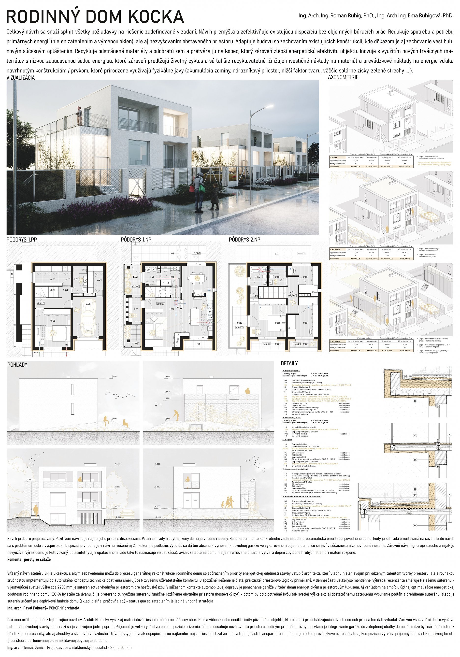 Víťazný návrh ateliéru ER je ukážkou, s akým sebavedomím môžu do procesu generálnej rekonštrukcie rodinného domu so zdôraznením priority energetickej odolnosti stavby vstúpiť architekti, ktorí vládnu nielen svojim prirodzeným talentom tvorby priestoru, ale s rovnakou zručnosťou implementujú do autorského konceptu technické opatrenia smerujúce k zvýšeniu užívateľského komfortu. Dispozičné riešenie je čisté, praktické, priestorovo logicky primerané, v dennej časti veľkoryso mondénne. Výhrada recenzenta smeruje k riešeniu suterénu - v jestvujúcej svetlej výške cca 2200 mm je suterén sotva vhodným priestorom pre hosťovskú izbu. V súčasnom kontexte automobilovej dopravy je ponechanie garáže v "tele" domu energetickým a priestorovým luxusom. Aj vzhľadom na ambíciu úplnej optimalizácie energetickej odolnosti rodinného domu KOCKA by stálo za úvahu, či je preferenciou využitia suterénu funkčné rozšírenie obytného priestoru (hosťovský byt) - potom by bolo potrebné kvôli tak svetlej výške ako aj dostatočnému zatepleniu vybúranie podláh a prehĺbenie suterénu, alebo je suterén určený pre doplnkové funkcie domu (sklad, dielňa, práčovňa ap.) - status quo so zateplením je jediná vhodná stratégia.