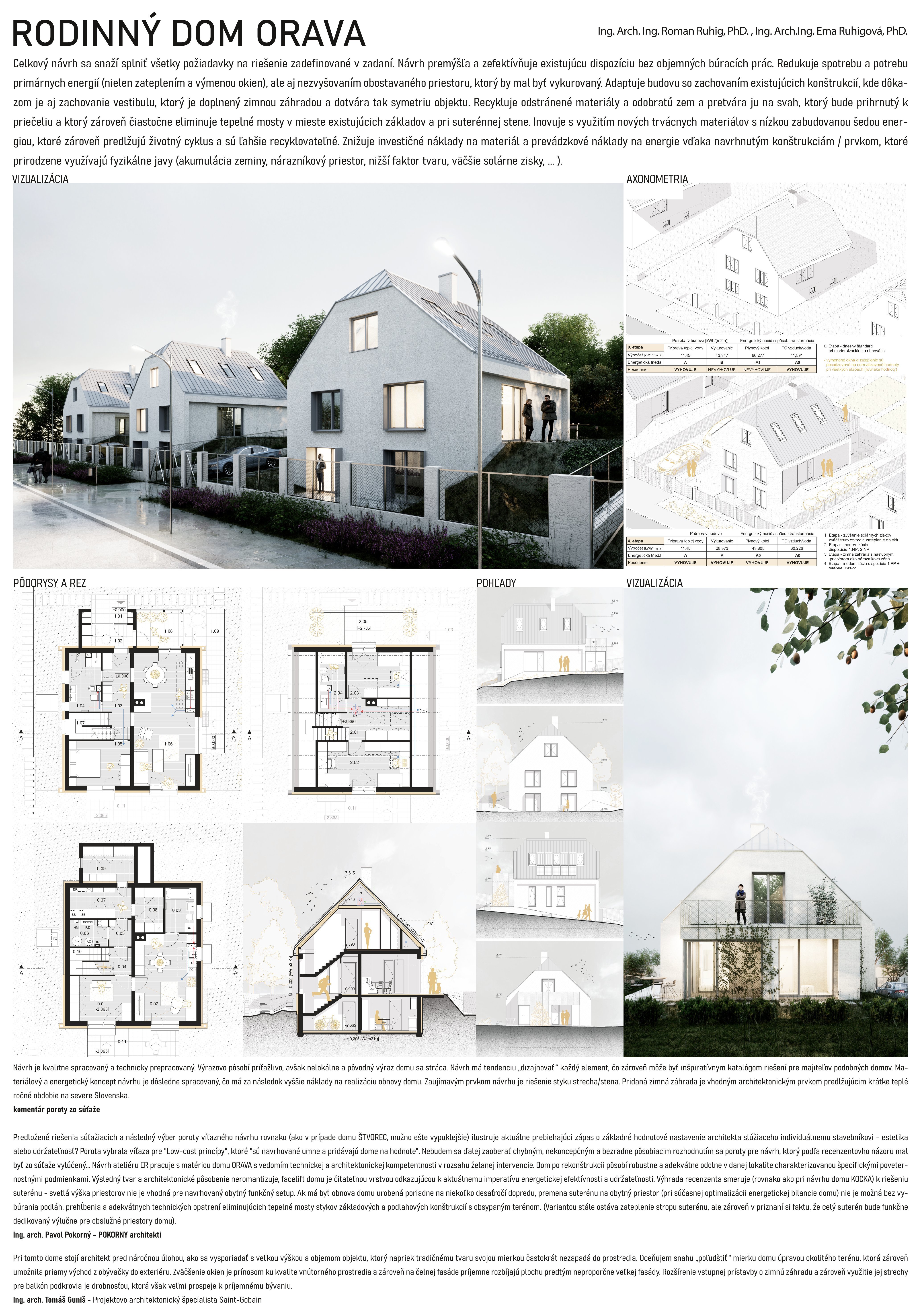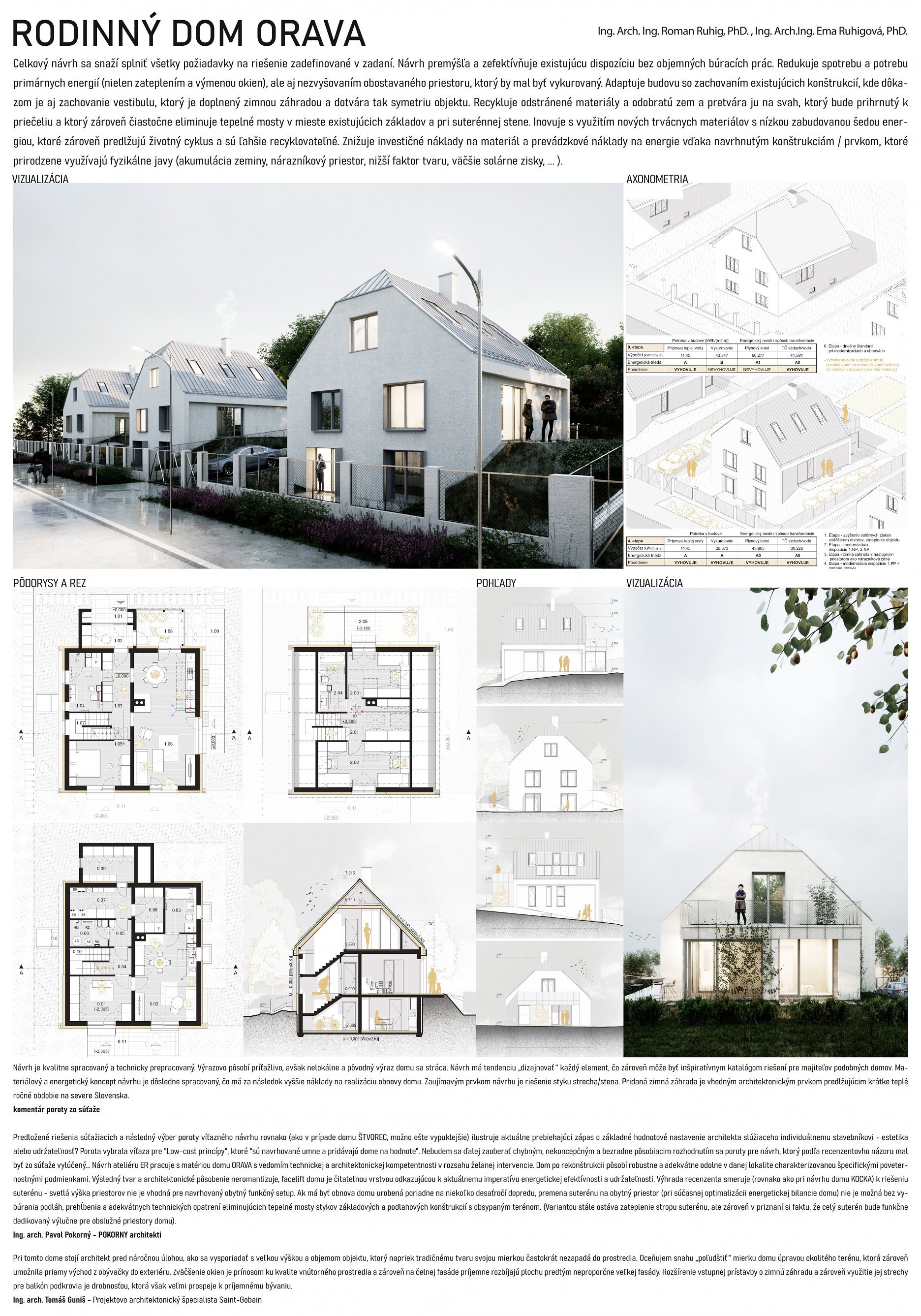 Návrh ateliéru ER pracuje s matériou domu ORAVA s vedomím technickej a architektonickej kompetentnosti v rozsahu želanej intervencie. Dom po rekonštrukcii pôsobí robustne a adekvátne odolne v danej lokalite charakterizovanou špecifickými poveternostnými podmienkami. Výsledný tvar a architektonické pôsobenie neromantizuje, facelift domu je čitateľnou vrstvou odkazujúcou k aktuálnemu imperatívu energetickej efektívnosti a udržateľnosti. Výhrada recenzenta smeruje (rovnako ako pri návrhu domu KOCKA) k riešeniu suterénu - svetlá výška priestorov nie je vhodná pre navrhovaný obytný funkčný setup. Ak má byť obnova domu urobená poriadne na niekoľko desaťročí dopredu, premena suterénu na obytný priestor (pri súčasnej optimalizácii energetickej bilancie domu) nie je možná bez vybúrania podláh, prehĺbenia a adekvátnych technických opatrení eliminujúcich tepelné mosty stykov základových a podlahových konštrukcií s obsypaným terénom. (Variantou stále ostáva zateplenie stropu suterénu, ale zároveň v priznaní si faktu, že celý suterén bude funkčne dedikovaný výlučne pre obslužné priestory domu).