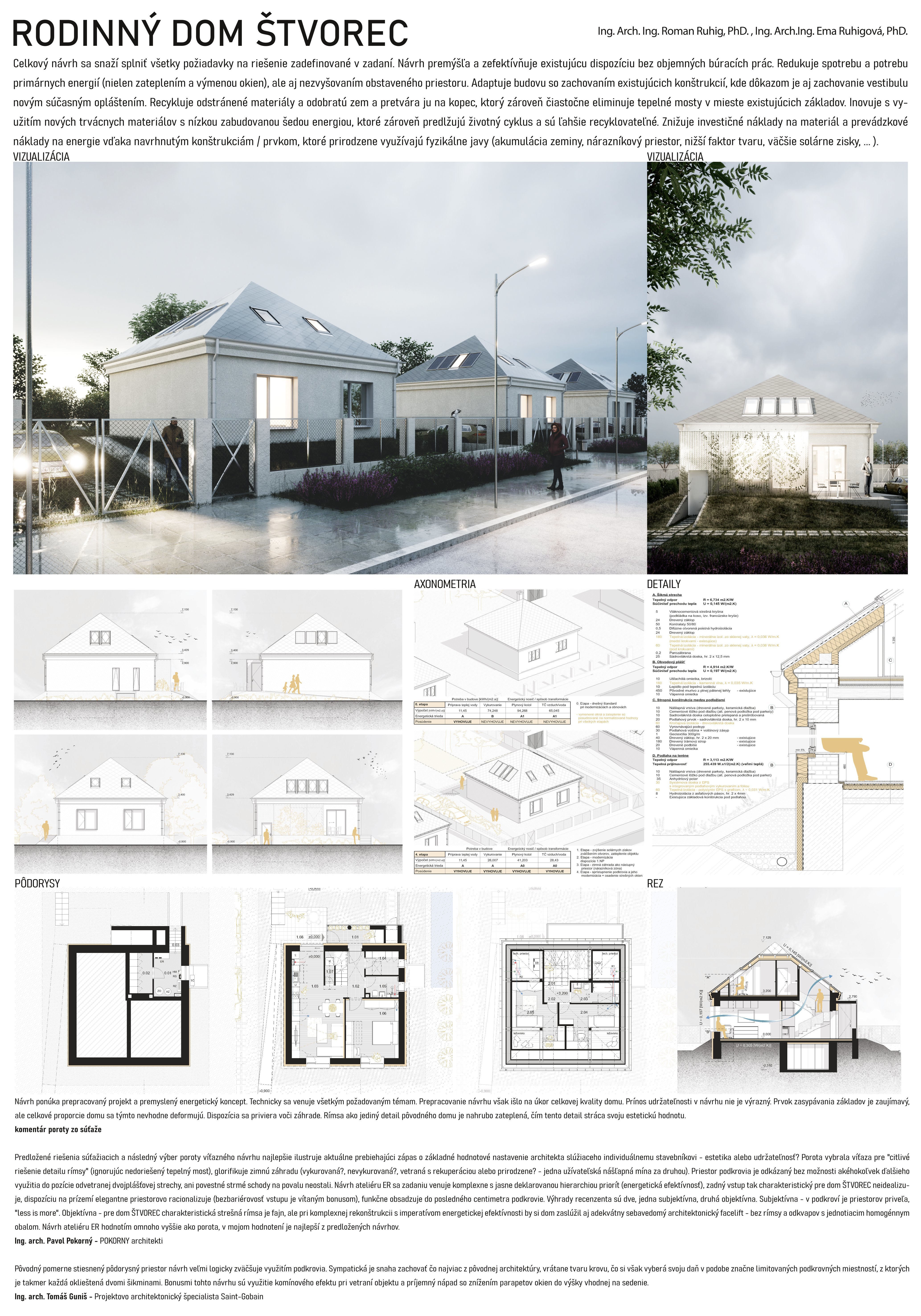 Predložené riešenia súťažiacich a následný výber poroty víťazného návrhu najlepšie ilustruje aktuálne prebiehajúci zápas o základné hodnotové nastavenie architekta slúžiaceho individuálnemu stavebníkovi - estetika alebo udržateľnosť? Porota vybrala víťaza pre "citlivé riešenie detailu rímsy" (ignorujúc nedoriešený tepelný most), glorifikuje zimnú záhradu (vykurovaná?, nevykurovaná?, vetraná s rekuperáciou alebo prirodzene? - jedna užívateľská nášľapná mína za druhou). Priestor podkrovia je odkázaný bez možnosti akéhokoľvek ďalšieho využitia do pozície odvetranej dvojplášťovej strechy, ani povestné strmé schody na povalu neostali. Návrh ateliéru ER sa zadaniu venuje komplexne s jasne deklarovanou hierarchiou priorít (energetická efektívnosť), zadný vstup tak charakteristický pre dom ŠTVOREC neidealizuje, dispozíciu na prízemí elegantne priestorovo racionalizuje (bezbariérovosť vstupu je vítaným bonusom), funkčne obsadzuje do posledného centimetra podkrovie. Výhrady recenzenta sú dve, jedna subjektívna, druhá objektívna. Subjektívna - v podkroví je priestorov priveľa, "less is more". Objektívna - pre dom ŠTVOREC charakteristická strešná rímsa je fajn, ale pri komplexnej rekonštrukcii s imperatívom energetickej efektívnosti by si dom zaslúžil aj adekvátny sebavedomý architektonický facelift - bez rímsy a odkvapov s jednotiacim homogénnym obalom. Návrh ateliéru ER hodnotím omnoho vyššie ako porota, v mojom hodnotení je najlepší z predložených návrhov.