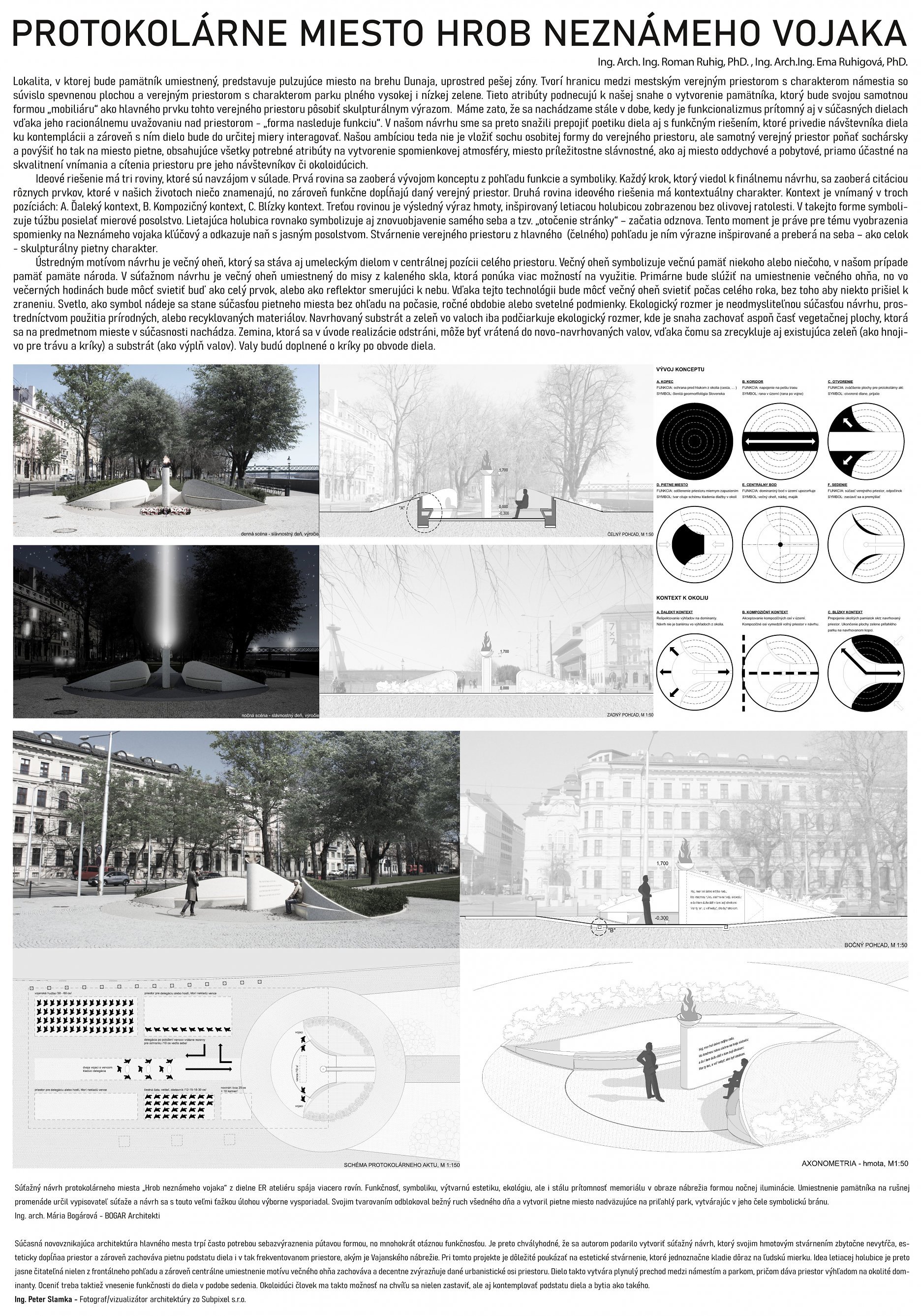Súťažný návrh protokolárneho miesta „Hrob neznámeho vojaka“ z dielne ER ateliéru spája viacero rovín. Funkčnosť, symboliku, výtvarnú estetiku, ekológiu, ale i stálu prítomnosť memoriálu v obraze nábrežia formou nočnej iluminácie. Umiestnenie pamätníka na rušnej promenáde určil vypisovateľ súťaže a návrh sa s touto veľmi ťažkou úlohou výborne vysporiadal. Svojim tvarovaním odblokoval bežný ruch všedného dňa a vytvoril pietne miesto nadväzujúce na priľahlý park, vytvárajúc v jeho čele symbolickú bránu.