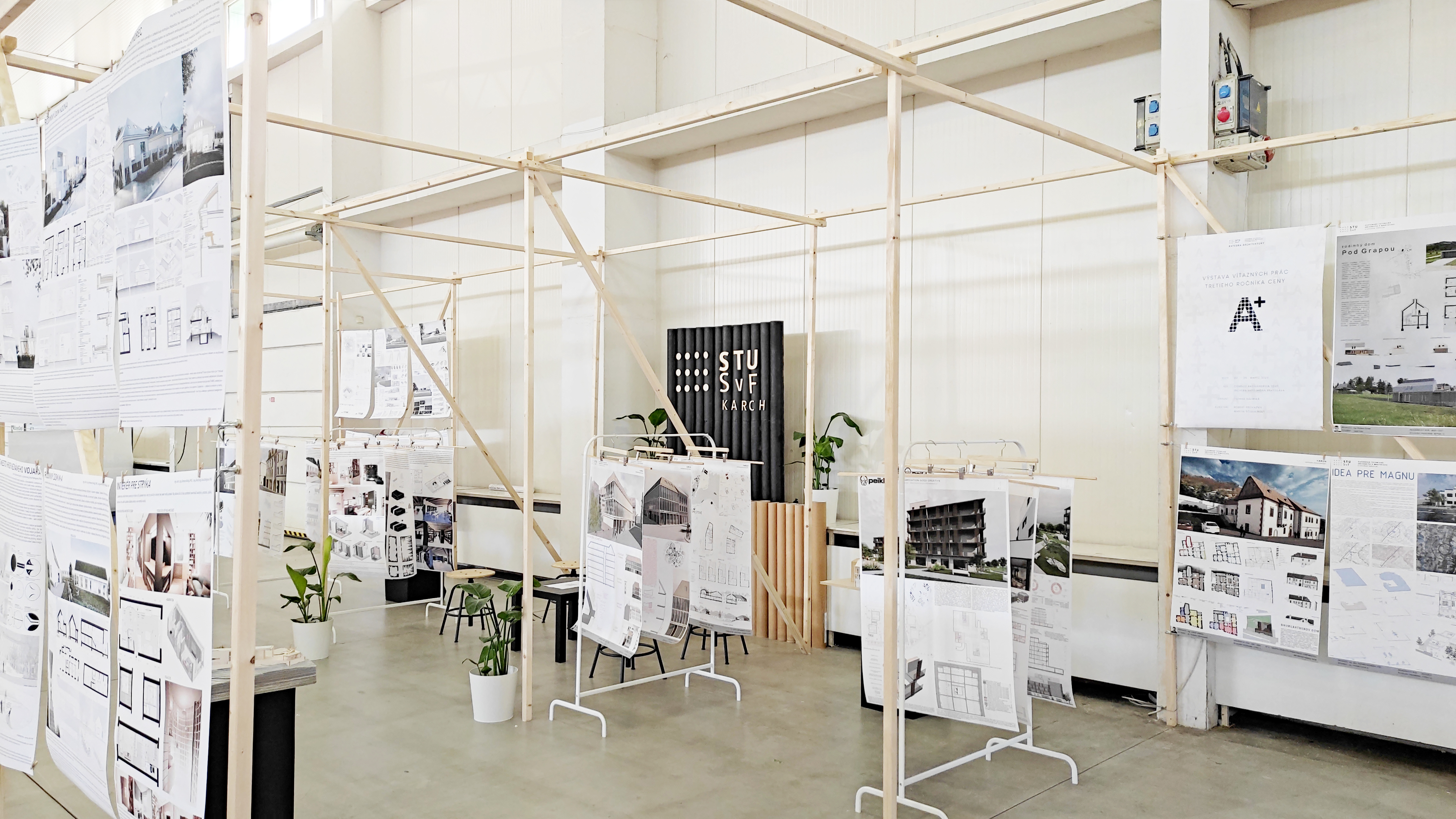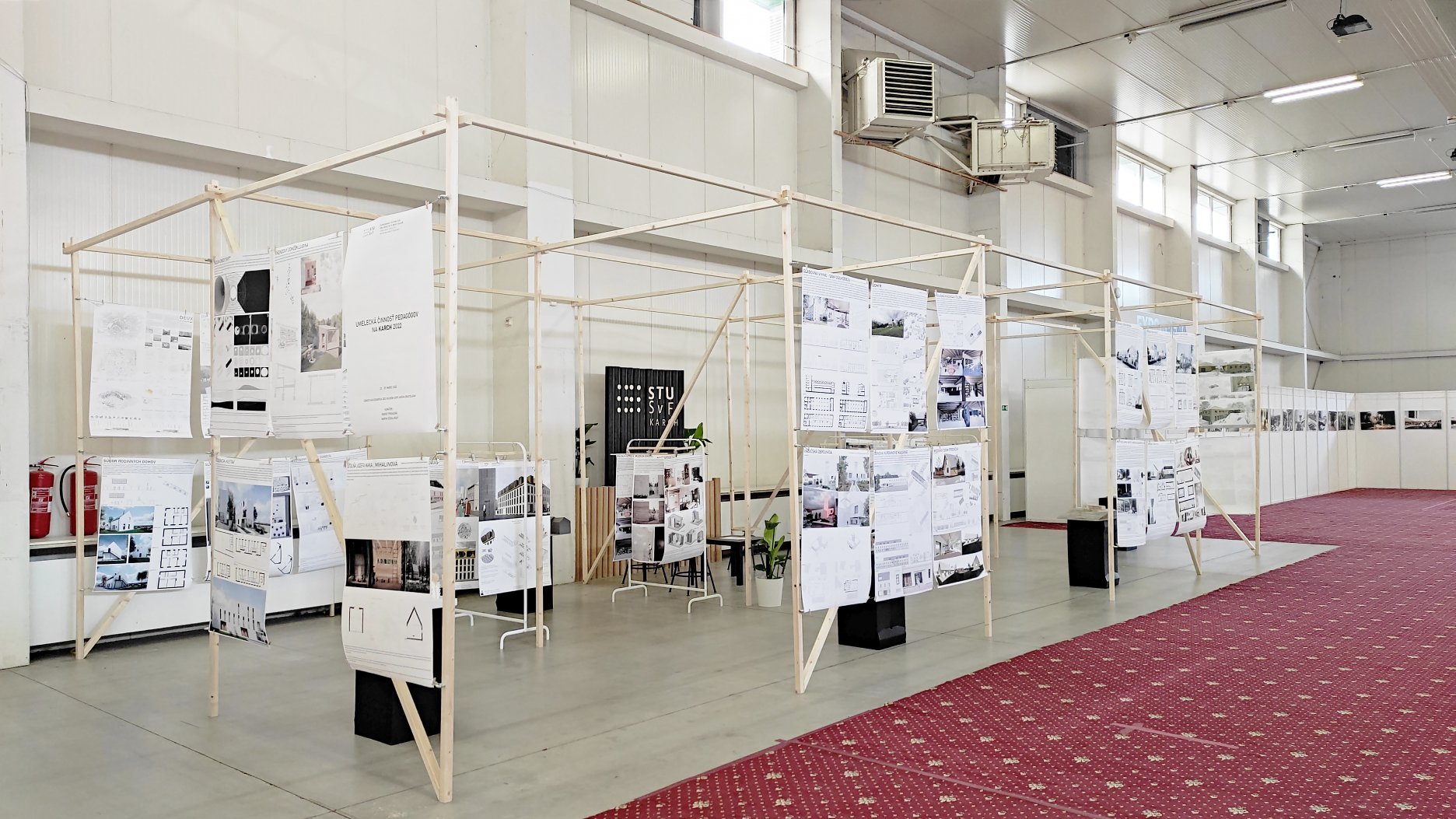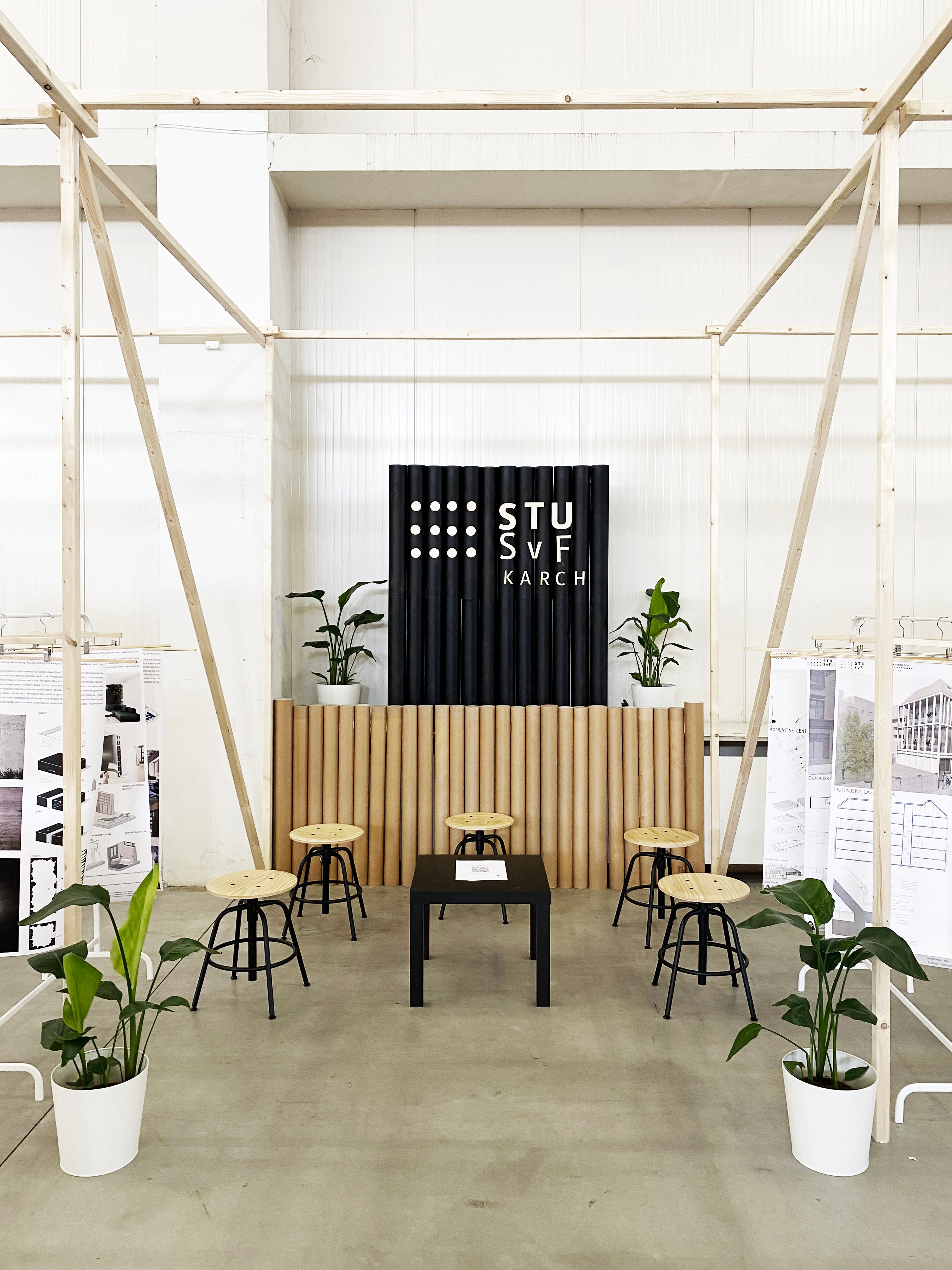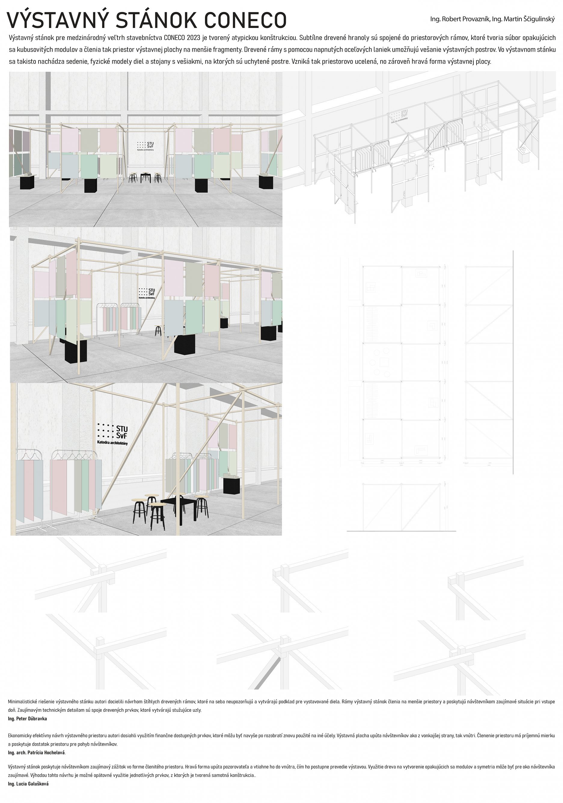Výstavný stánok pre medzinárodný veľtrh stavebníctva CONECO 2023 je tvorený atypickou konštrukciou. Subtílne drevené hranoly sú spojené do priestorových rámov, ktoré tvoria súbor opakujúcich sa kubusovitých modulov a členia tak priestor výstavnej plochy na menšie fragmenty. Drevené rámy s pomocou napnutých oceľových laniek umožňujú vešanie výstavných postrov. Vo výstavnom stánku sa takisto nachádza sedenie, fyzické modely diel a stojany s vešiakmi, na ktorých sú uchytené postre. Vzniká tak priestorovo ucelená, no zároveň hravá forma výstavnej plochy.