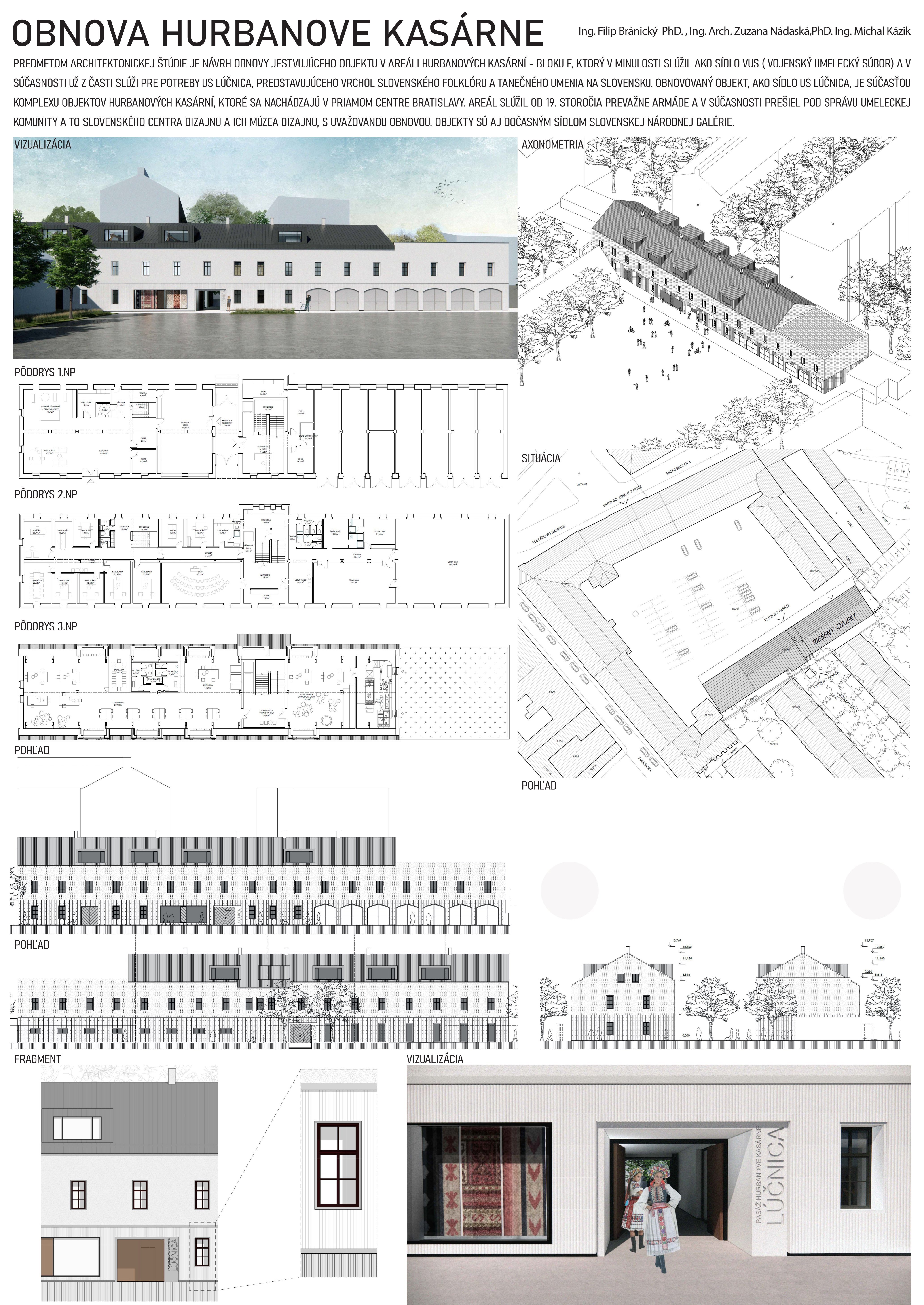 Hurbanovy kasárny svým významem a potenciálem nabízejí velkou šanci pomoci lokalitě kolem Kollárova náměstí, Obchodní a Mickiewiczovy ulice a celému propojení Starého a Nového Města v Bratislavě. Přestože projekt obnovy objektu v areálu Hurbanových kasáren neřeší celý areál, ale pouze dílčí blok F pro potřeby US Lúčnica, vychází z myšlenky vytvořit z kasáren nový atraktivní veřejný prostor v centru Bratislavy. Funkční náplň navrhované přestavby předmětného objektu s výraznějším otevřením fasády v parteru, je plně v souladu s touto koncepcí. Nádvoří bude sloužit jako významný sdílený městský veřejný prostor, ve kterém minimalistickou architekturu doplní tanečníci a umělci. Návrh obnovy objektu je zdařilý.