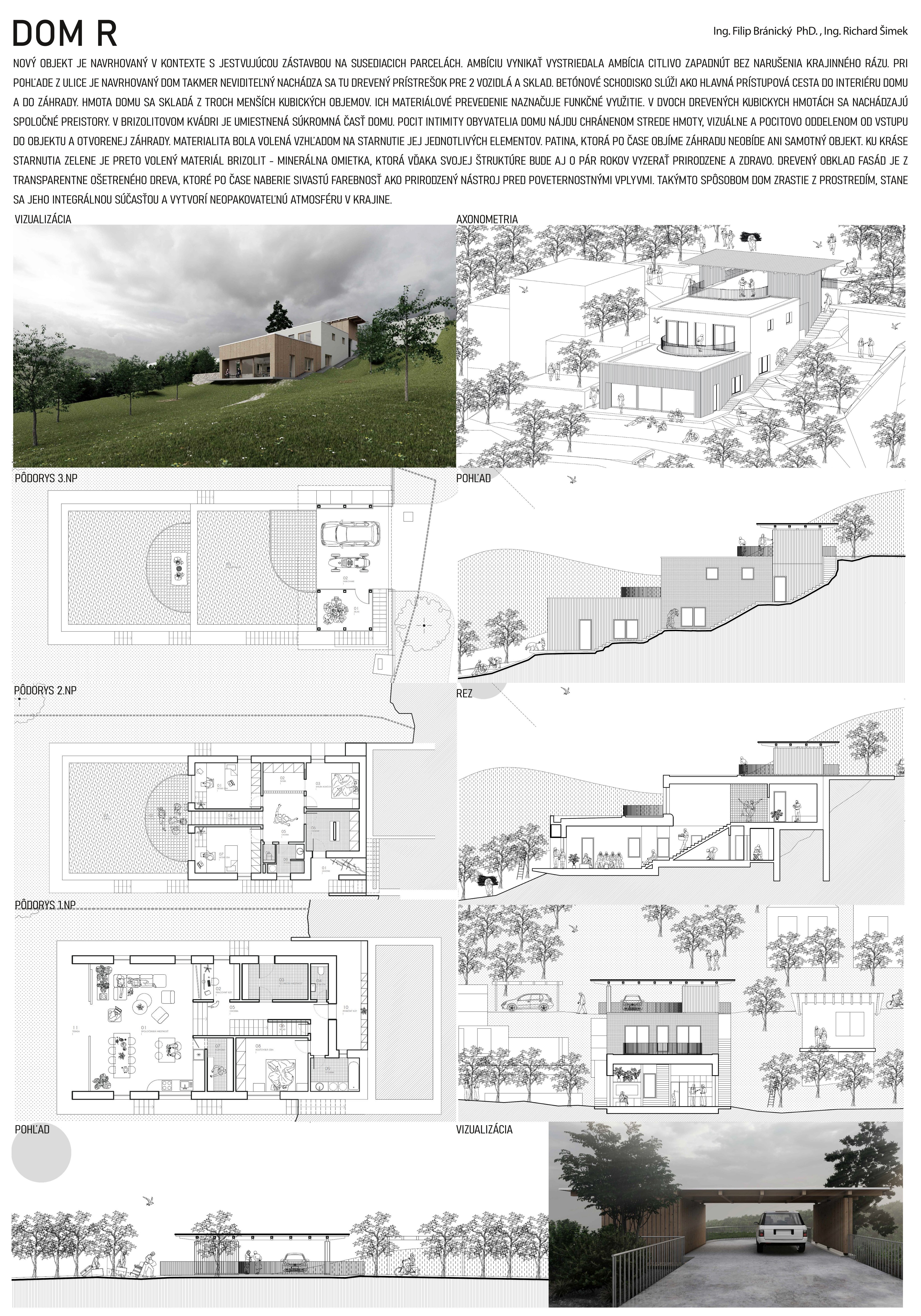 Rodinný dom R je determinovaný svahovitým pozemkom v malebnej zástavbe. Svojou formou vhodne nadväzuje na danosti terénu a z návrhu je čitateľný autorov zámer neinvazívnym spôsobom zasiahnuť do tohto kontextu. Objem je čitateľne rozdelený na 3 časti, prvou je ľahký drevený prístrešok ktorý sa jednak k ulici správa pokorne a zároveň ponecháva priehľad na krajinu. Ďalšie dva objemy sú racionálne rozdelená na nočnú časť s výstupom na terasu a spodnú dennú časť ktorá sa otvára celo-presklenou plochou do záhrady. Projekt svojou materialitou a jej vlastnosťami vhodne dopĺňa koncept zrásť časom s prostredím.