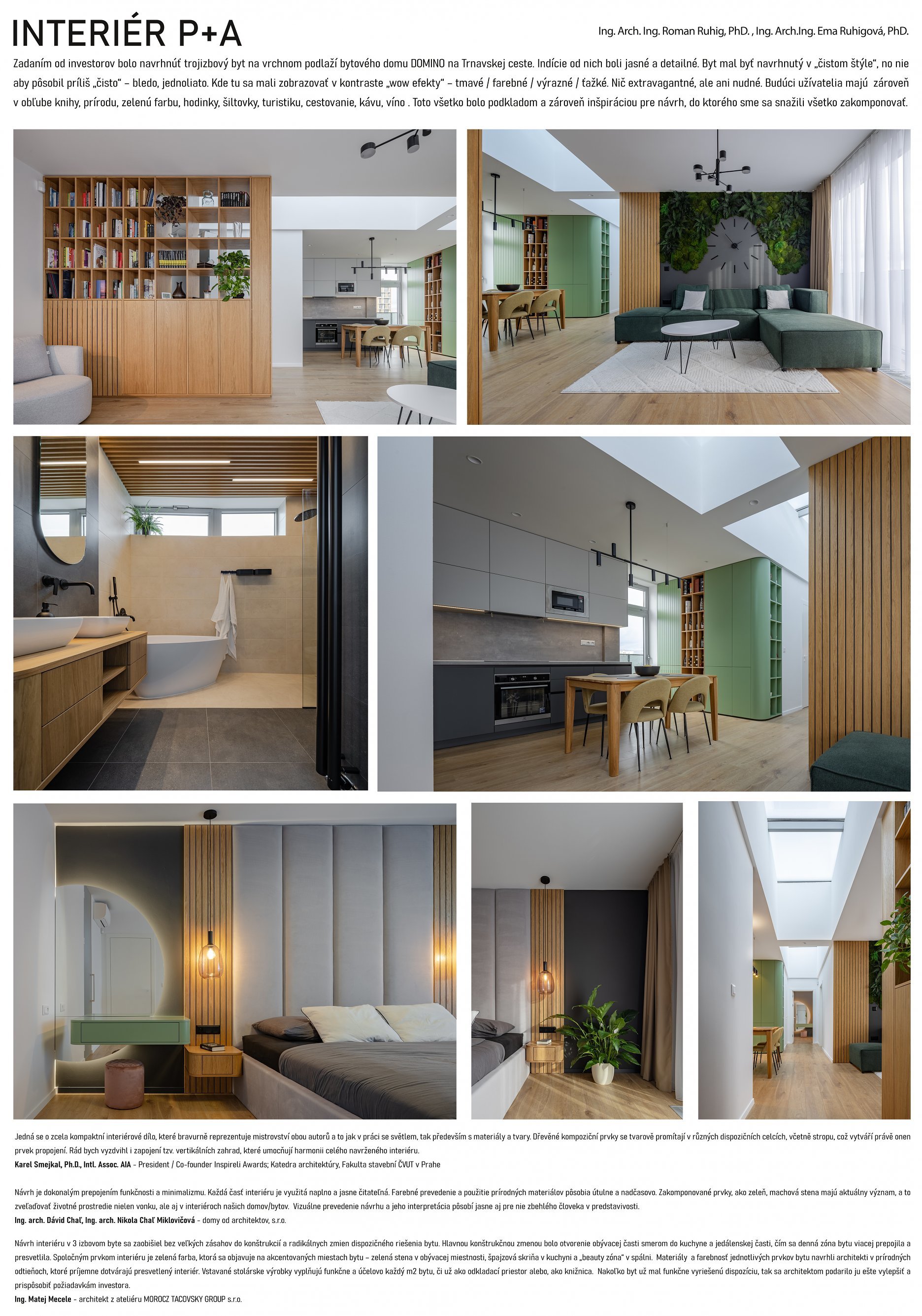 Spoločným prvkom interiéru je zelená farba, ktorá sa objavuje na akcentovaných miestach bytu – zelená stena v obývacej miestnosti, špajzová skriňa v kuchyni a „beauty zóna“ v spálni. Materiály a farebnosť jednotlivých prvkov bytu navrhli architekti v prírodných odtieňoch, ktoré príjemne dotvárajú presvetlený interiér. Vstavané stolárske výrobky vyplňujú funkčne a účelovo každý m2 bytu, či už ako odkladací priestor alebo, ako knižnica.