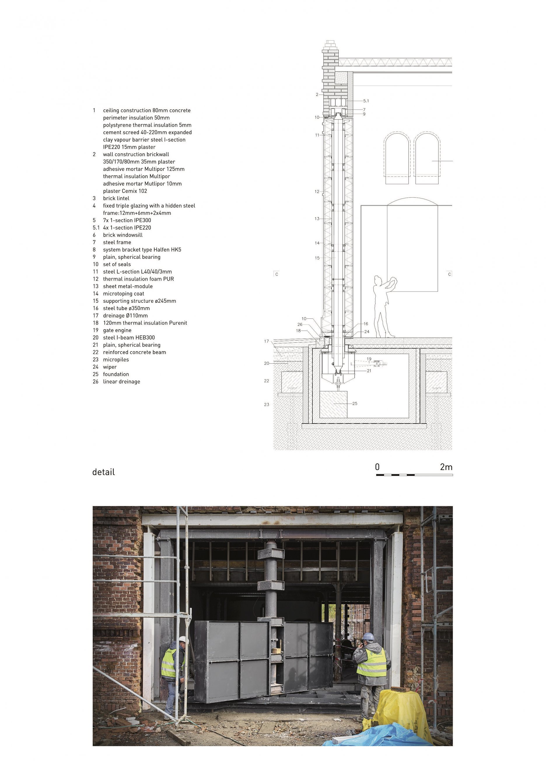 “Ruiny pamiatkovo chráneného objektu z konca 15. storočia prebudili architekti k novému životu. Jasne odlíšené nové konštrukcie nechávajú vyniknúť pôvodnú hrubú materialitu a zároveňa vytvárajú ochrannú obálku voči nepriazni počasia a umožňujú opätovné využitie stavby.”