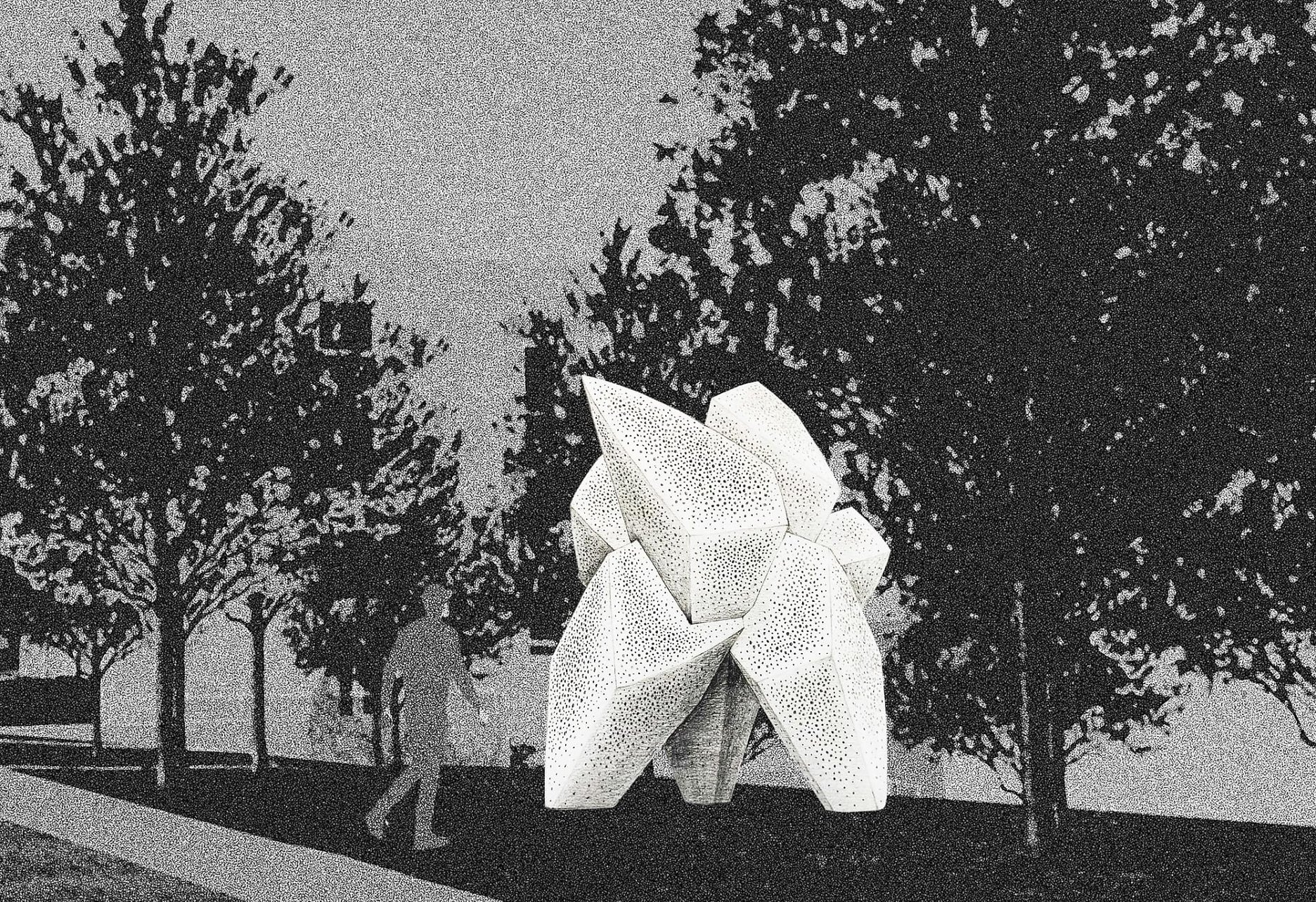 Tvar Krystalu je inspirován rostlým krystalem cukru, který vychází z kubické struktury. Další krásnou vlastností krystalu cukru je jeho průsvitnost a lom světla. Zvolila jsem tedy materiál, který se pokusí tento efekt vyvolat, beton s optickými vlákny. Optická vlákna povedou světlo skrz sochu. V noci Krystal svítí, díky zdroji světla zabudovanému v jeho útrobách."