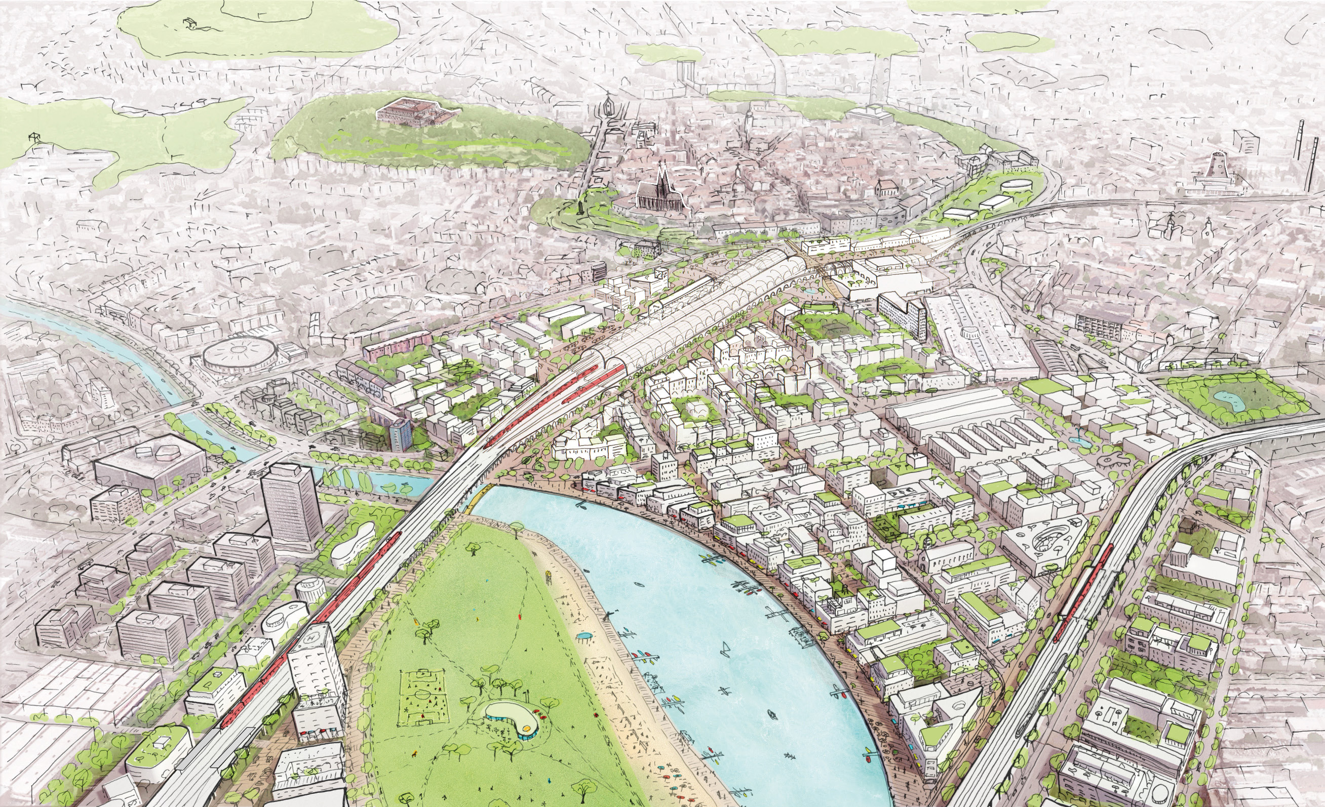 U návrhu umístěném na druhém místě porota ocenila zejména "jasnou strategii zvyšovaní hustoty okolí tak, aby ústřední park mohl zůstat relativně prázdný" a "příjemné měřítko městského veřejného prostoru před nádražím."