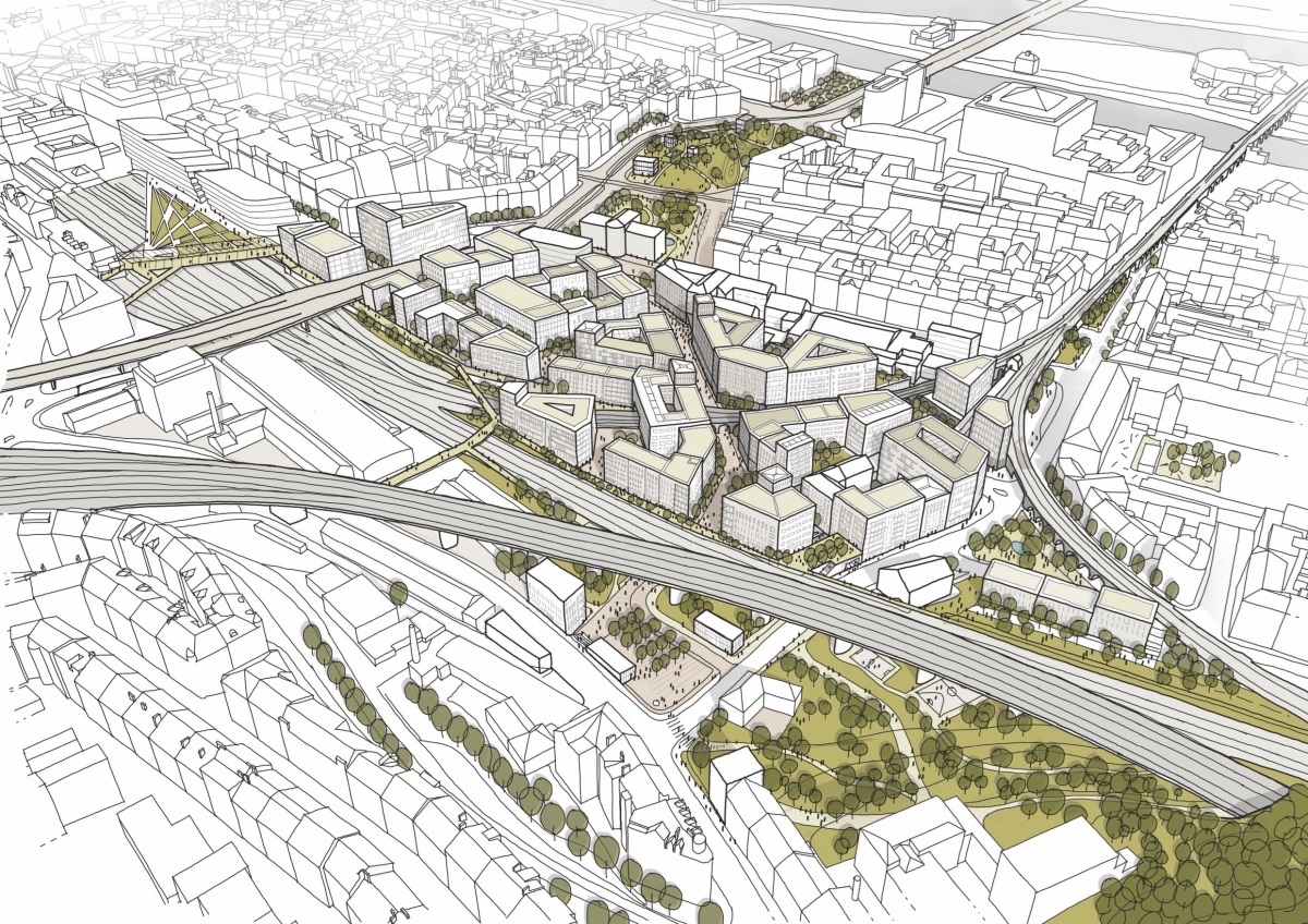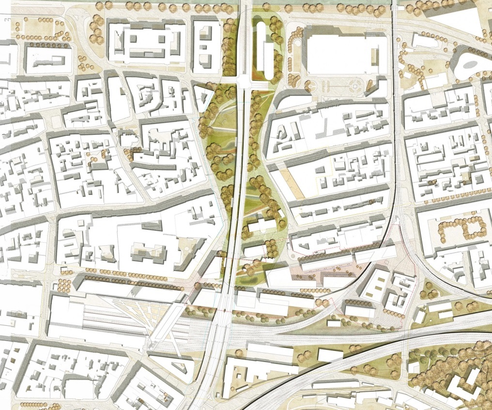 Kromě toho také navrhujeme přímo řešit jeho nevýhody a transformovat je na prvky s přidanou hodnotou pro novou zástavbu. Prodlužujeme nově upravovanou ulici Na Florenci ze západu dál skrz celou lokalitu, pokračujeme v městské zástavbě spojující západ s východem, propojujeme vlakové nádraží s novým autobusovým terminálem v živou uliční promenádu s obchody a kancelářemi, kde se lidé mohou procházet, setkávat, jezdit na kole, nakupovat a mnoho dalšího. Tato hlavní ulice je součástí souboru nových pěších promenád paralelních s kolejemi, které se stáčejí a sledují směrovaní kolejí a přivádějí lidi ze západu na severovýchod Prahy a naopak."