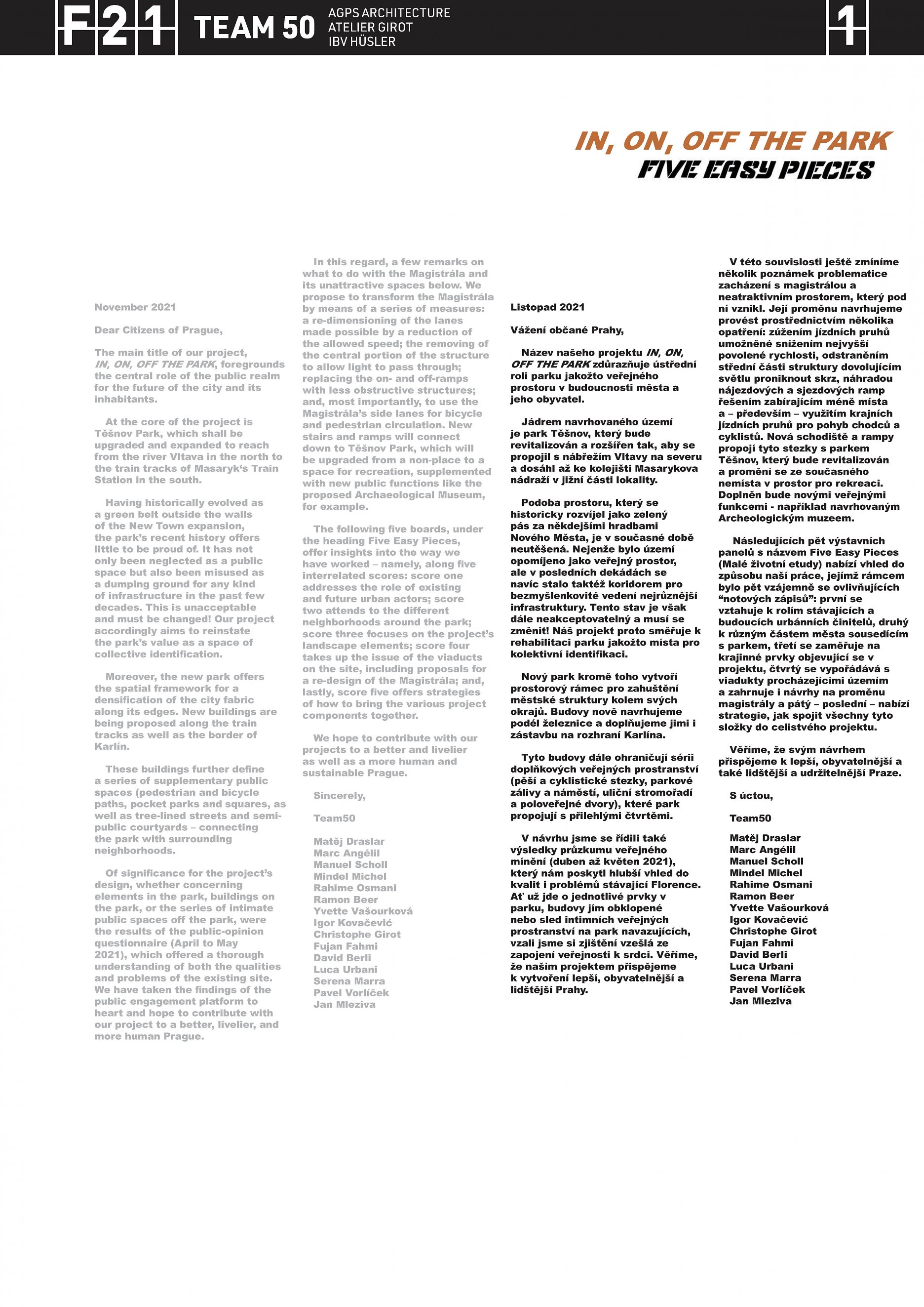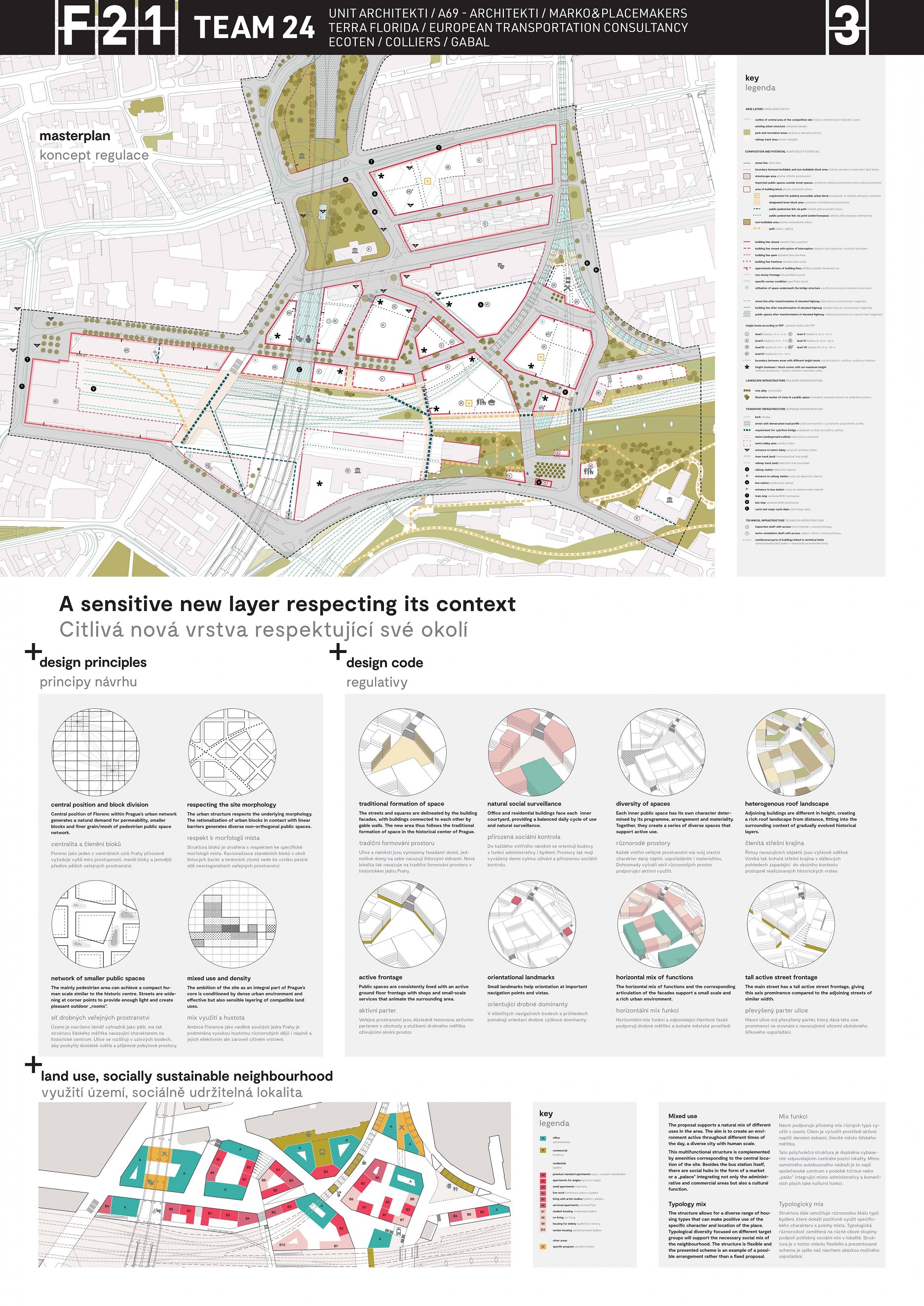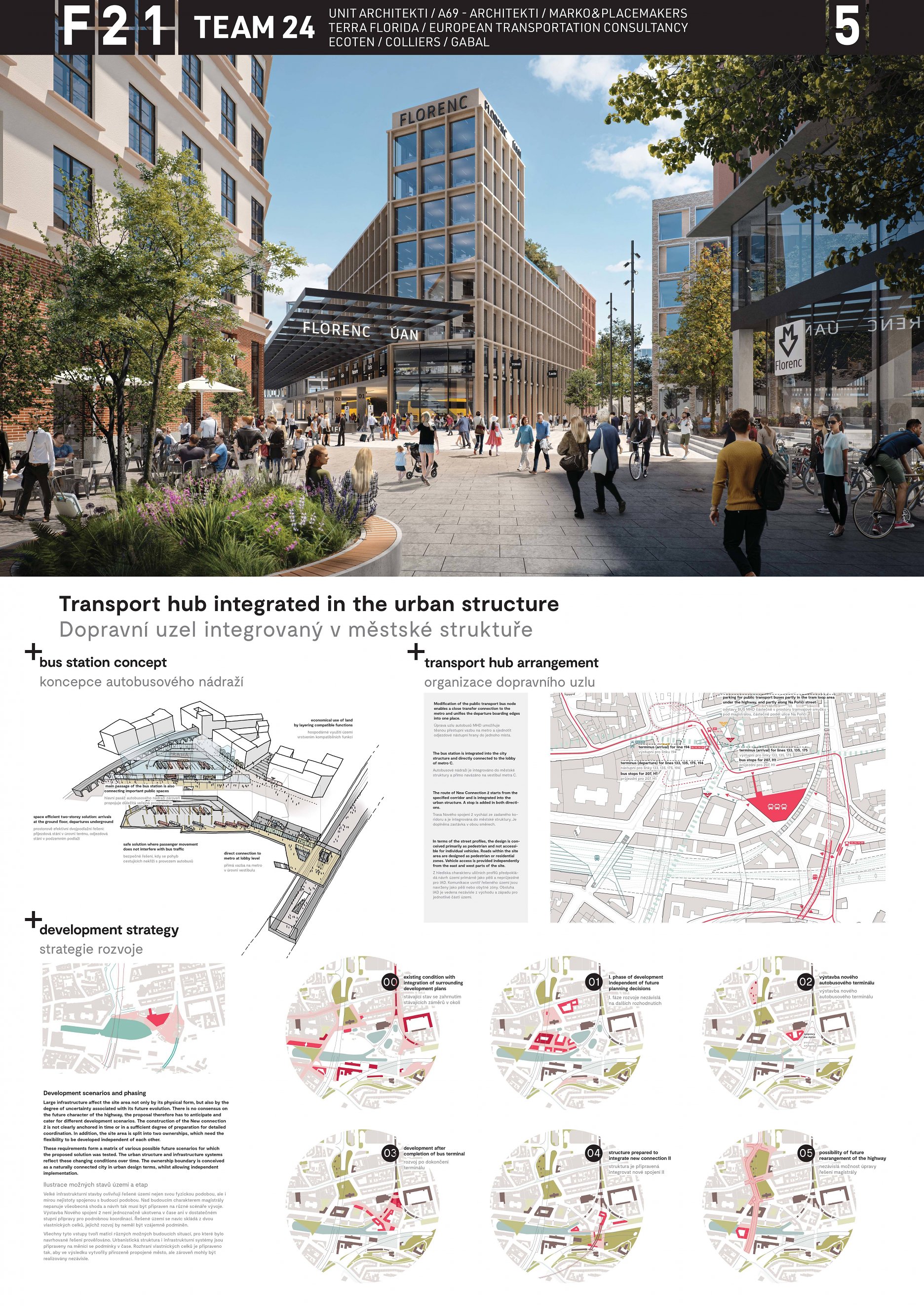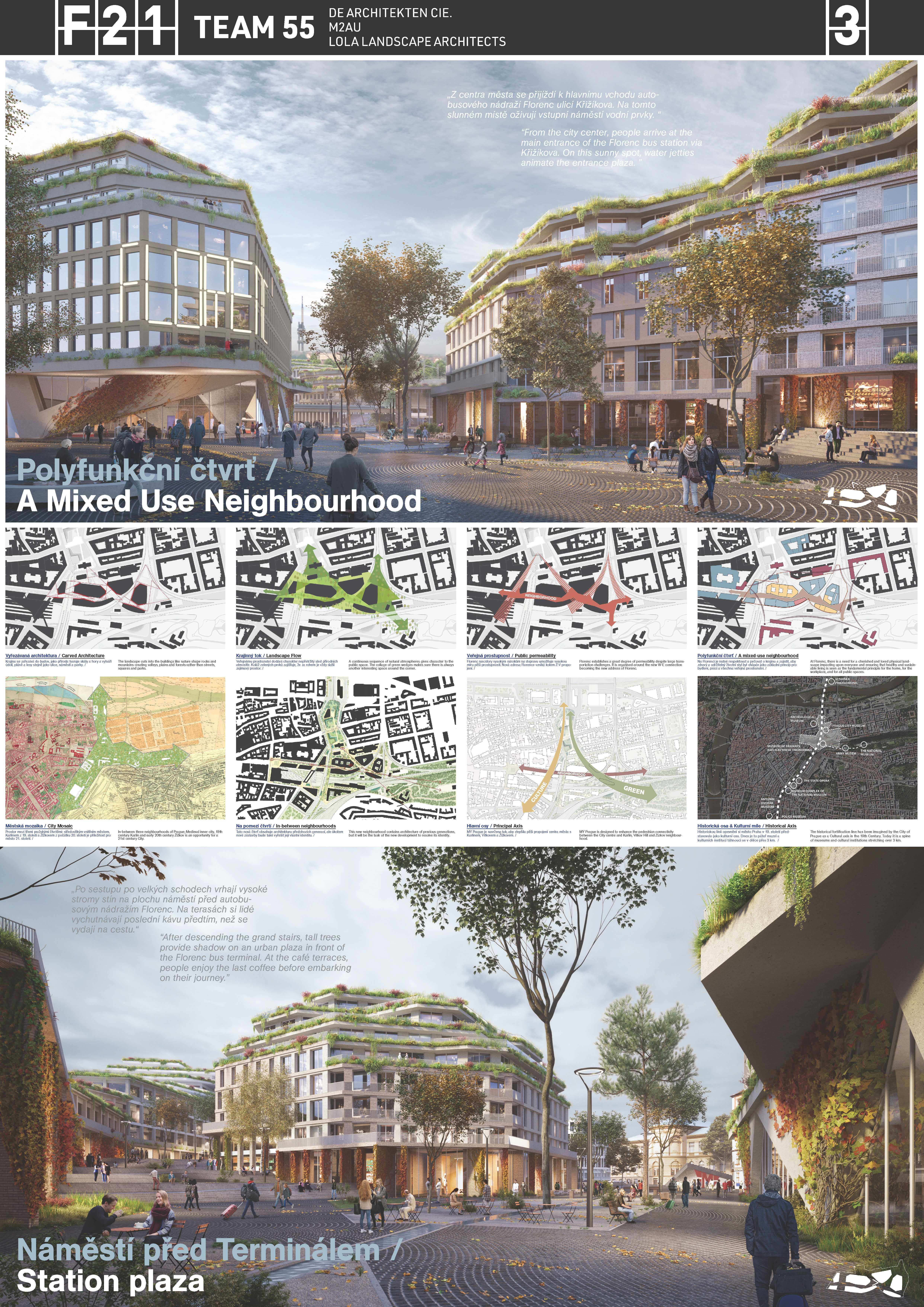"Navrhujeme, aby se Florenc 21 stala obojí, klíčovým infrastrukturním uzlem pro Prahu i živým městským centrem, nikoli urbánní černou dírou. Namísto prosazování myšlenky shora dolů s nesouvisejícími městskými organizacemi nebo s nevhodnou logikou, navrhujeme podpořit a vylepšit stávající kvality města a lokality – historické a prostorové kvality Negrelliho viaduktu, Těšnovský park na severu, novou výstavbu v lokalitě, blízkost centra města. Všechny tyto prvky přispívají a formují nový urbanistický rozvoj.