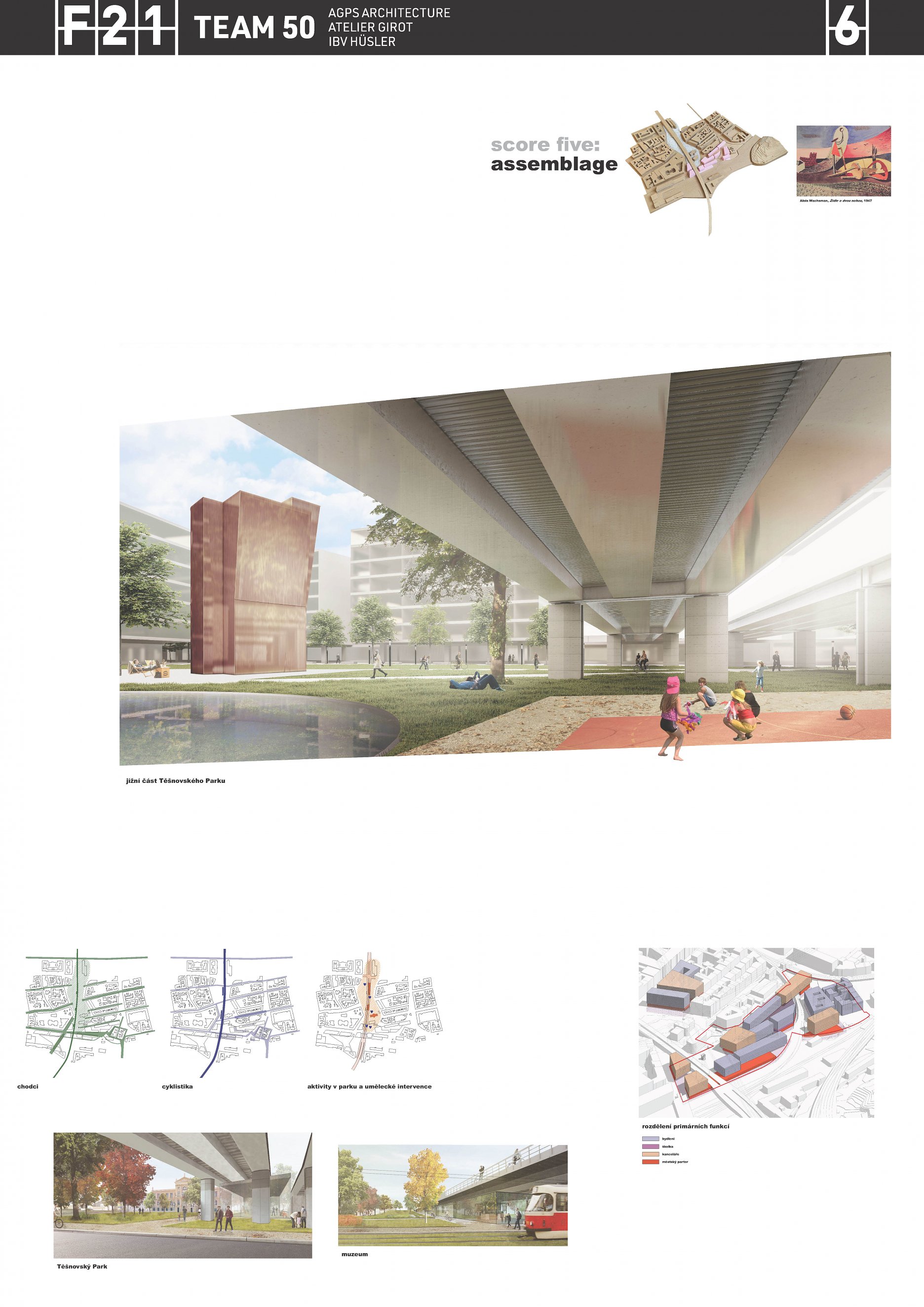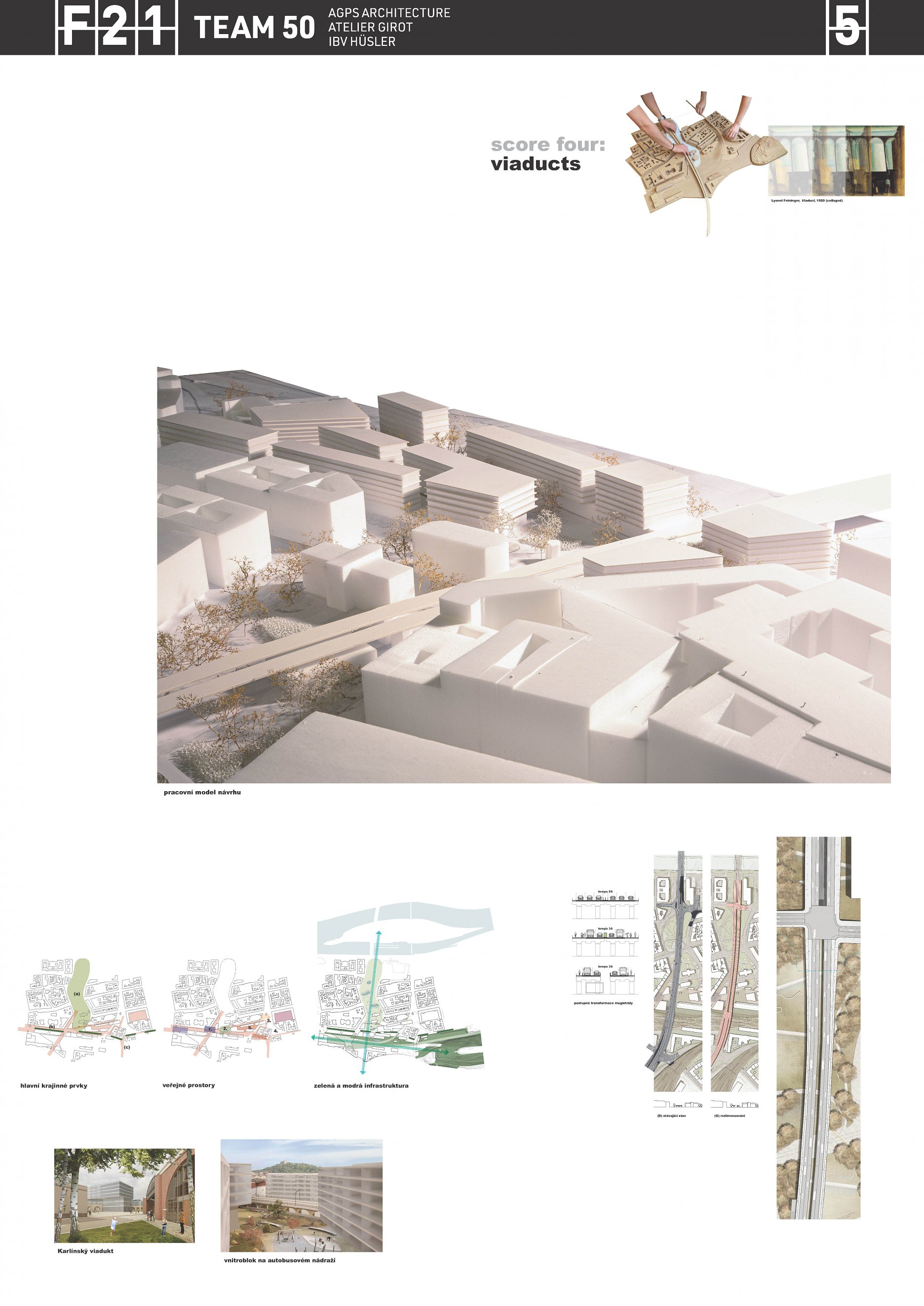 "Náš přístup je postaven na pěti vzájemně propojených tématech – notových zápisech – které vytvářejí libreto jak pro analytické uchopení stávajícího stavu (tedy pro rozbor území s jeho historickými vrstvami), tak i pro samotný návrh budoucího rozvoje lokality. První notový zápis pojmenovává hlavní urbánní činitele, které v řešeném území definují kostru města, jako například viadukt, park, dvůr, uliční fronta, muzeum, nádraží atd. Druhý notový zápis se zaměřuje na roli, kterou jednotlivé činitele hrají při definování urbánních celků v rámci pražské městské tkáně a tedy i v samotném návrhu. Některé z prvků patří spíše do Karlína, jiné do Nového Města a další k Masarykovu nádraží. Třetí notový zápis se zaměřuje na důležitost zelené a modré infrastruktury v rámci Prahy. V návrhu se tak uplatňují tři hlavní složky krajiny. Čtvrtý notový zápis je zasvěcen viaduktům, které jsou nedílnou součástí pražské dopravní infrastruktury a zároveň všechny roztínají existující městskou strukturu, ať už jde o památkově chráněný Negrelliho a Karlínský viadukt, plánovaný viadukt NS2 a v neposlední řadě i o přepracování severojižní magistrály jako svého druhu viaduktu. Pátý notový zápis se zaměřuje na asambláž nesourodých urbánních činitelů v území, která tkví například v interakci parku, sítě viaduktů, budov podél trati, stávajícího výdechu z metra apod. Výsledkem těchto vzájemných setkání jsou jedinečné městské prostory se specifickou atmosférou, jejichž cílem je proměnit současná nemísta v obytný veřejný prostor sloužící lidským setkáním."
