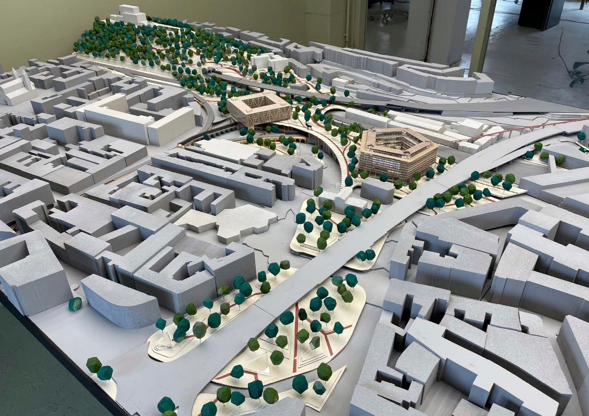 S využitím soklových objemů zastavěné formy se nad a pod infrastrukturou vlní zelená hůrka, spojující všechna oddělená místa mobility do velkého terminálu, který je finálním cílem sám o sobě.