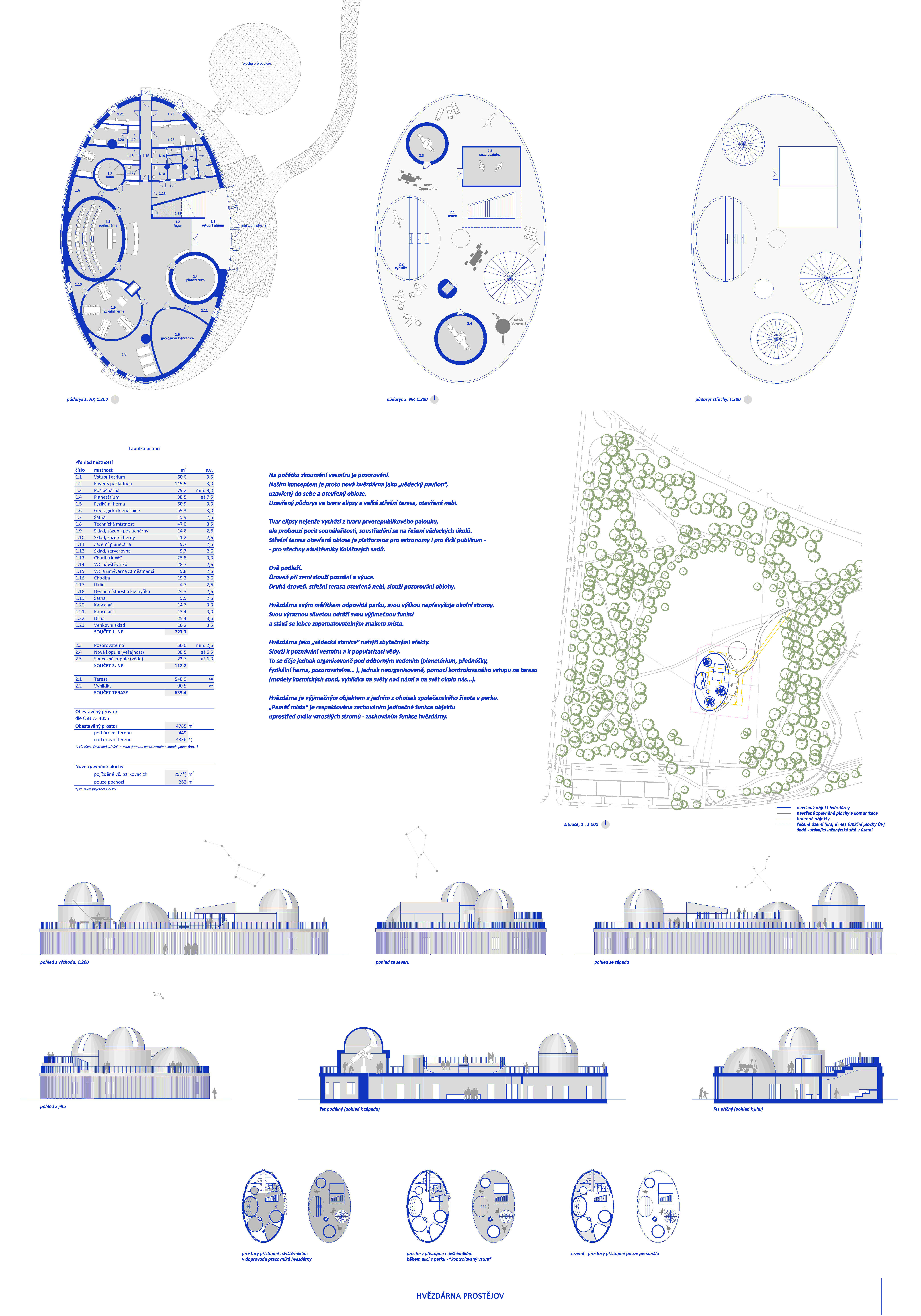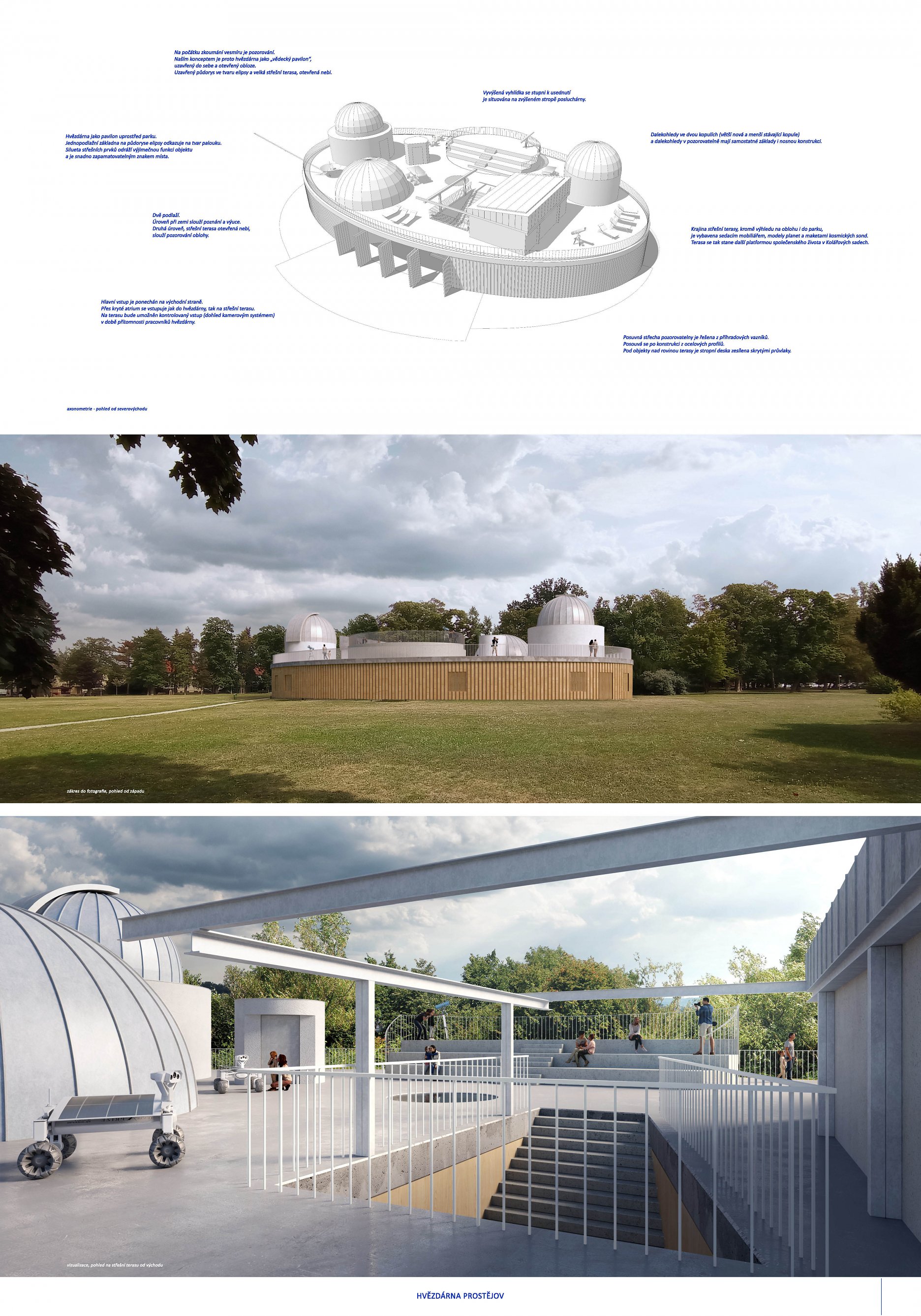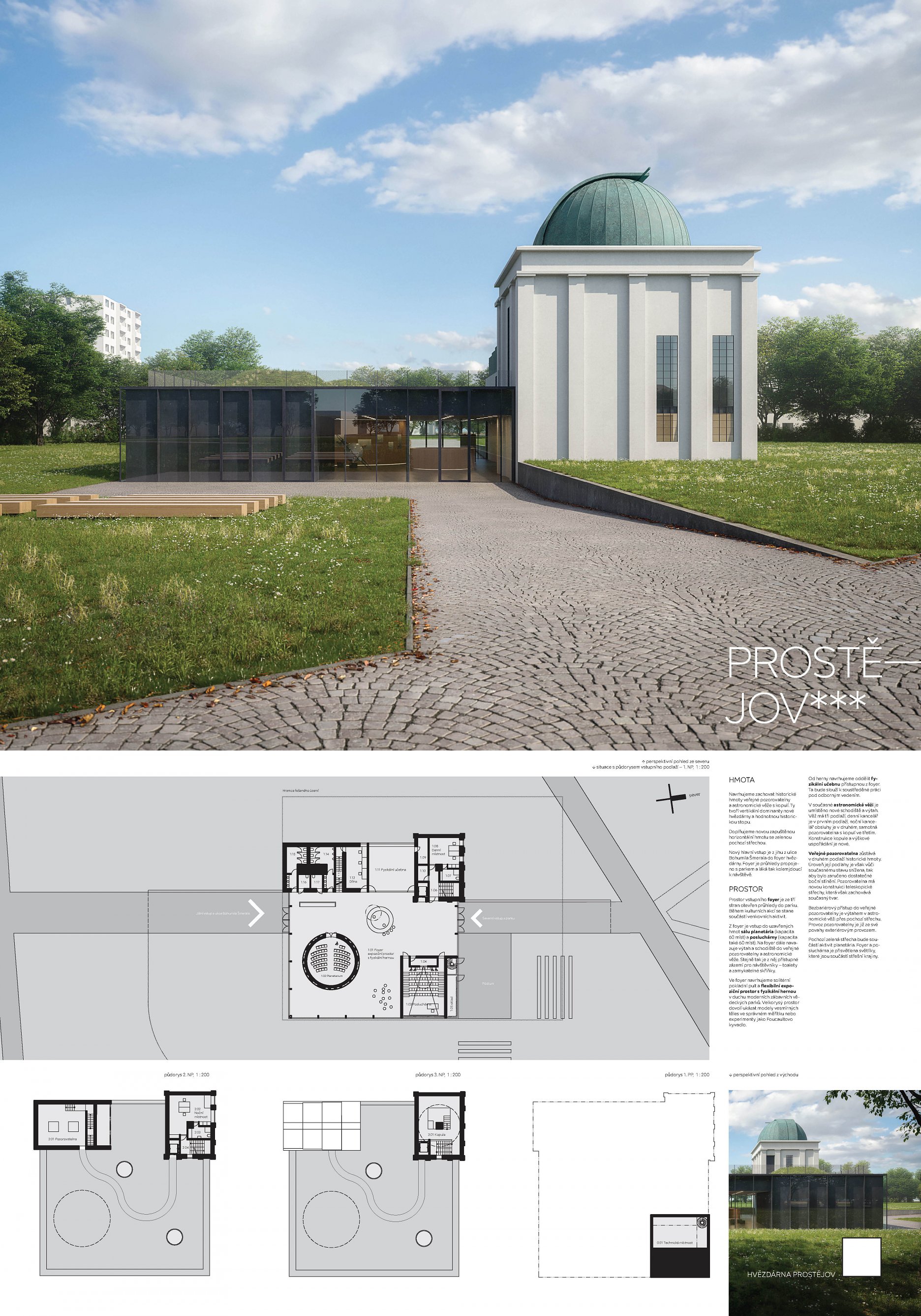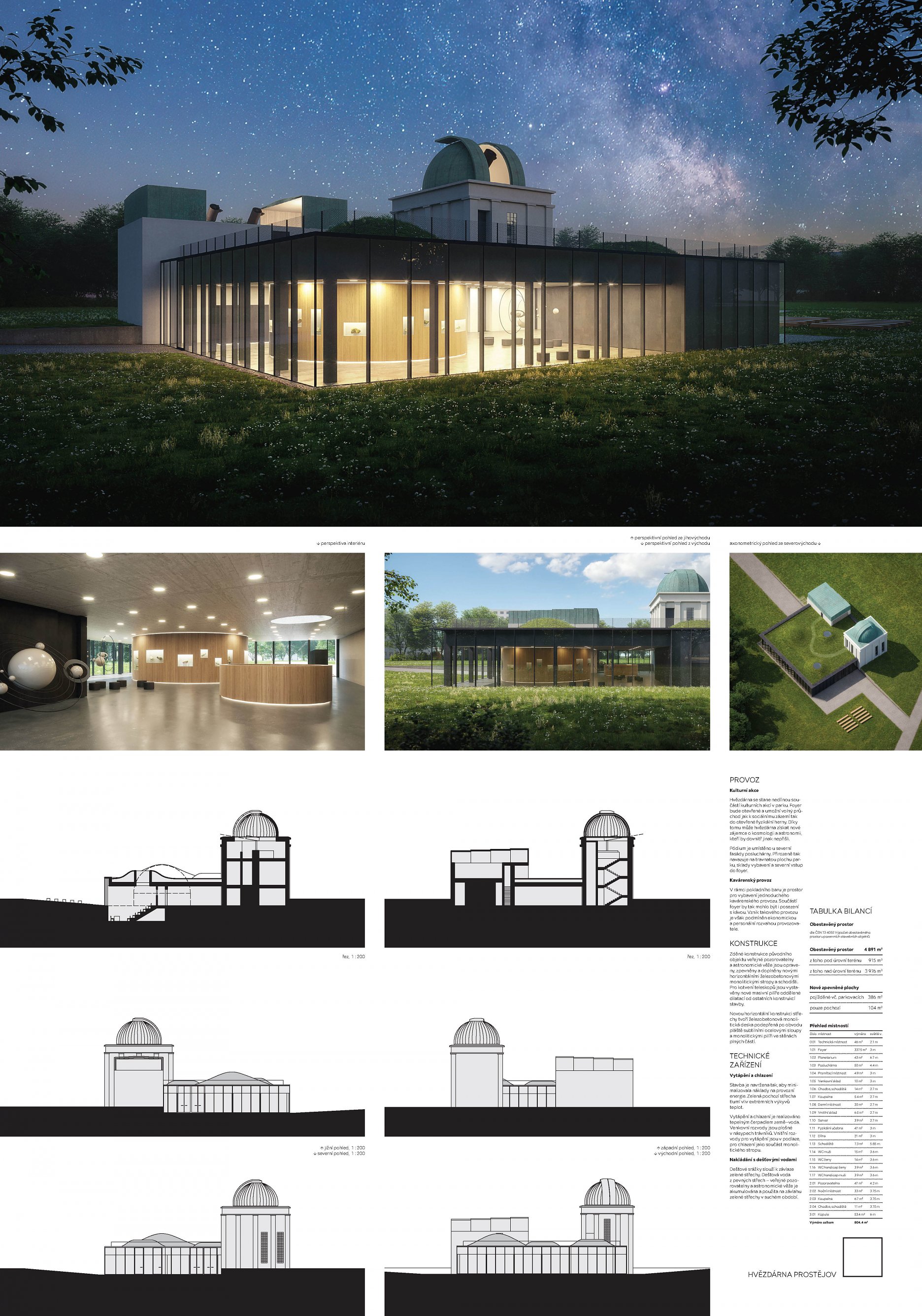 Předložený soutěžní návrh odstraňuje stávající vícepodlažní objekt hvězdárny v plném rozsahu. Na jeho místě vytváří přízemní podnož s prolamovaným akcentem nové pozorovací věže. Jednotlivé provozy jsou logicky uspořádány i zónovány. Prostřednictvím vloženého atria a světlíků celek reaguje na funkční požadavky jednotlivých prostor. Výsledný výraz objektu však oproti současnému stavu nepříliš přesvědčivě prezentuje reálnou funkční náplň, k čemuž přispívá i schematické řešení celkové situace.