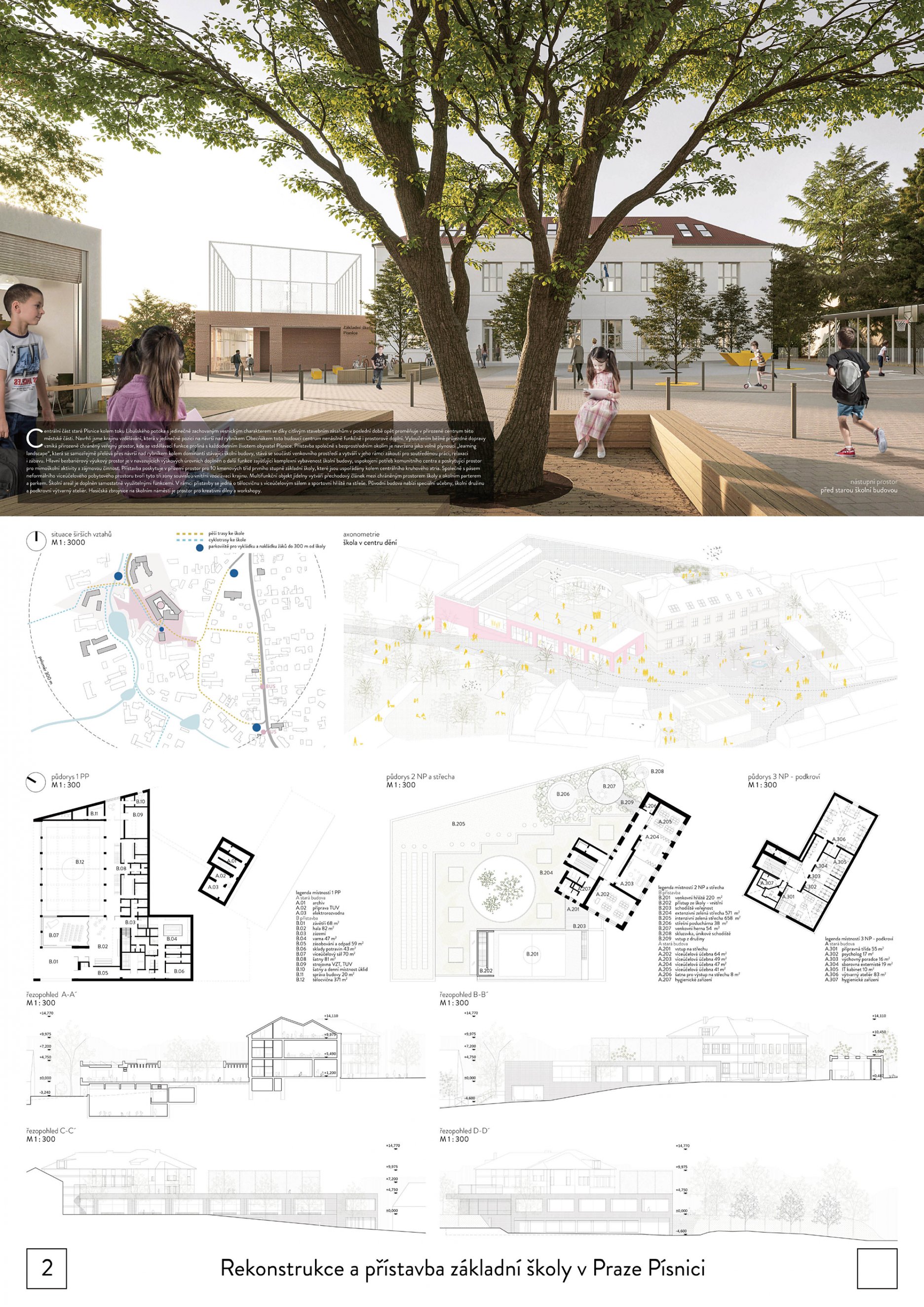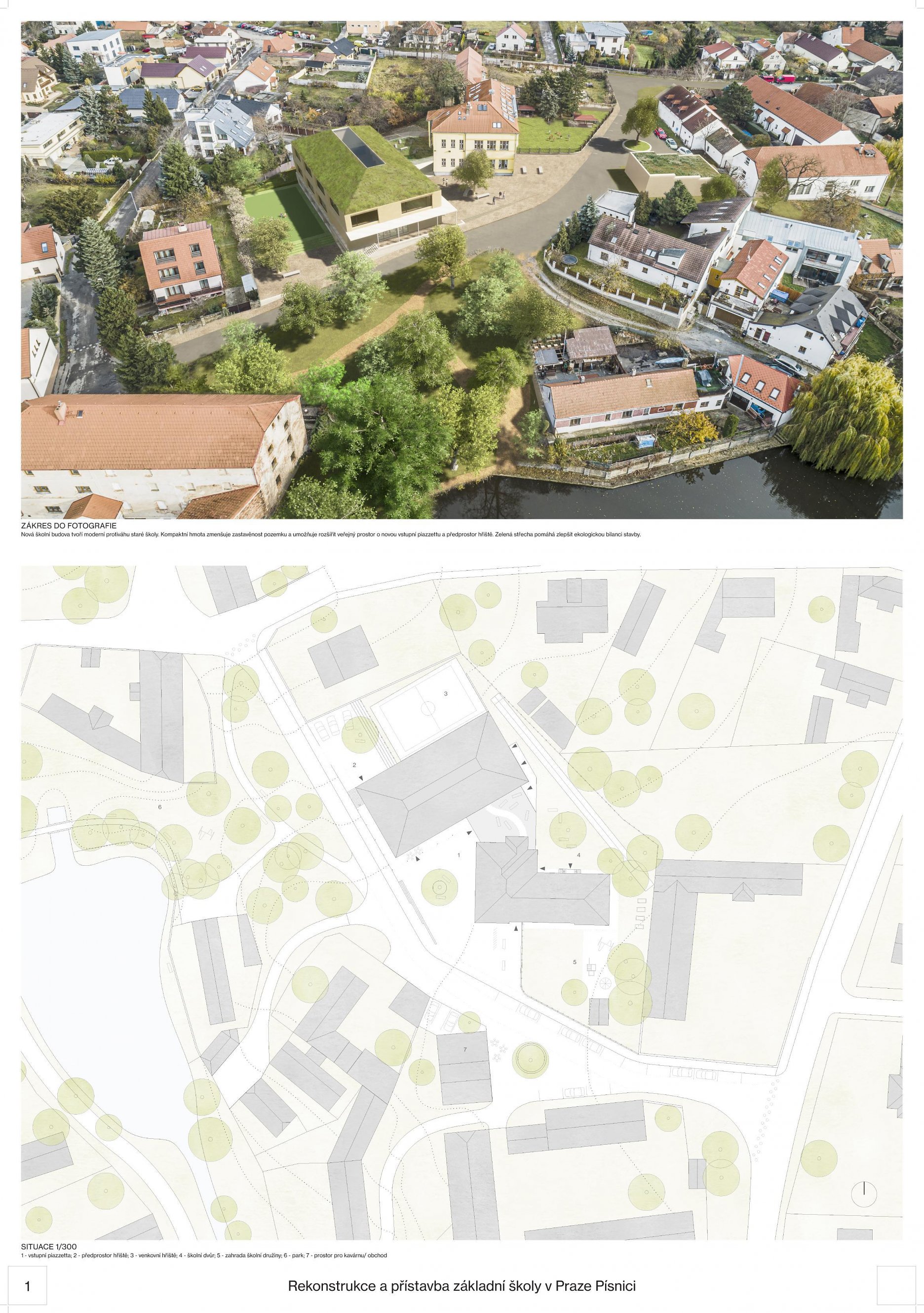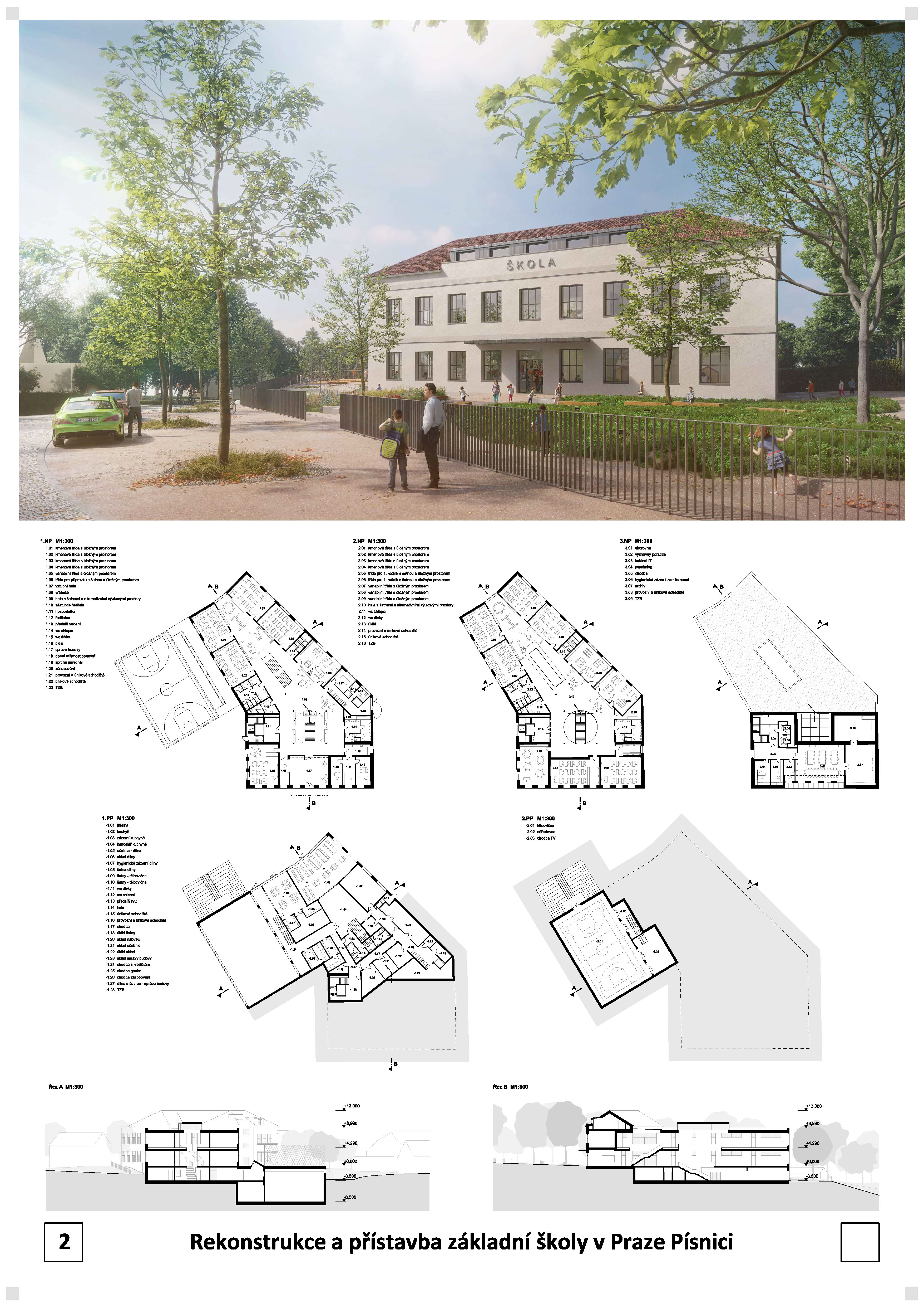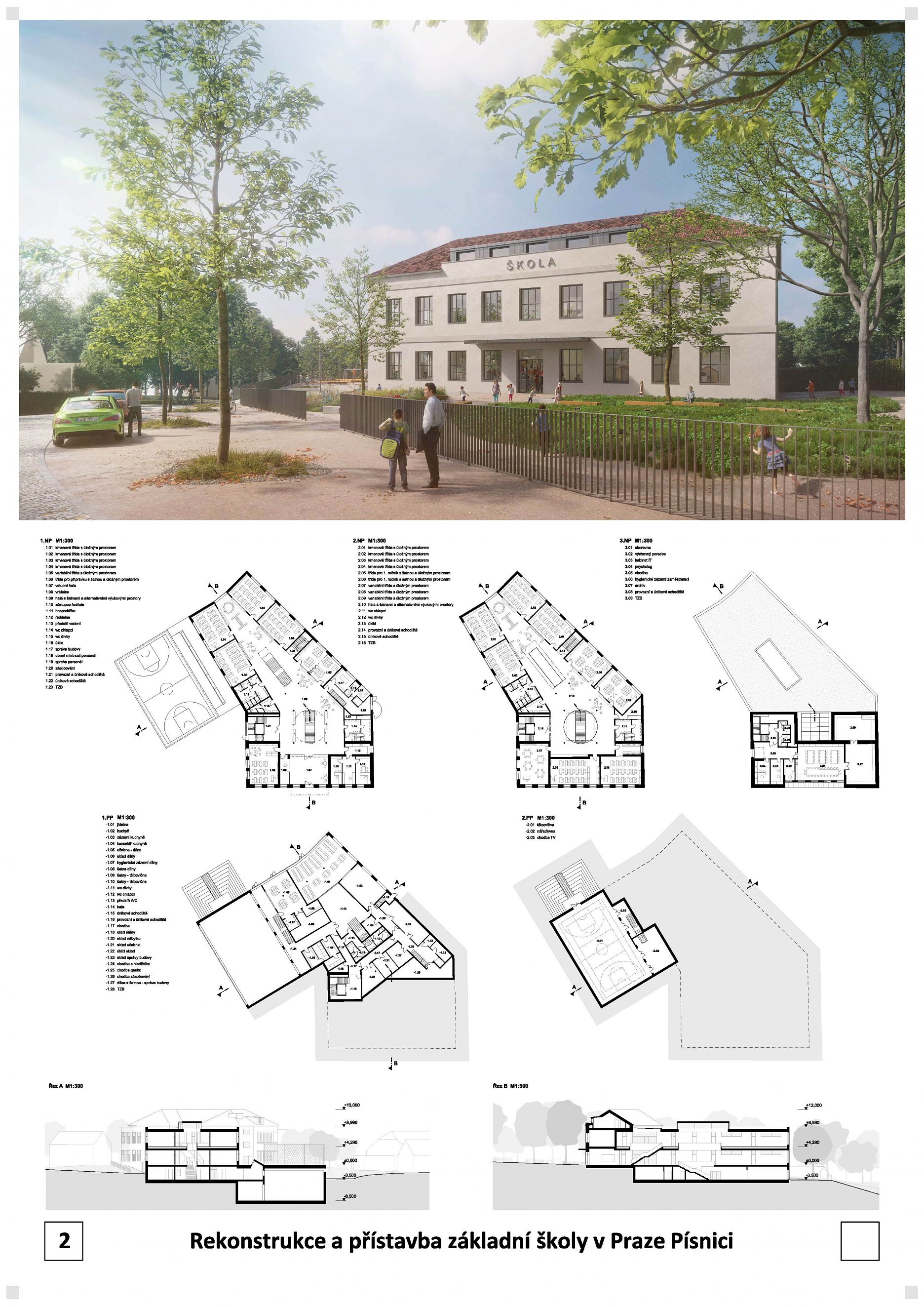 Stará škola, Nová škola. Dva stejné domy a přece tak jiné. Figura nové budovy měřítkem i umístěním reaguje na charakter rostlé struktury staré Písnice. Škola si drží hlavní vstup z návsi, čímž přispívá k vitalizaci nově budovaného komunitního prostoru obce. Očištěná průčelní fasáda Staré školy vítá své uživatele a návštěvníky skrze doplněné a upravené vzdušné vstupní prostory. Formace a zvolená podlažnost budov si drží komfortní odstup od plotu a maximalizuje plochu zahrady. Soubor školních budov mate tělem. Zvenčí nedává tušit vnitřní prostorovou rozmanitost. Příroda prostupuje celým areálem přes extenzivní a intenzivní zelené střechy do nitra školy. Nabízíme přehledné společné multifunkční prostory, kde si každý najde své – žáci i učitelé, dělitelné vzdušné třídy, nový optimalizovaný krov Staré školy, tělocvičnu i jídelnu přístupnou z úrovně terénu či různorodou zahradu s řadou specifických míst.