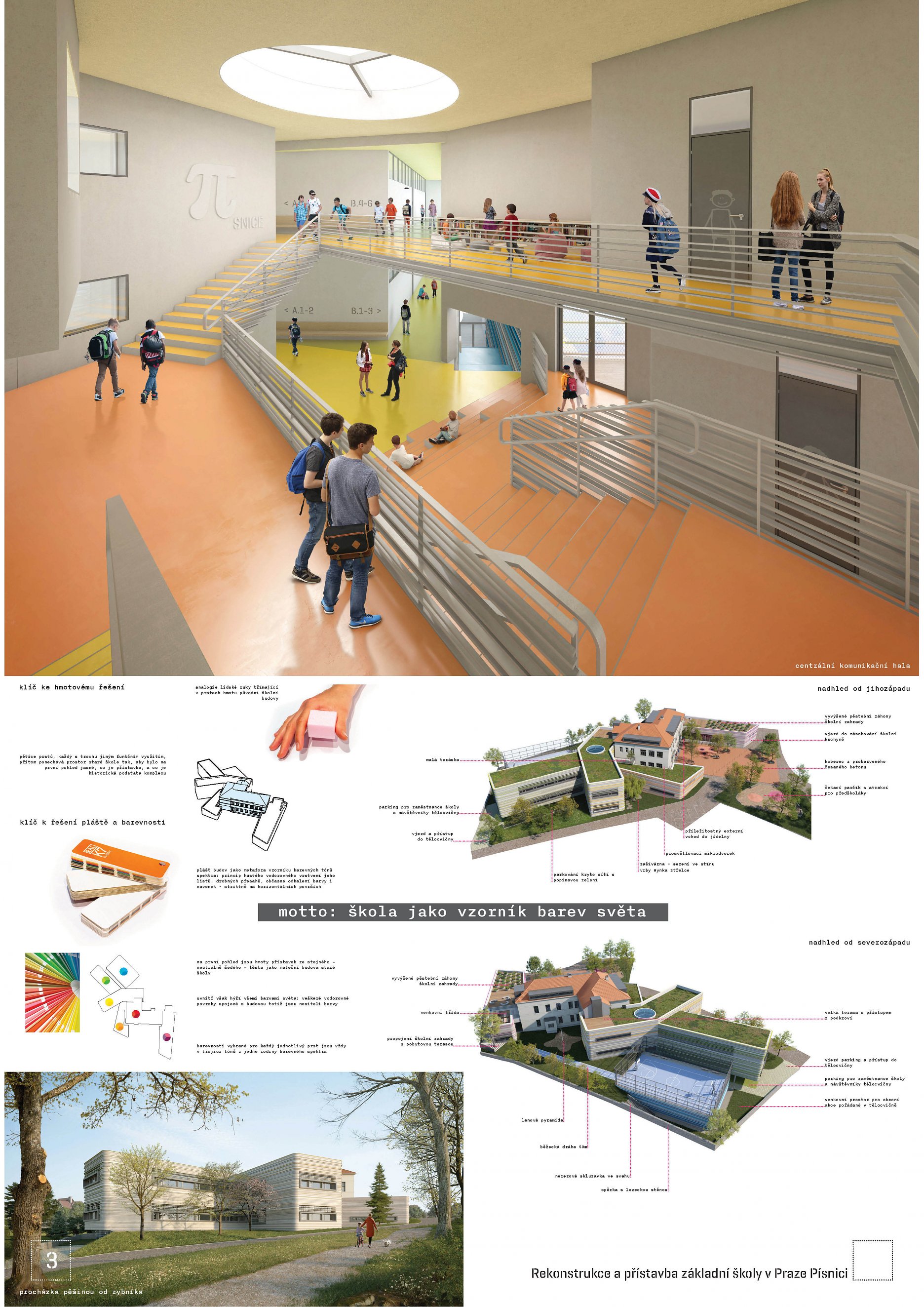 Genius loci historické školy a jejího okolí – centrum Písnice. Respekt ke stávající škole – znovunalezení důstojného výrazu budovy, rehabilitace dominantní pozice školy jako centra obce. Citlivé doplnění nové přístavby. Nádvoří s Amfiteátrem. Tělocvična oddělena, přesto součástí celku. Uvolněná, vstřícná atmosféra pro žáky i ostatní obyvatele. Škola jako společenské a sportovní centrum. Schola ludus.