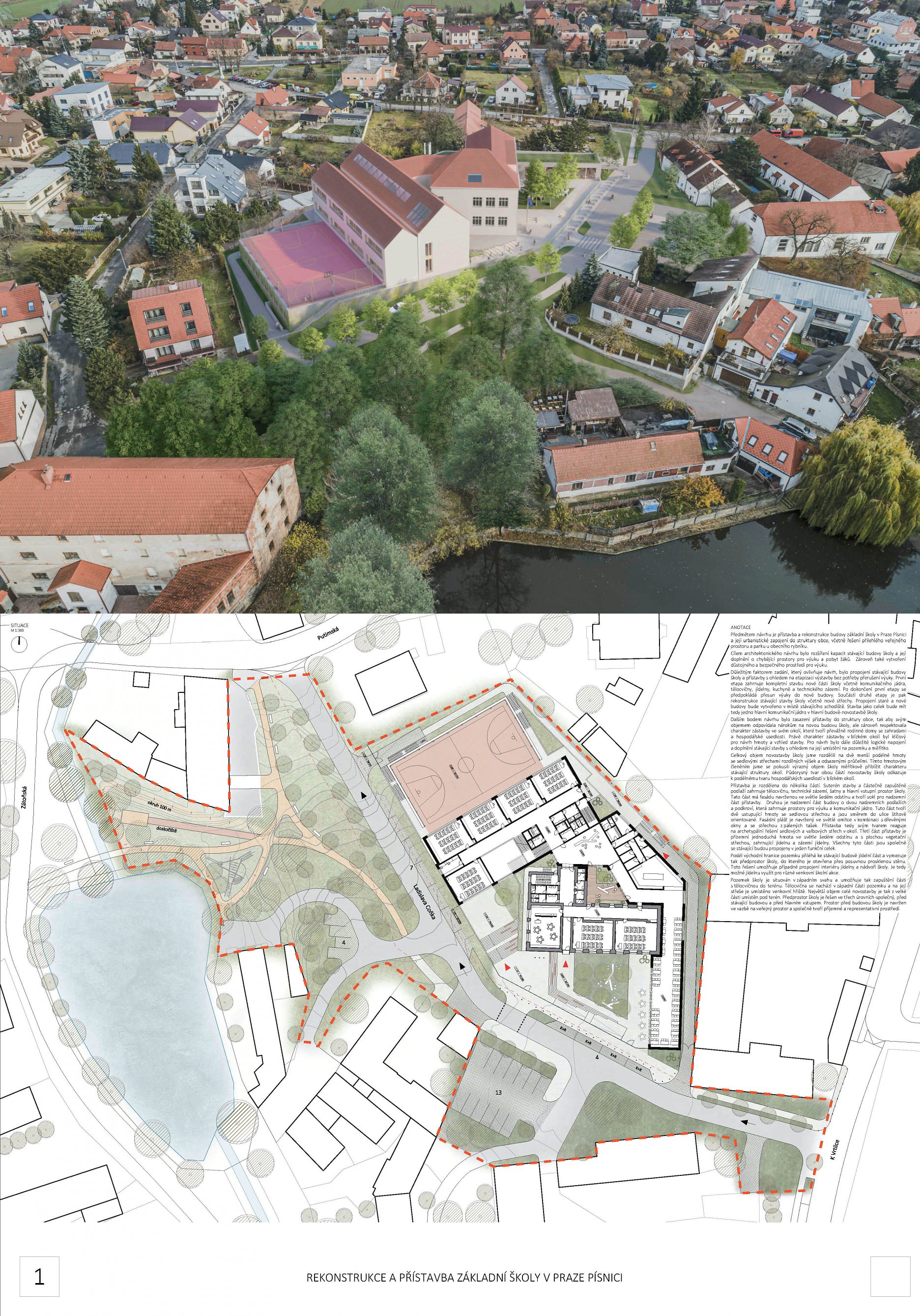Centrální část staré Písnice kolem toku Libušského potoka s jedinečně zachovaným vesnickým charakterem se díky citlivým stavebním zásahům v poslední době opět proměňuje v přirozené centrum této městské části. Navrhli jsme krajinu vzdělávání, která v jedinečné pozici na návrší nad rybníkem Obecňákem toto budoucí centrum přirozeně funkčně i prostorově doplní. Vyloučením běžné průjezdné dopravy vzniká přirozeně chráněný veřejný prostor, kde se vzdělávací funkce prolíná s každodenním životem obyvatel Písnice. Přístavba společně s bezprostředním okolím je navržena jako volně plynoucí „learning landscape“, která se samozřejmě přelévá přes návrší nad rybníkem kolem dominantní stávající školní budovy, stává se součástí venkovního prostoru a vytváří v jeho rámci zákoutí pro soustředěnou práci, relaxaci i zábavu.