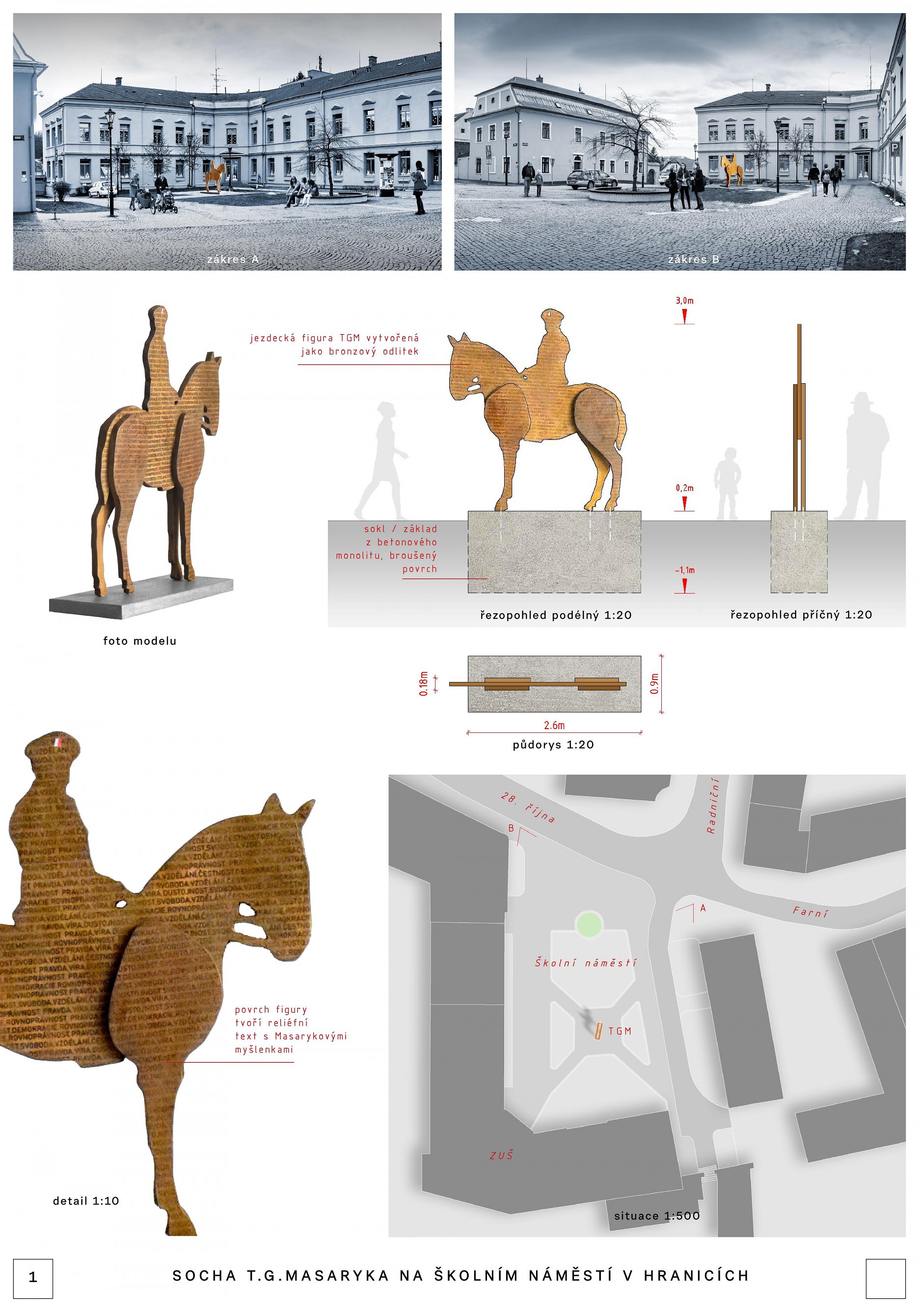Ako najvhodnejší bol vybraný návrh jazdeckej sochy Ladislava Sorokáča a Ondřeja Tučka, ktorý vhodne reaguje na charakter daného priestoru a súčasne iba minimálne zasahuje do partera, čo necháva priestor budúcim úpravám. Bronzová jazdecká socha je umiestnená uprostred parkovej úpravy námestia a je orientovaná tak, aby bola jasne viditeľná a zreteľná ako z Farnej, tak z Radničnej ulice. Moderné poňatie sochy, zjednodušené na nezameniteľnú plošnú siluetu štátnika (vytvorenú na základe fotografie), je súčasnou interpretáciou klasického jazdeckého pomníka. Dielo by malo stáť 3,5 milión korún.