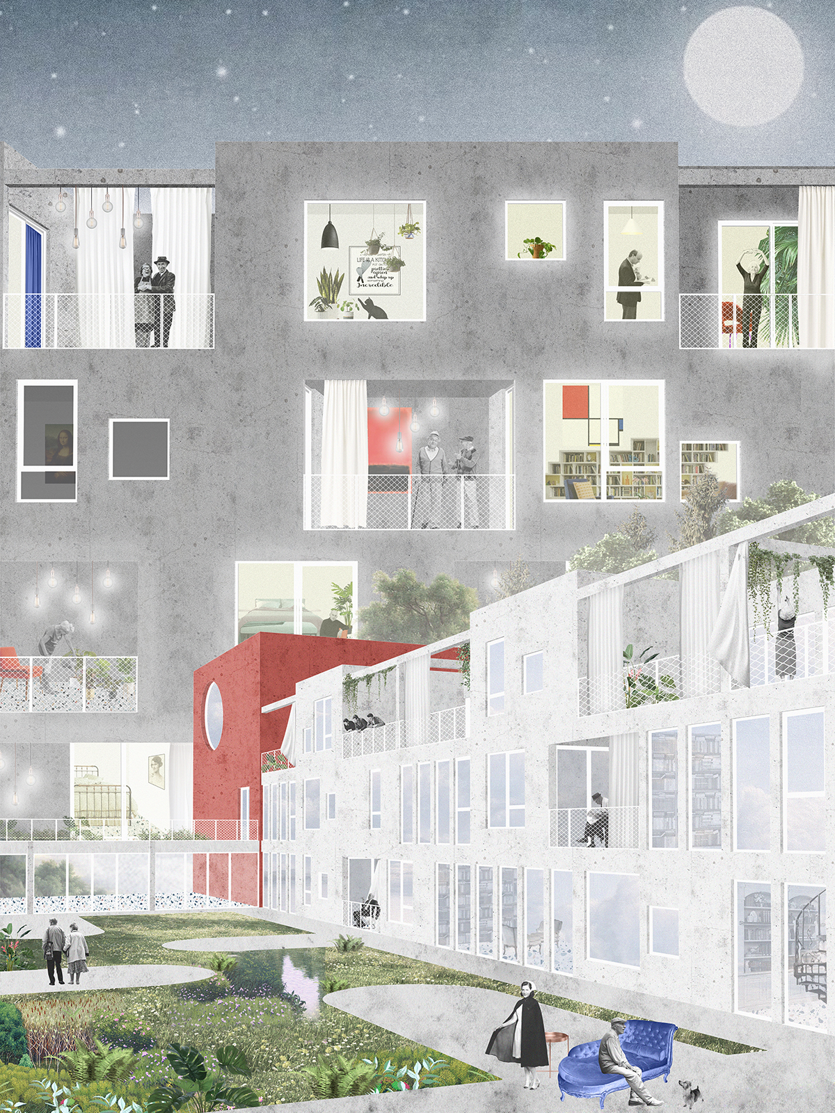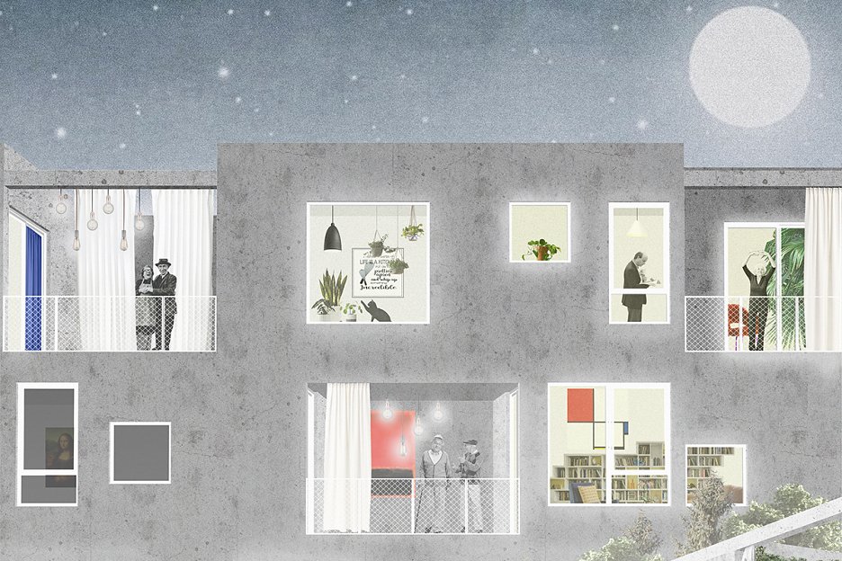 „Rastr“ pokojů je narušen terasami, které mohou navzájem propojovat jednotlivé byty. Vzniká tak prostor k vytvoření malých sousedských komunit, které jsou reminiscencí života mimo instituci. Všechny terasy jsou opatřeny závěsy, pro dny, kdy si prostě „nechcete povídat“.