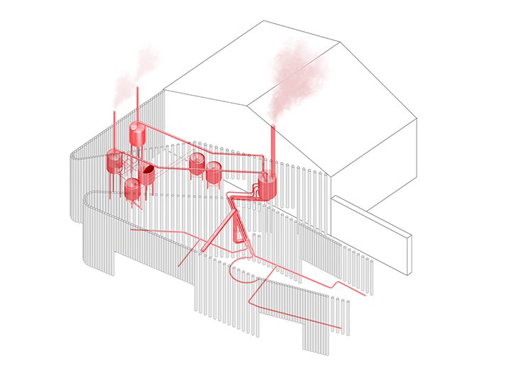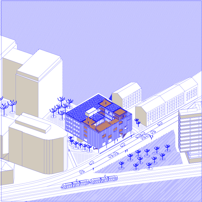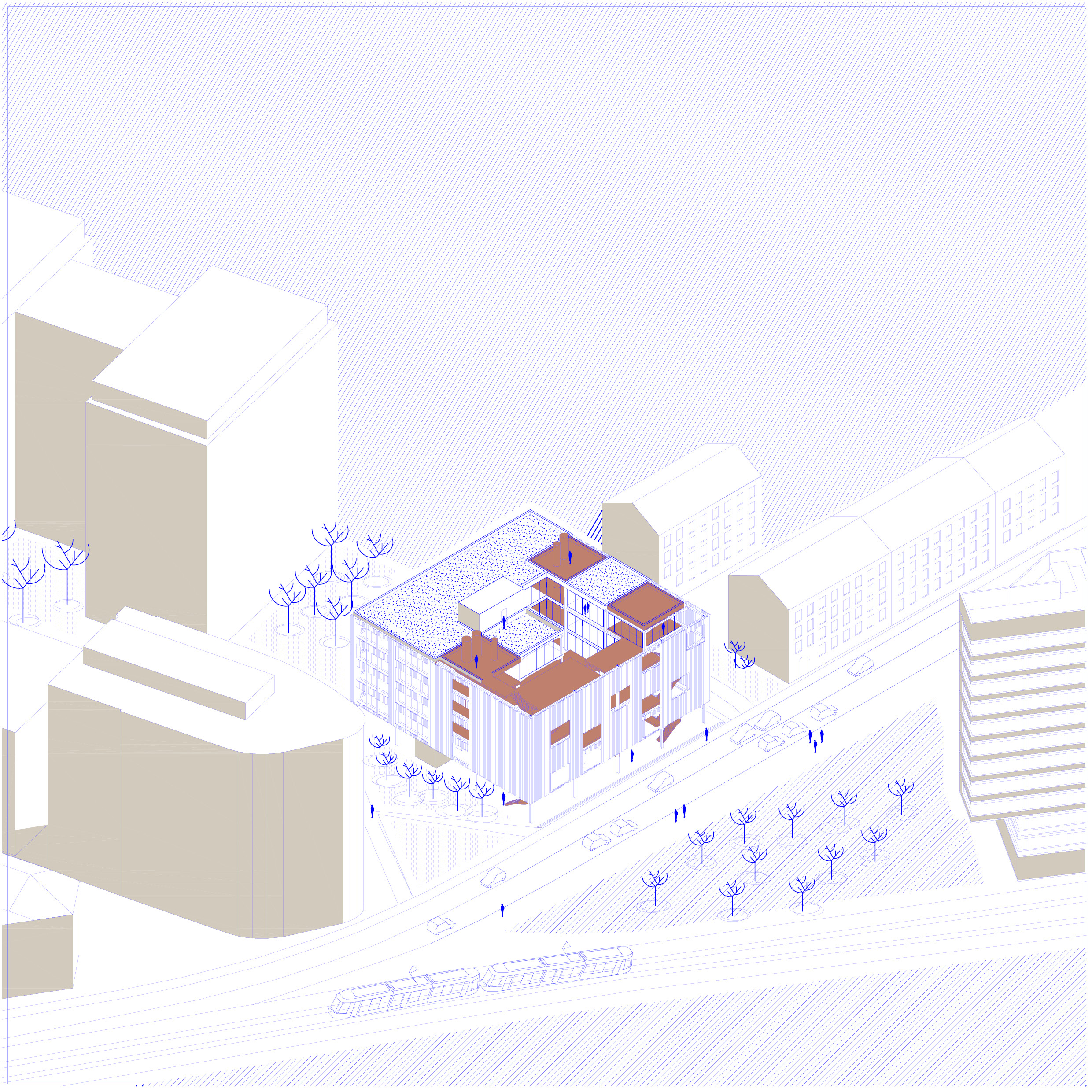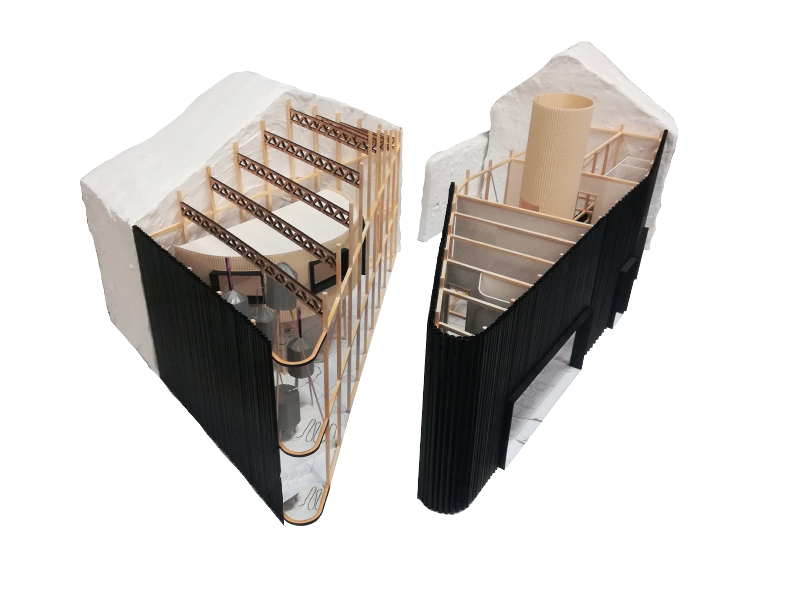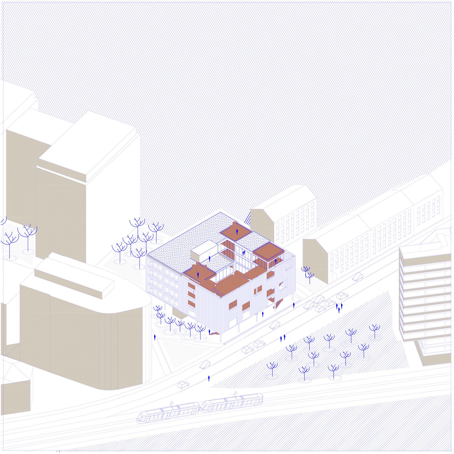 Výchozím bodem pro nás byly vykopávky nacházející se na parcele I, se kterými pracujeme v kontradikci k principu tabula rasa. Různé vrstvy v našem návrhu reflektují dva konstrukční systémy vycházející ze stávajícího rastru betonových patek a nově vzniklých betonových základů vylitých do archeologických sond a nálezovým jam. Rozměry vykopaných jam, nové základy a na ně nadimenzované železobetonové sloupy předávají informaci o archeologických nálezech napříč celou budovou.