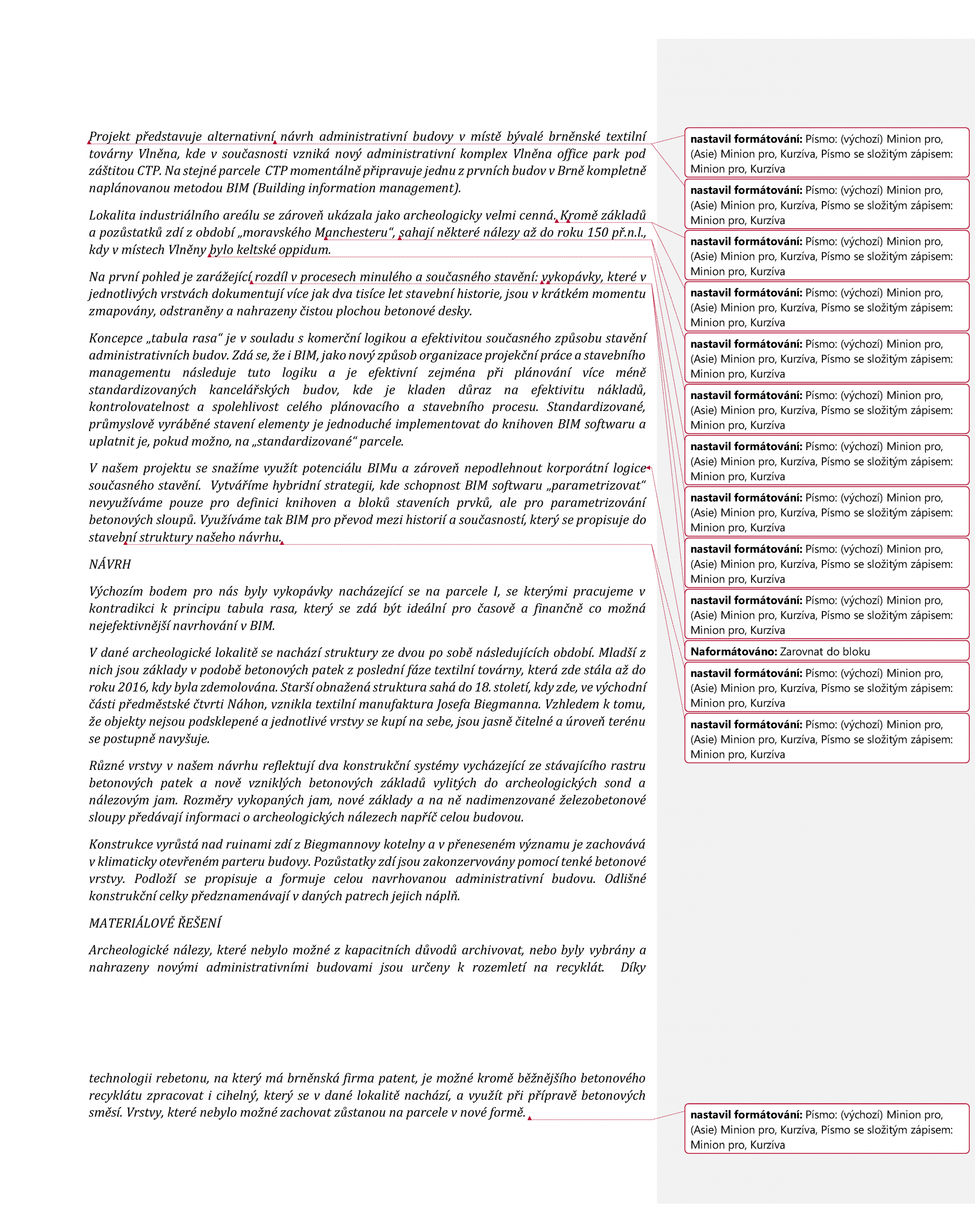 Anotácia: Projekt představuje alternativní návrh administrativní budovy v místě bývalé brněnské textilní továrny Vlněna, kde v současnosti vzniká nový administrativní komplex Vlněna office park pod záštitou CTP. Na stejné parcele CTP momentálně připravuje jednu z prvních budov v Brně kompletně naplánovanou metodou BIM (Building information management).