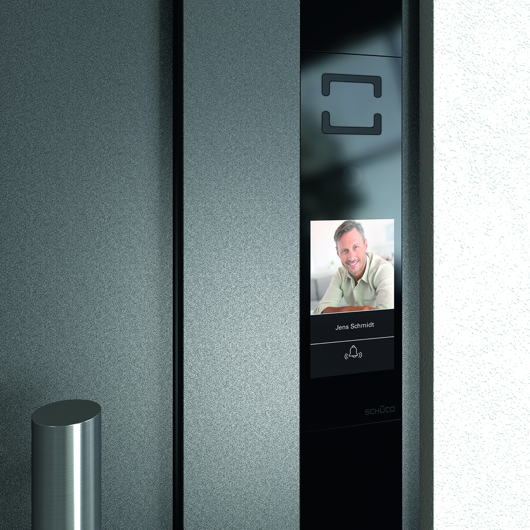Hliníkový systém napĺňa vysoké očakávania na estetickosť a funkčnosť dverných konštrukcií rezidenčného bývania. Atraktívne domové dvere určené pre stavebnú hĺbku 90 mm charakterizuje jednak osvetlená priehlbina madla, čisto zapustená do profilu dverného krídla, a jednak obojstranne prekrývajúca hliníková výplň. Dvere s rukoväťou vizuálne dokonale splývajú a pri vonkajšom pohľade tvoria jednoliatu plochu. Spracovanie nenarúša ani integrovaná modulárna jednotka Schüco Door Control System s dotykovým displejom pre inteligentné otváranie, zatváranie aj zabezpečenie vstupu. Užívateľ dvere ovláda intuitívne, podobne jednoducho ako smartfón. Okrem ovládania na 4-palcovom dotykovom displeji si tak dvere otvoríte a skontroluje aj na diaľku. Do ovládacieho panelu z čierneho skla, ktorý elegantne lícuje s dverovým profilom, sa na želania užívateľa objektu môže inštalovať numerická klávesnica, čítačka odtlačkov prstov, domové číslo, zvonček či menný zoznam obyvateľov na zvončeky alebo systém na dorozumievanie s video kamerou a otváračom dverí. Schüco má v portfóliu aj ďalšie možnosti otvorenia dverí bez použitia kľúčov, napríklad pomocou skenu tváre či s využitím bluetooth technológie.