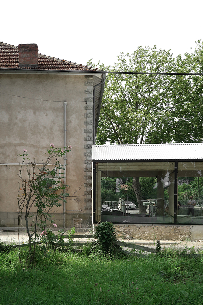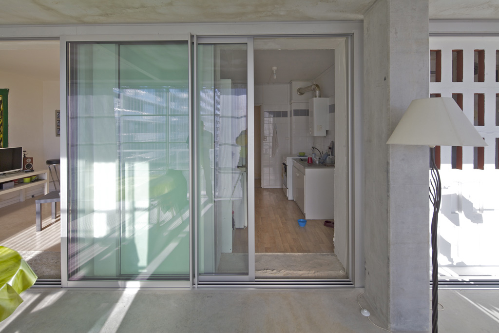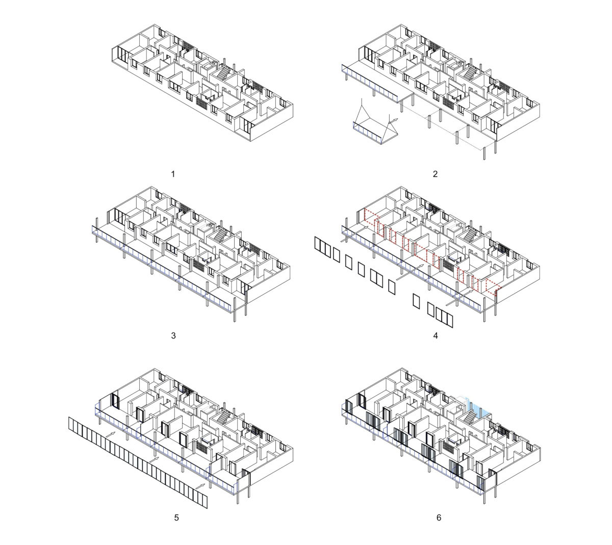Stavebné práce prebiehali nasledovne: Po osadení prefabrikovanej konštrukcie boli odstránené pôvodné výplne okien a konštrukcie kontaminované azbestom. Následne boli do obvodovej steny vyrezané otvory na celú výšku podlažia, ktoré vytvorili priestor pre posuvné dvere s tepelnoizolačným zasklením. Závesy za sklom poskytujú dodatočnú izoláciu vykurovaných interiérov.