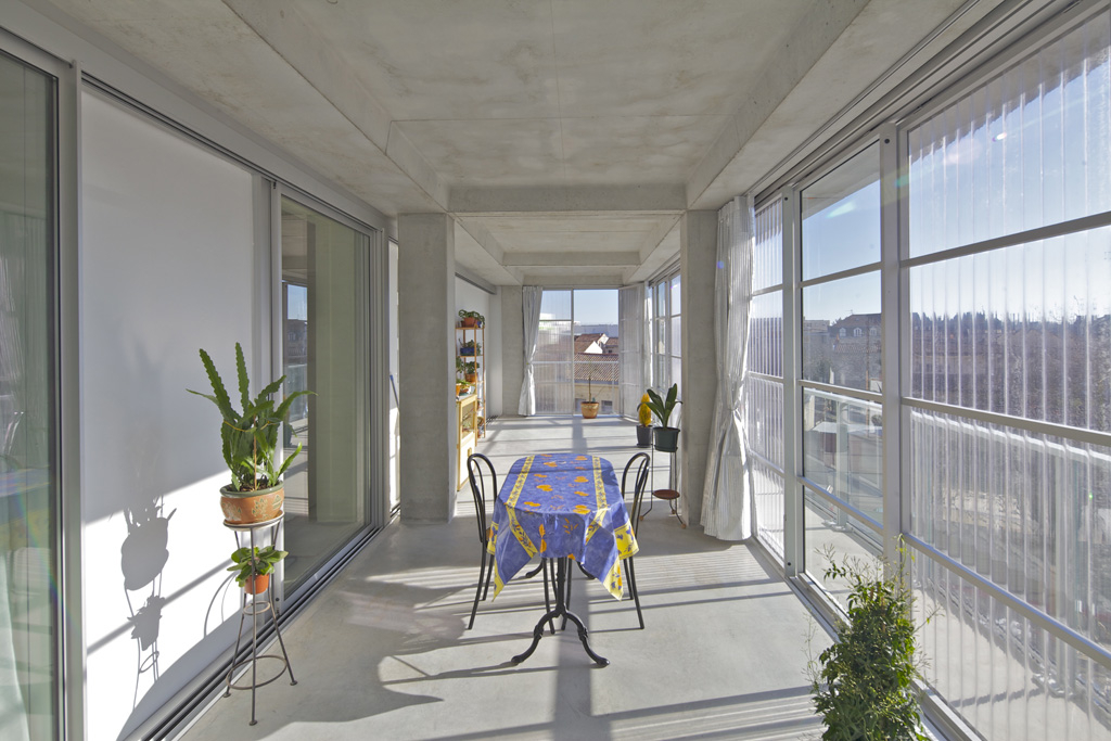 Rekonštrukcia plne obsadenej bytovky začínala v interiéri a postupne sa dostala až na fasádu, kde predsadená pavlač (zimná záhrada) umožnila v maximálnej miere otvorenie bytov. Pôvodné malé okná nahradilo veľké posuvné zasklenie. Výsledkom je viac priestoru, svetla a výhľadov. Rekonštrukcia prebehla bez vysťahovania obyvateľov. Nové obvodové konštrukcie pomohli výrazne zlepšiť celkovú energetickú bilanciu stavby.