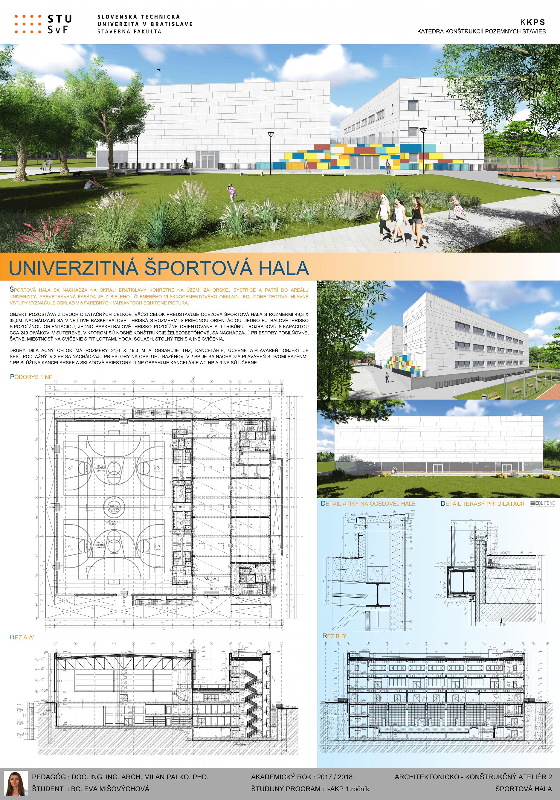 Najlepším projektom sa v akademickom roku 2017/2018 podľa odbornej poroty stal návrh univerzitnej športovej haly Bc. Evy Mišovýchovej. Juraj Palamarčuk zhodnotil prácu nasledovne: „Zaujalo nás, že študentka vo svojom projekte navrhla na športovú halu viac typov fasádnych dosiek v širokej farebnej škále. Na prevetrávanú fasádu použila biely vláknocementový obklad EQUITONE [tectiva], ktorý skombinovala s rôznofarebnými fasádnymi doskami EQUITONE [pictura]. Vytvorila tak nielen funkčnú, ale aj vizuálne zaujímavú fasádu.“ Objekt pozostáva z dvoch dilatačných celkov a bol navrhnutý tak, aby slúžil študentom, ale aj širokej verejnosti. Súčasťou športovej haly sú dve basketbalové ihriská, jedno futbalové ihrisko, posilňovňa, bazén, ale aj učebne, kancelárie či priestory pre jogu, stolný tenis a squash. Univerzitná športová hala má mladých ľudí priviesť k športu a naučiť ich efektívnejšie využívať voľný čas. „Do súťaže som sa zapojila predovšetkým preto, že ma zaujala samotná téma a možnosť vytvoriť projekt s použitím fasádneho obkladu EQUITONE. Je to výborný materiál na stvárnenie prevetrávaných fasád a má veľký potenciál. Veľmi oceňujem, že ide o ekologický, prírodný materiál so širokými možnosťami použitia,“ vyzdvihla víťazka Eva Mišovýchová.