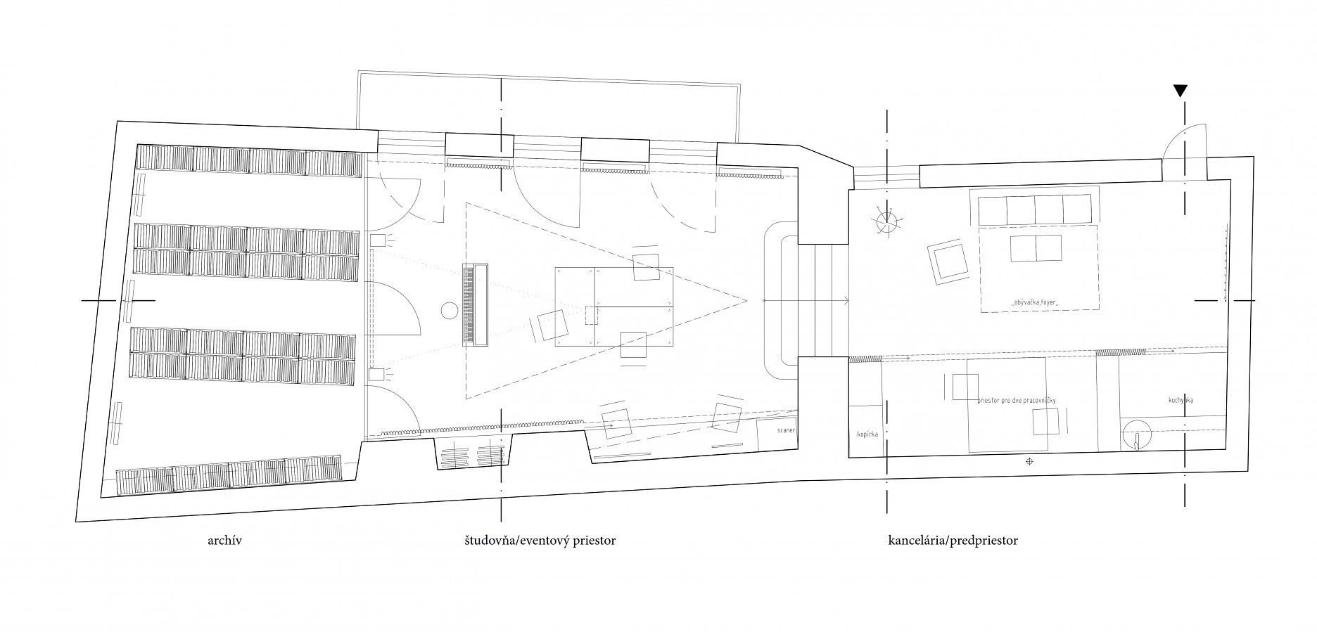 Hlavná myšlienka bola v sústredení zbierok do jedného archívu v miestnosti 2.2, ktorý je zavretý za deliacou stenou. Takéto riešenie síce jasne vymedzilo funkčné zóny, avšak delí hlavný neveľký priestor na dva ešte menšie. Porota taktiež ocenila flexibilitu priestoru 2.1., ktorý sa z kancelárie zatiahnutím závesu zmení na foyer využiteľný pri kultúrnych akciách v miestnosti 2.2. Sympatickým bolo umiestnenie čo možno najväčšieho počtu študijných materiálov do miestnosti 1.2 – bezbariérovo prístupnej. Porota taktiež ocenila veľmi dobre zvládnuté neprvoplánové narábanie so symbolmi pri osvetľovacích telesách.