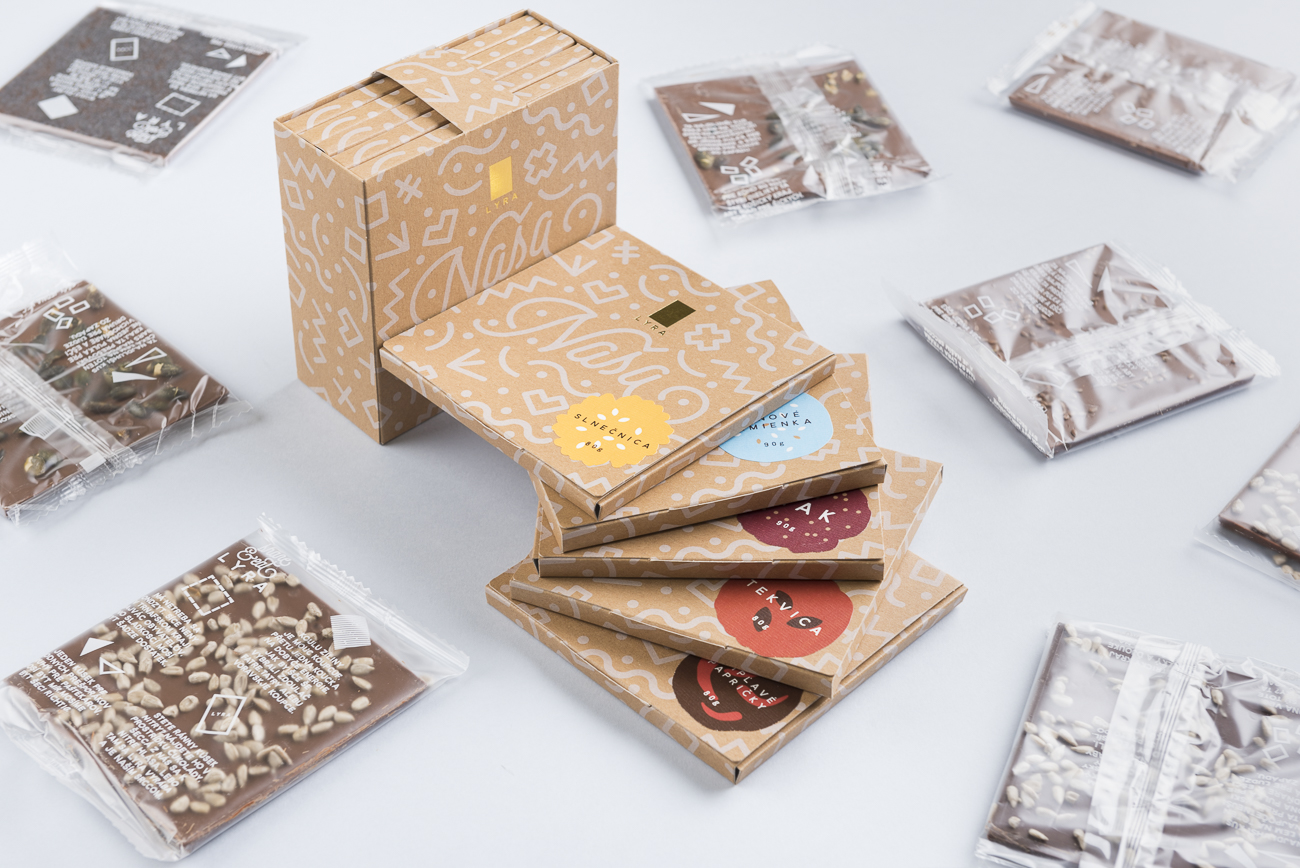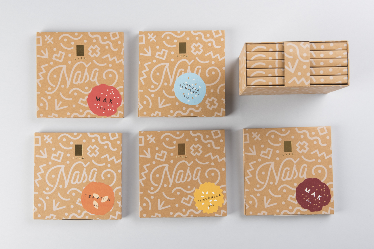 Obalový dizajn pre edíciu ručne vyrobených čokolád so slovenskými surovinami NAŠA. Obalový dizajn hravou formou odkazuje na slovenský pôvod čokolády a spoluprácu so slovenskými farmármi. Forma čokolády je rozdelená na 8 častí, tento počet je referenciou na 8 slovenských krajov. Každá časť má iný tvar (ktorým reaguje na spôsob života v danom kraji) a krátky sprievodný text v príznačnom nárečí. Kraftový papier a nálepky podčiarkujú ručnú výrobu. Nálepky sú v rôznych farbách a tvaroch a vytvárajú tak originálny podpis charakteristický pre použité ingrediencie - mak, tekvicu, čili, ľan alebo slnečnicu. Folklórne motívy sú inšpirované tradičnými vzormi a majú moderné stvárnenie.