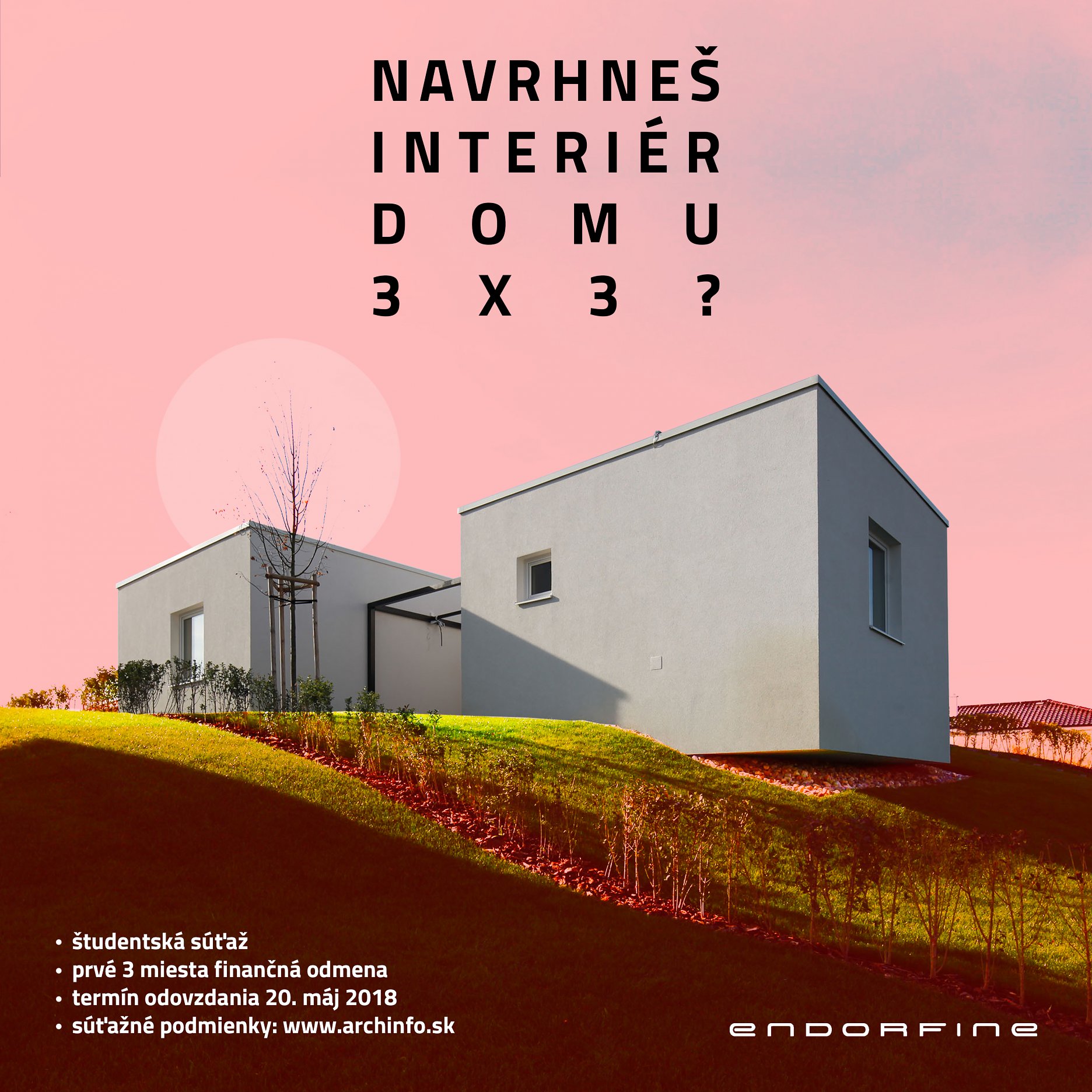 Architektonický ateliér Endorfine vyhlasuje ku dňu 16.4.2018 študentskú anonymnú jednokolovú súťaž návrhov "Navrhneš interiér domu 3x3 ?" na návrh interiéru bungalovu v golfovom rezorte.