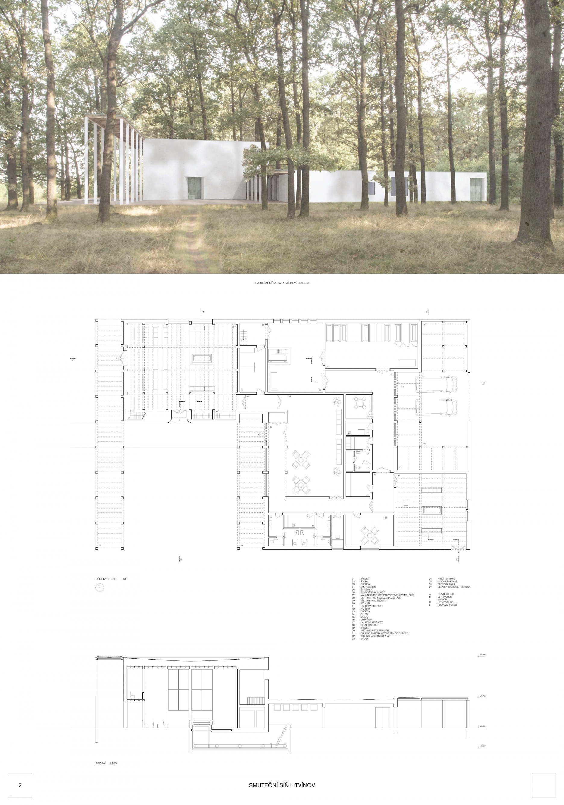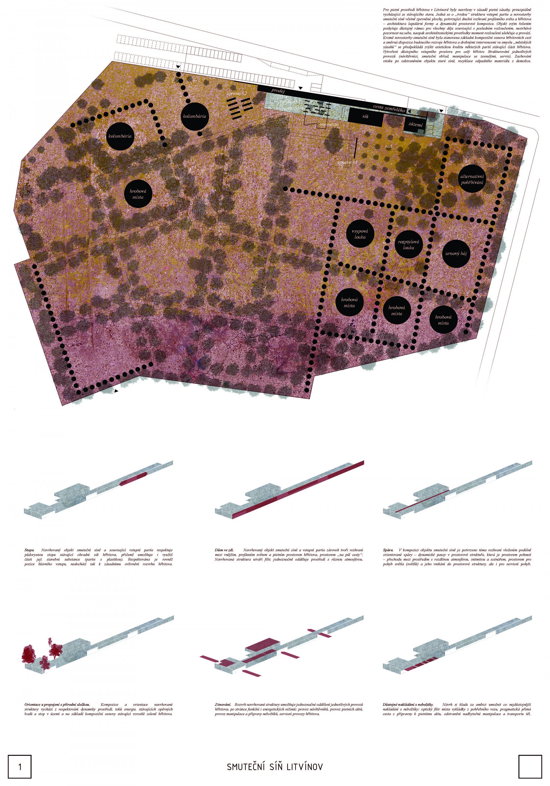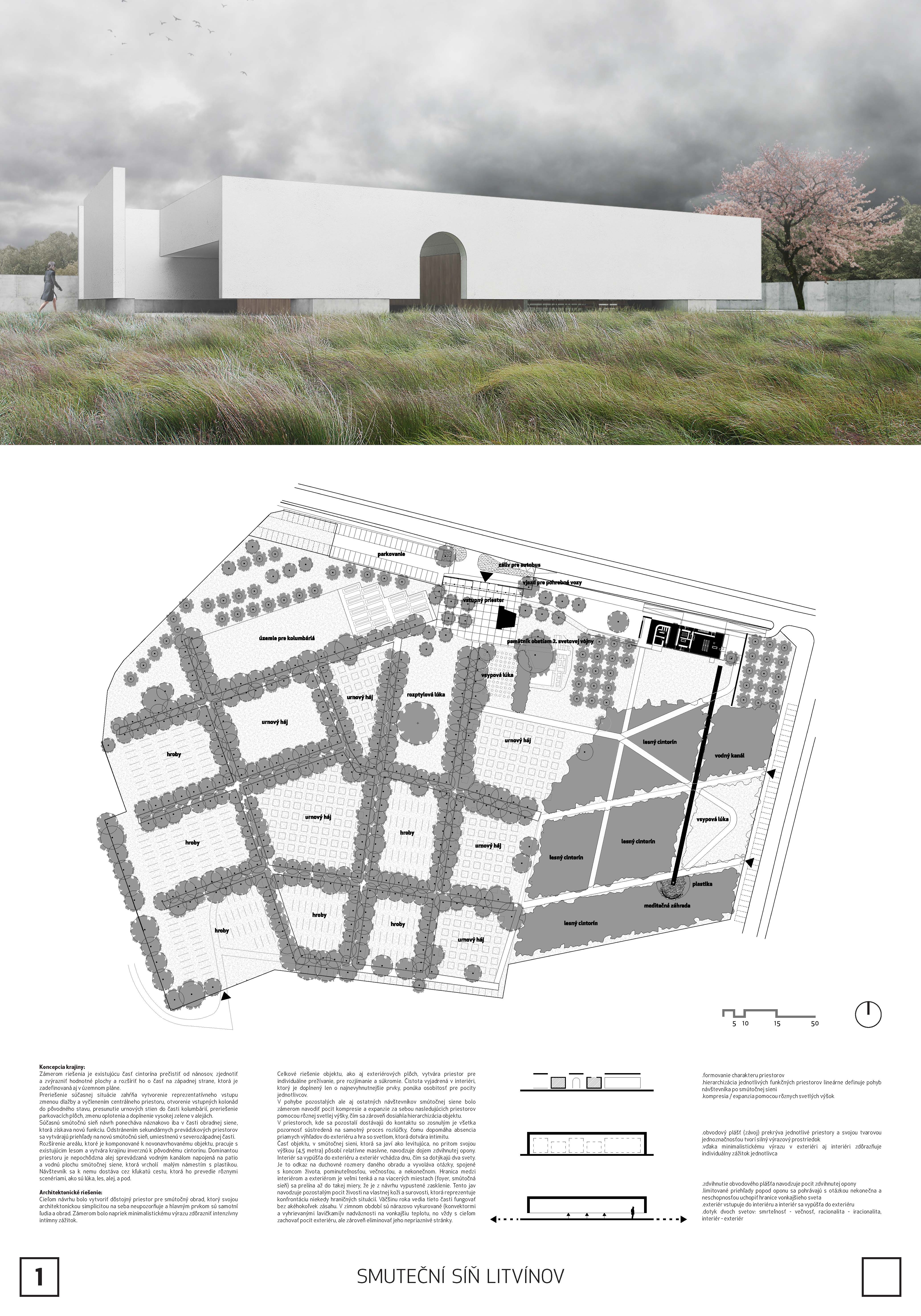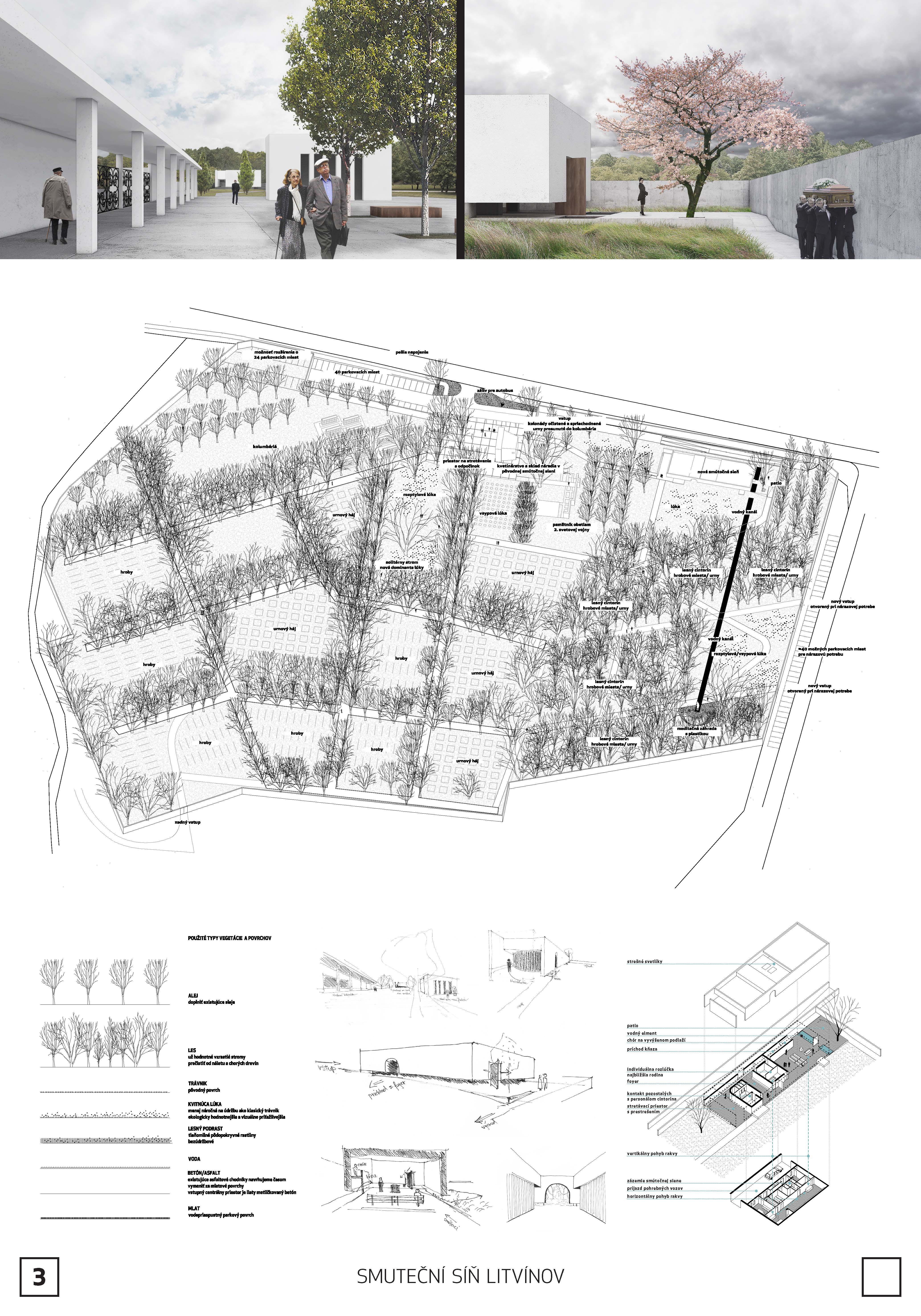 Návrh přináší nejsilnější architektonický koncept soutěže s levitující hmotou síně, která vytváří neopakovatelnou atmosféru. Tuto myšlenku autoři přesvědčivě odůvodňují. - návrh má vynikající výtvarnou kvalitu nejen ve ztvárnění vlastní síně, ale i v urbanistickém řešení - návrh přináší zcela originální pojetí prostoru pro smuteční obřady umožňující přítomným hostům hluboký smyslový i vnitřní prožitek - dispoziční řešení budovy smuteční síně vychází ze samotné koncepce a navozuje scénář cesty posledního rozloučení - urbanistická koncepce navazuje na stávající uspořádání prostoru hřbitova, využívá atmosféry lesního porostu a umožňuje alternativní způsoby pohřbívání. Parková úprava nabízí různá místa umožňující intimitu při rozjímání. Z ekonomického hlediska je návrh přiměřený - porota doporučuje zvážit přemístění některých provozů, jako např. dílna kameníka, kancelář pro výběr poplatků, kancelář ostrahy mimo hlavní objekt smuteční síně - porota dále doporučuje dopracovat řešení předprostoru hlavního vstupu na hřbitov