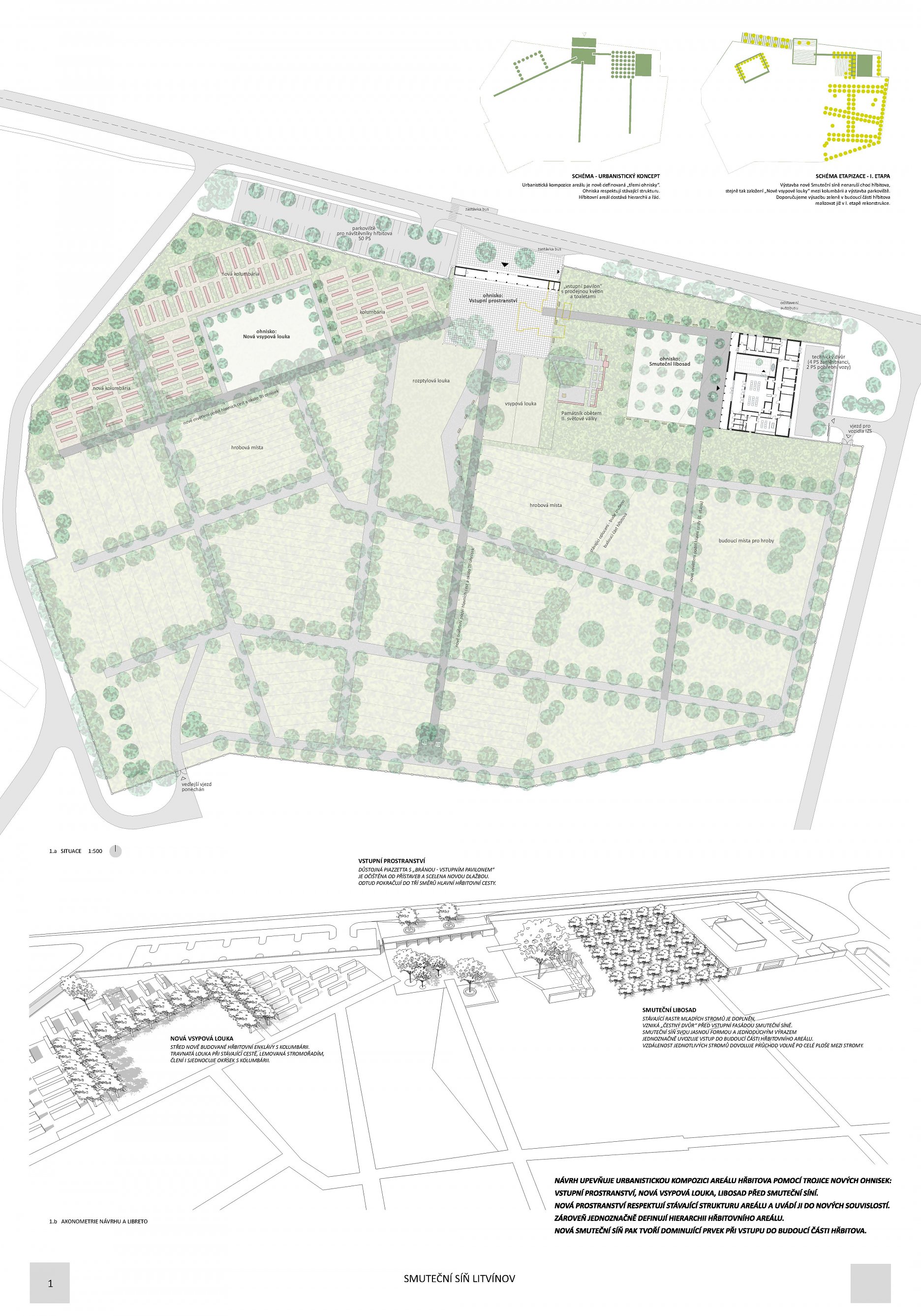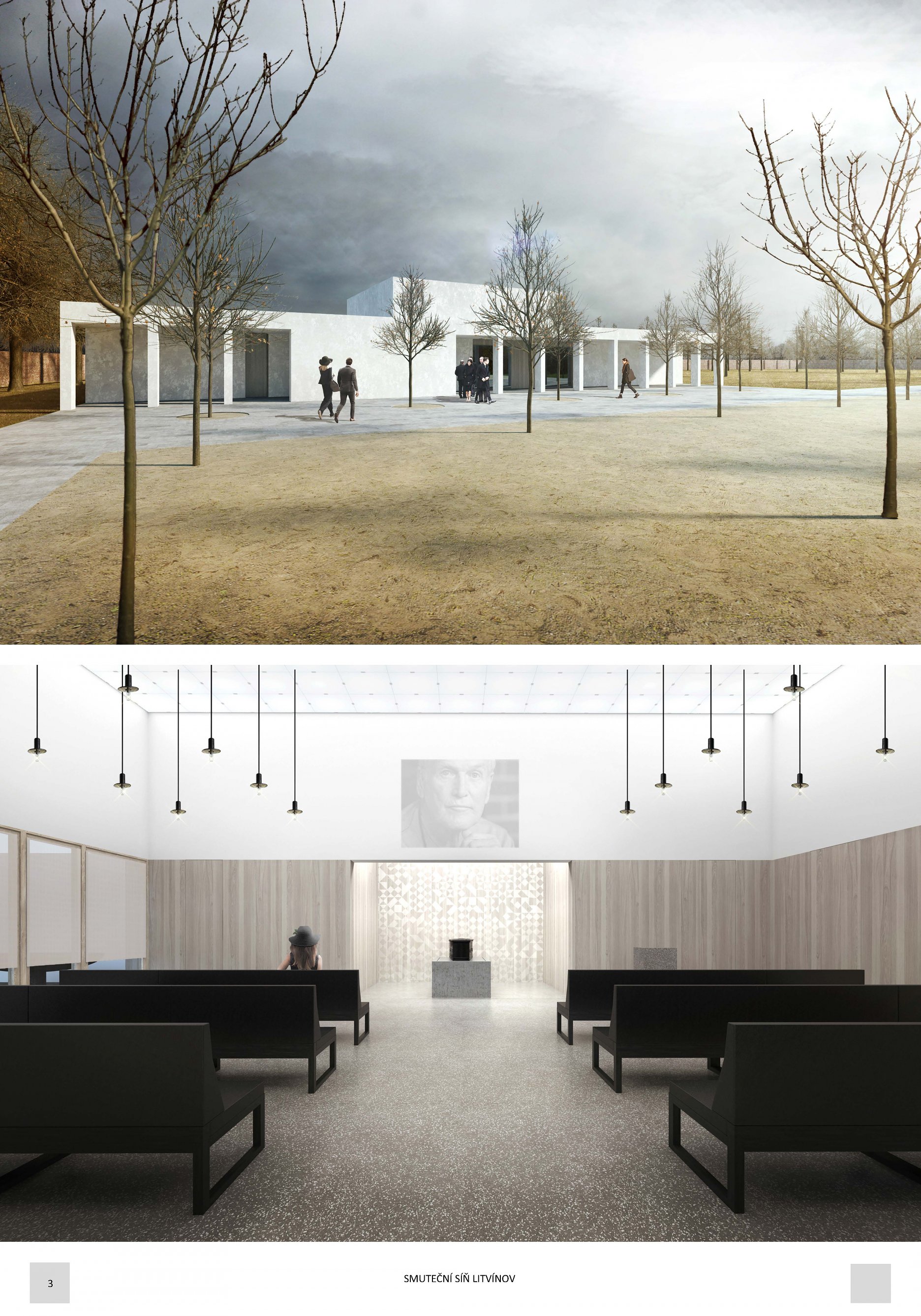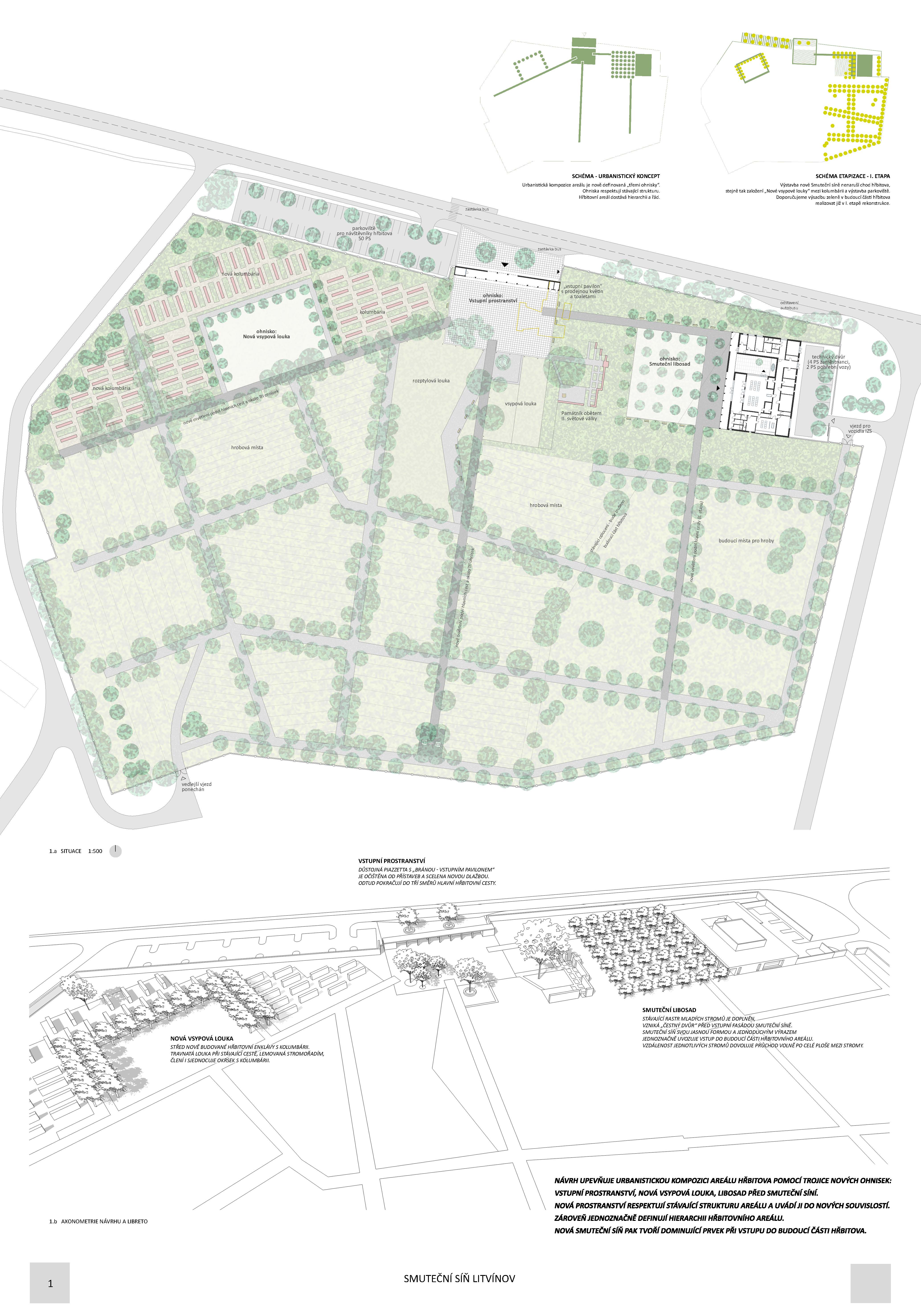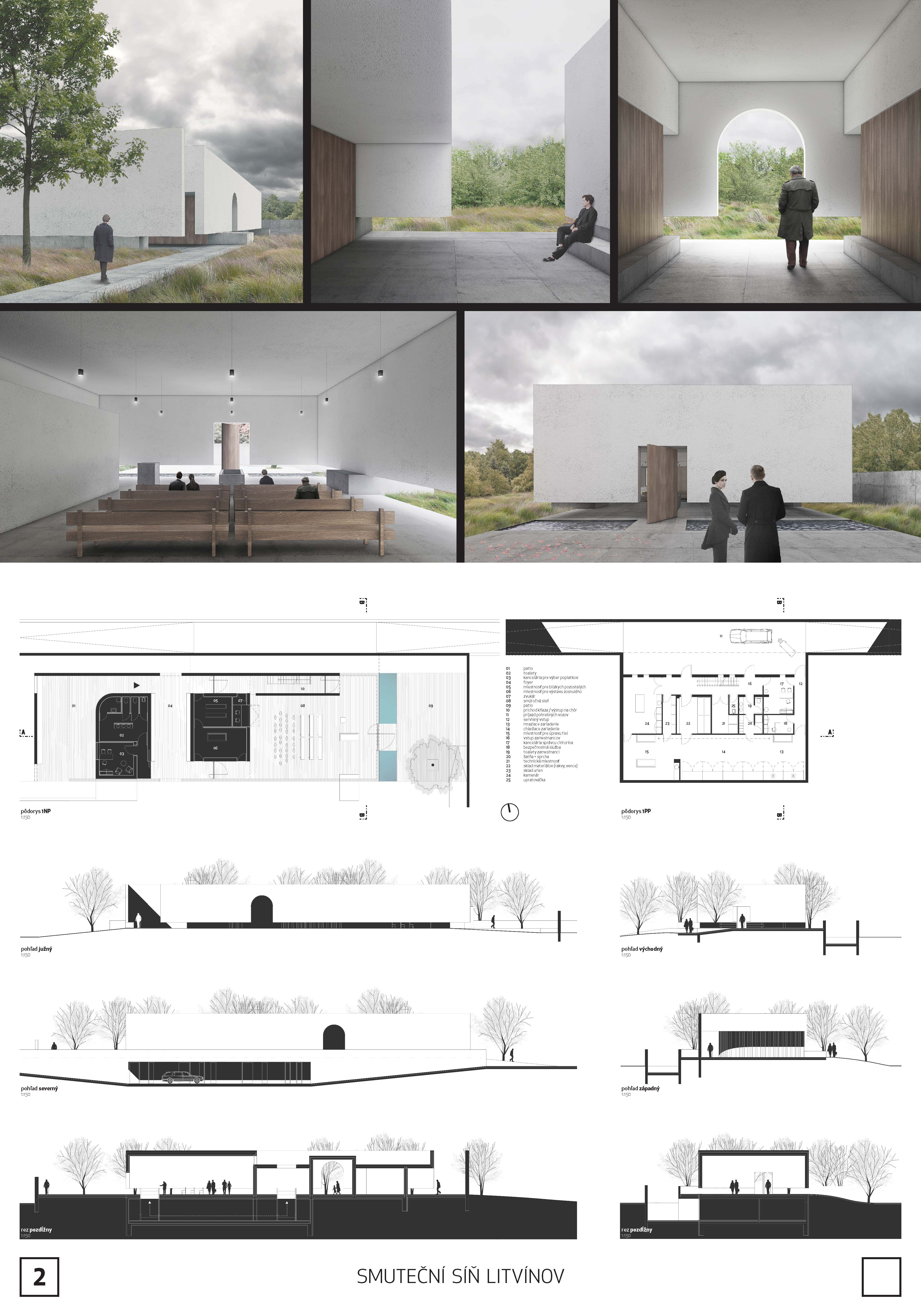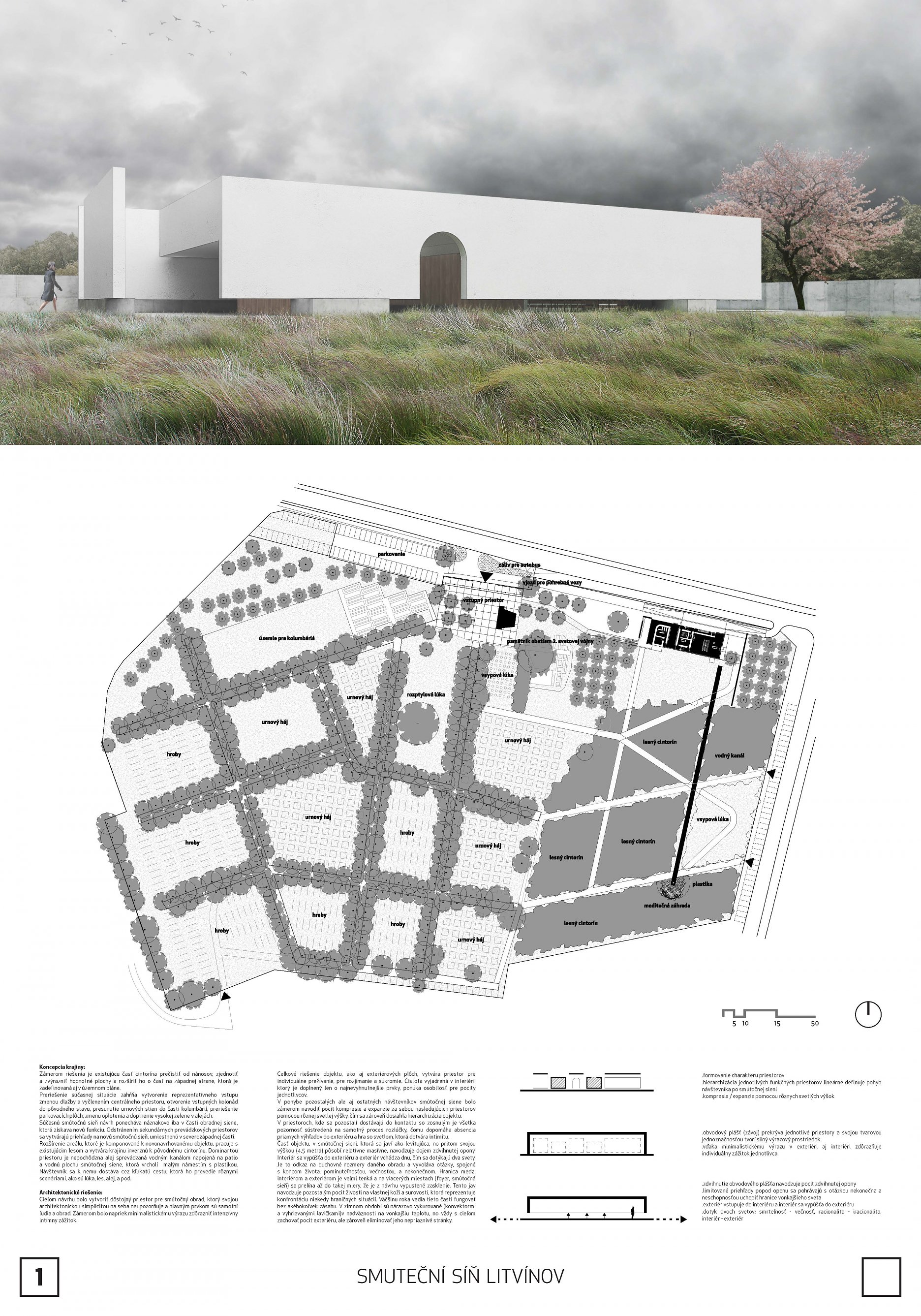 Návrh přináší nejsilnější architektonický koncept soutěže s levitující hmotou síně, která vytváří neopakovatelnou atmosféru. Tuto myšlenku autoři přesvědčivě odůvodňují. - návrh má vynikající výtvarnou kvalitu nejen ve ztvárnění vlastní síně, ale i v urbanistickém řešení - návrh přináší zcela originální pojetí prostoru pro smuteční obřady umožňující přítomným hostům hluboký smyslový i vnitřní prožitek - dispoziční řešení budovy smuteční síně vychází ze samotné koncepce a navozuje scénář cesty posledního rozloučení - urbanistická koncepce navazuje na stávající uspořádání prostoru hřbitova, využívá atmosféry lesního porostu a umožňuje alternativní způsoby pohřbívání. Parková úprava nabízí různá místa umožňující intimitu při rozjímání. Z ekonomického hlediska je návrh přiměřený - porota doporučuje zvážit přemístění některých provozů, jako např. dílna kameníka, kancelář pro výběr poplatků, kancelář ostrahy mimo hlavní objekt smuteční síně - porota dále doporučuje dopracovat řešení předprostoru hlavního vstupu na hřbitov