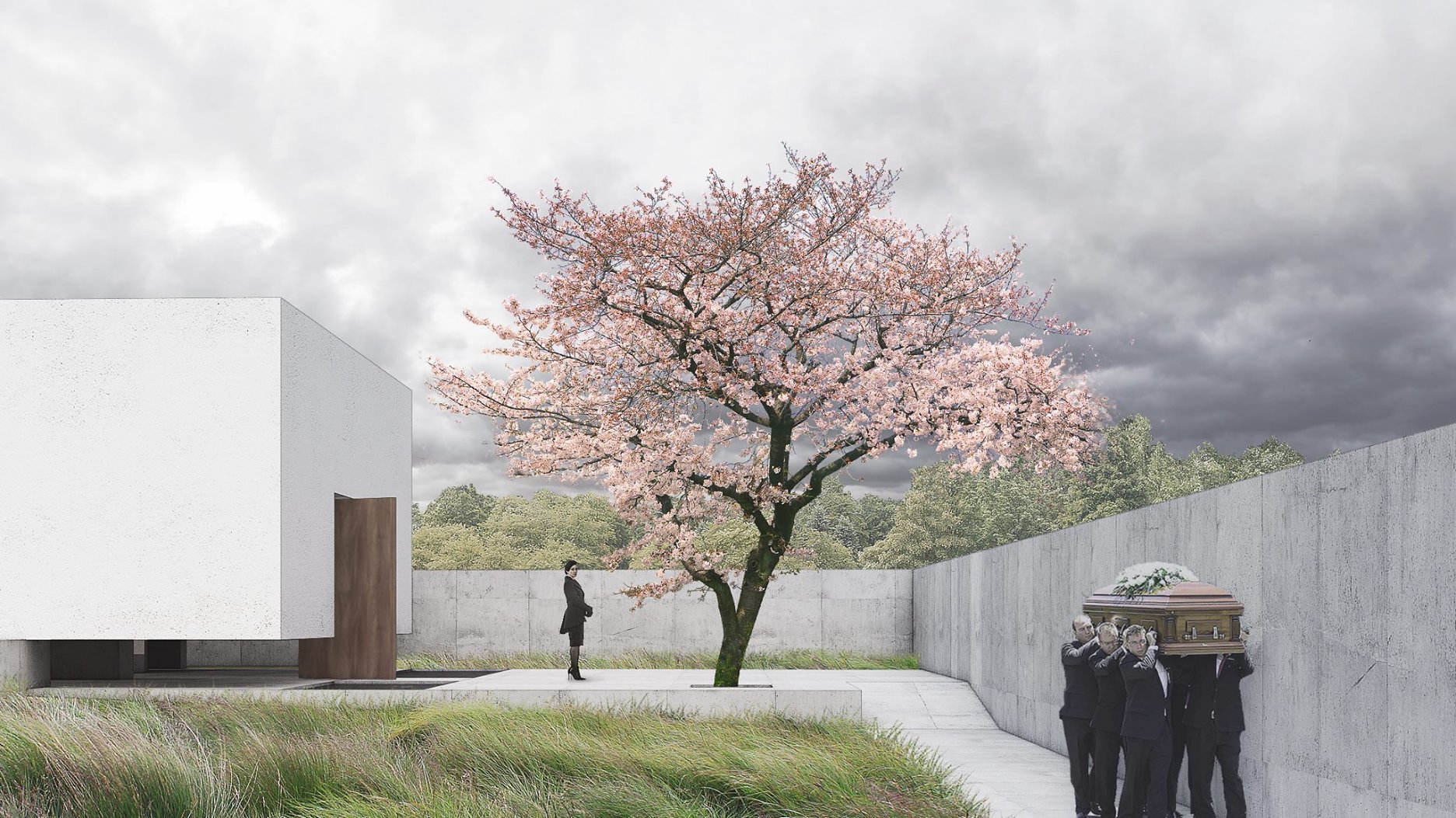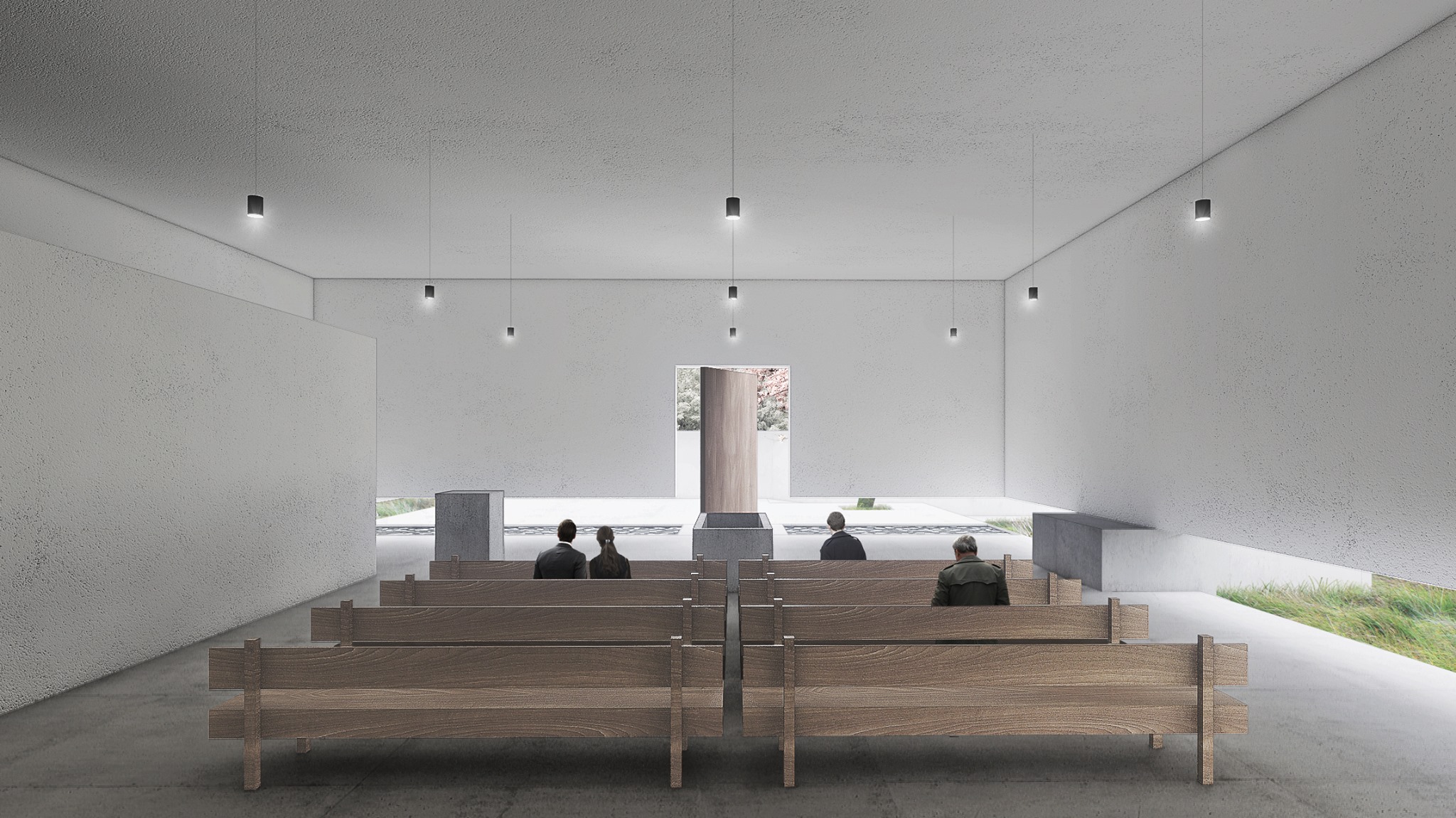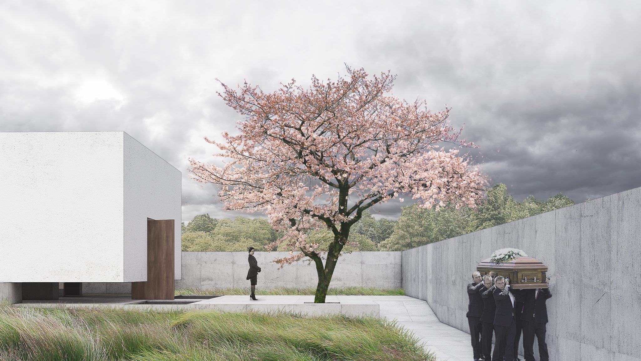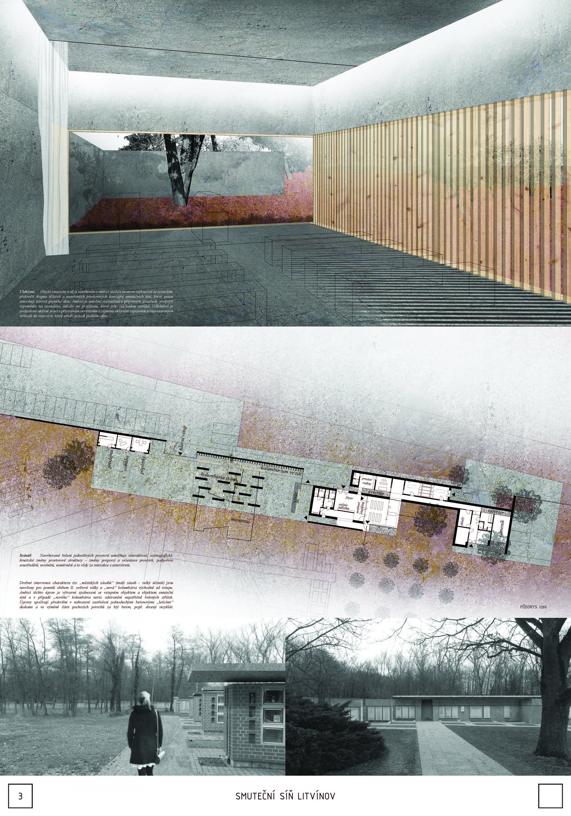 Návrh přináší nejsilnější architektonický koncept soutěže s levitující hmotou síně, která vytváří neopakovatelnou atmosféru. Tuto myšlenku autoři přesvědčivě odůvodňují. - návrh má vynikající výtvarnou kvalitu nejen ve ztvárnění vlastní síně, ale i v urbanistickém řešení - návrh přináší zcela originální pojetí prostoru pro smuteční obřady umožňující přítomným hostům hluboký smyslový i vnitřní prožitek - dispoziční řešení budovy smuteční síně vychází ze samotné koncepce a navozuje scénář cesty posledního rozloučení - urbanistická koncepce navazuje na stávající uspořádání prostoru hřbitova, využívá atmosféry lesního porostu a umožňuje alternativní způsoby pohřbívání. Parková úprava nabízí různá místa umožňující intimitu při rozjímání. Z ekonomického hlediska je návrh přiměřený - porota doporučuje zvážit přemístění některých provozů, jako např. dílna kameníka, kancelář pro výběr poplatků, kancelář ostrahy mimo hlavní objekt smuteční síně - porota dále doporučuje dopracovat řešení předprostoru hlavního vstupu na hřbitov