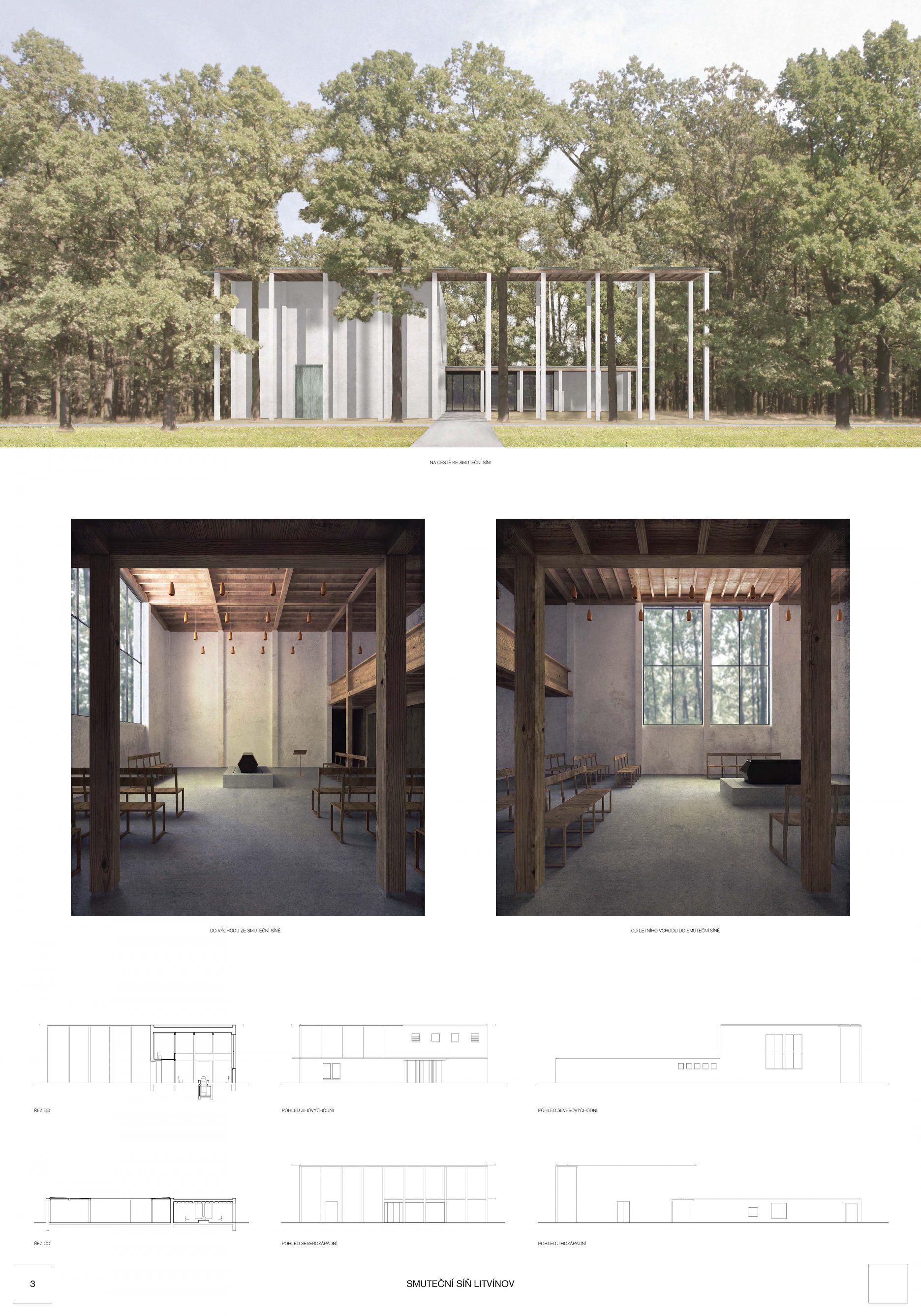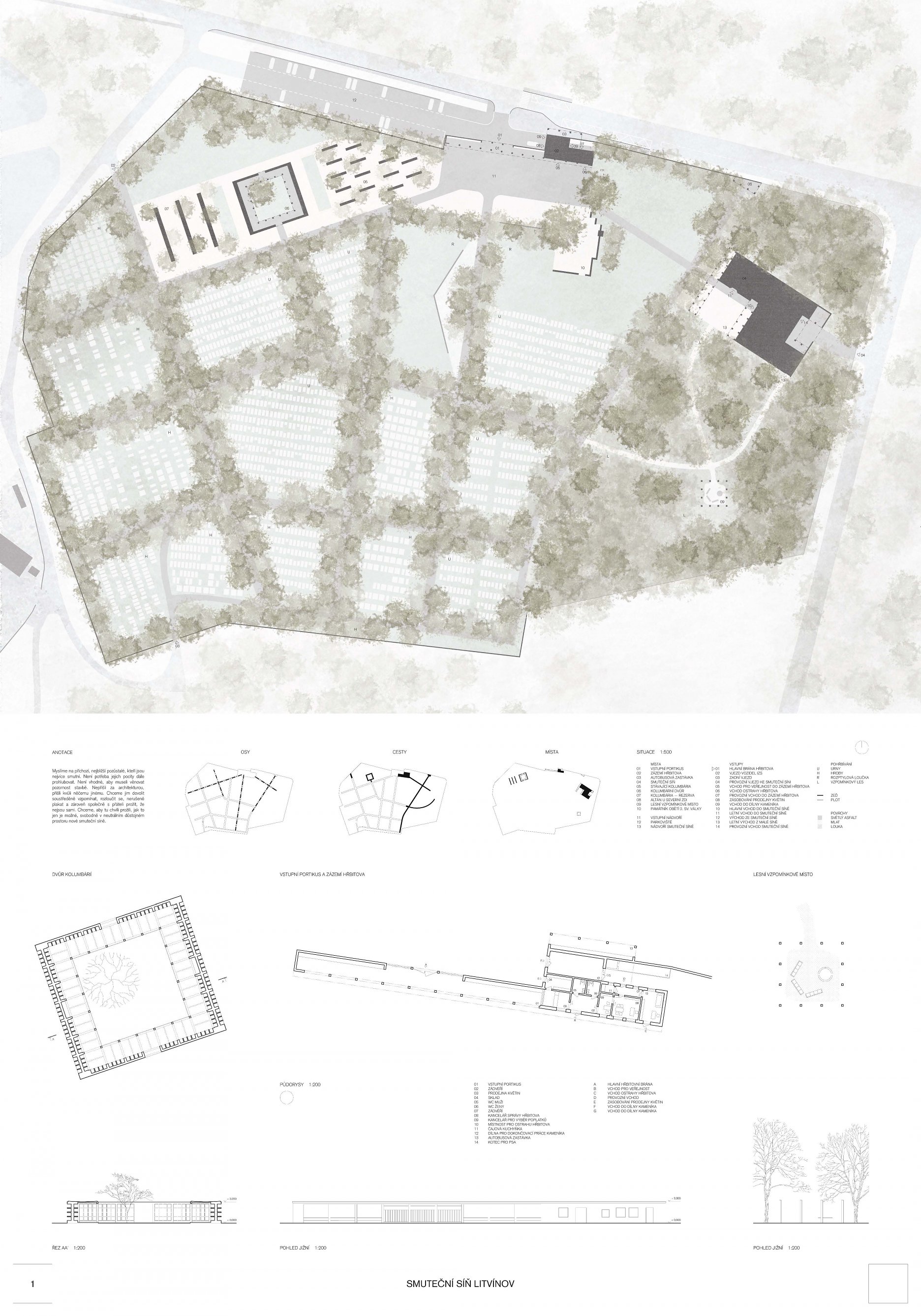 Porota oceňuje kultivované architektonické ztvárnění objektu zasazené do stávajícího lesního porostu - výrazným motivem stavby je sloupořadí korespondující s vertikálami stromů - vnitřní prostory smuteční síně jsou přiměřené, pracují s tradičními materiály a se severním osvětlením, jejich atmosféra je působivá - problematicky se jeví dispoziční řešení, a to jak části veřejné, tak provozní (pohyb smutečních hostů, pohyb zesnulého) - nejednoznačně působí umístění i podoba několika vstupů do smuteční síně - budova smuteční síně je předimenzovaná, což se negativně projevuje i v ekonomickém hledisku, návrh patří mezi nejdražší - kvalitou návrhu je umístění provozních částí do samostatného objektu umístěného do samostatného objektu u vstupu do areálu hřbitova - z krajinářského hlediska návrh nejvíce těží z atmosféry původního lesa, je řešena široká škála způsobu pohřbívání, úmyslně pracuje se vzpomínkovými a odpočinkovými místy hřbitova, dalším silným momentem je rozvoj prostoru kolumbárií
