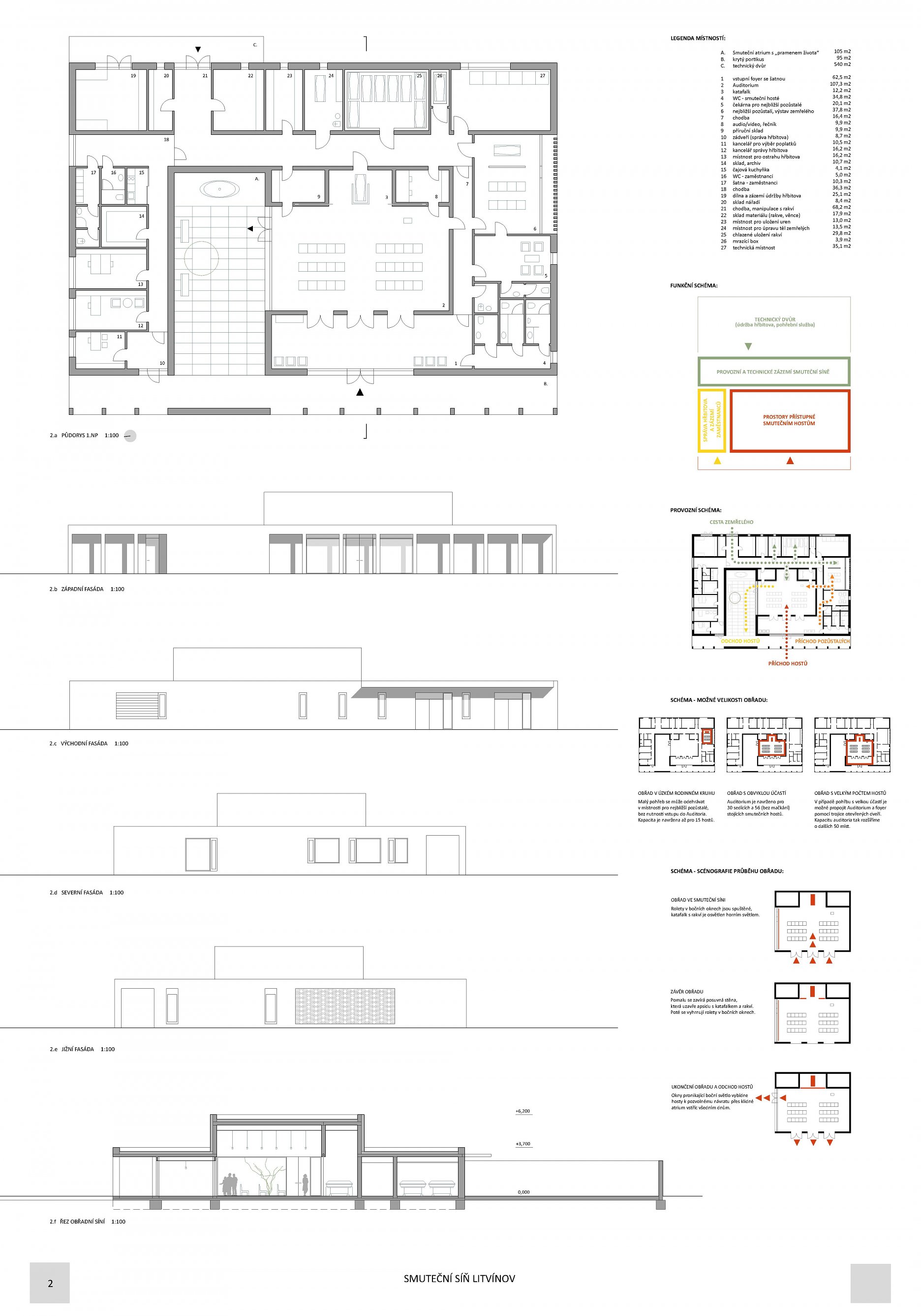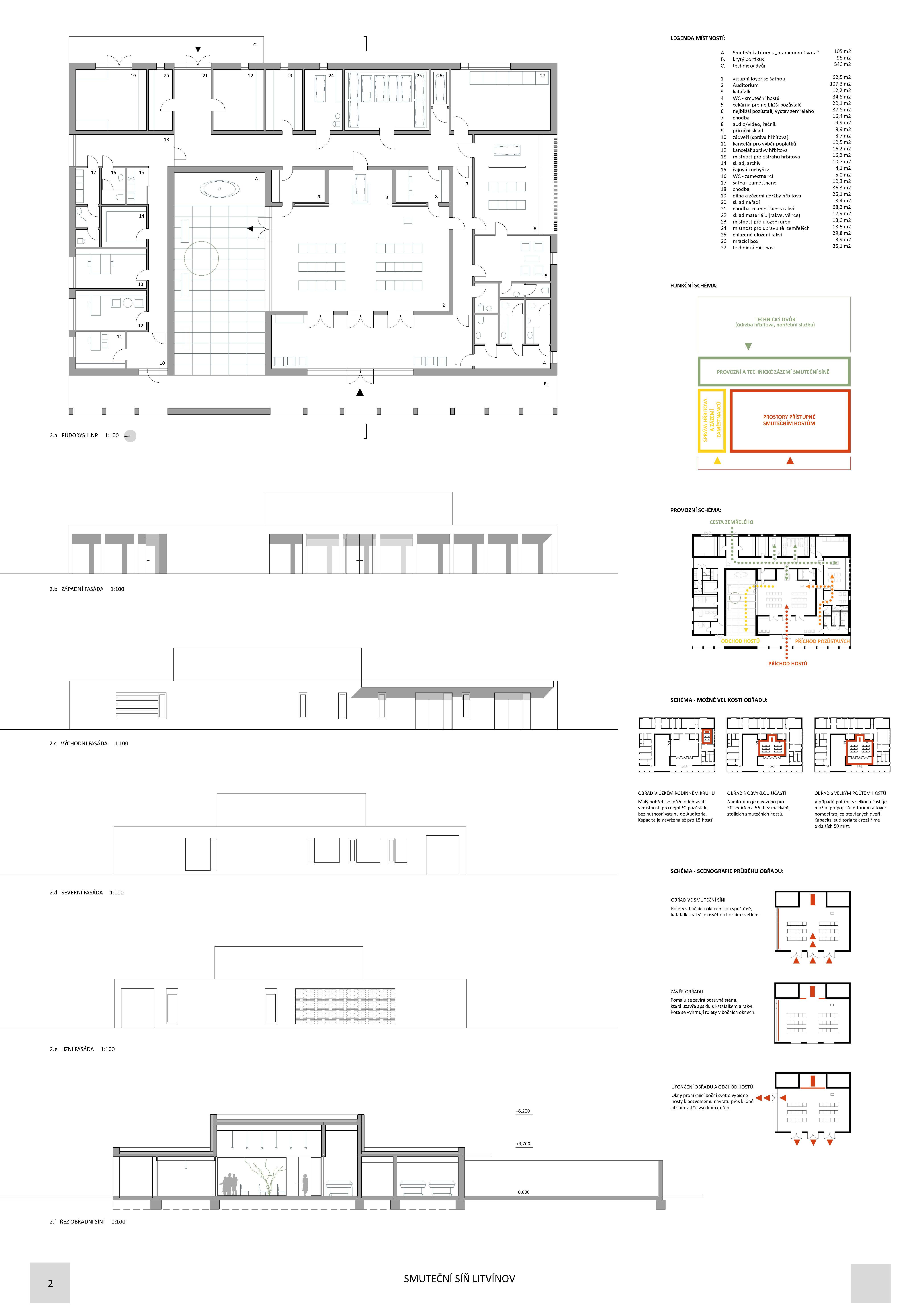 Návrh je z hlediska dispozičního uspořádání racionální a přehledný s jasným pohybem smutečních hostů i logickou manipulací se zesnulým nevyžadujícím podsklepení a výtah - návrh umožňuje několik variant pro smuteční obřady dle počtu hostů - návrh navazuje na stávající strukturu hřbitova, avšak plně nevyužívá potenciálů místa - architektonické ztvárnění objektu je racionální a kultivované, avšak příliš pragmatické - objemovým řešením patří návrh mezi největší, což se negativně projevuje i v ekonomickém hledisk