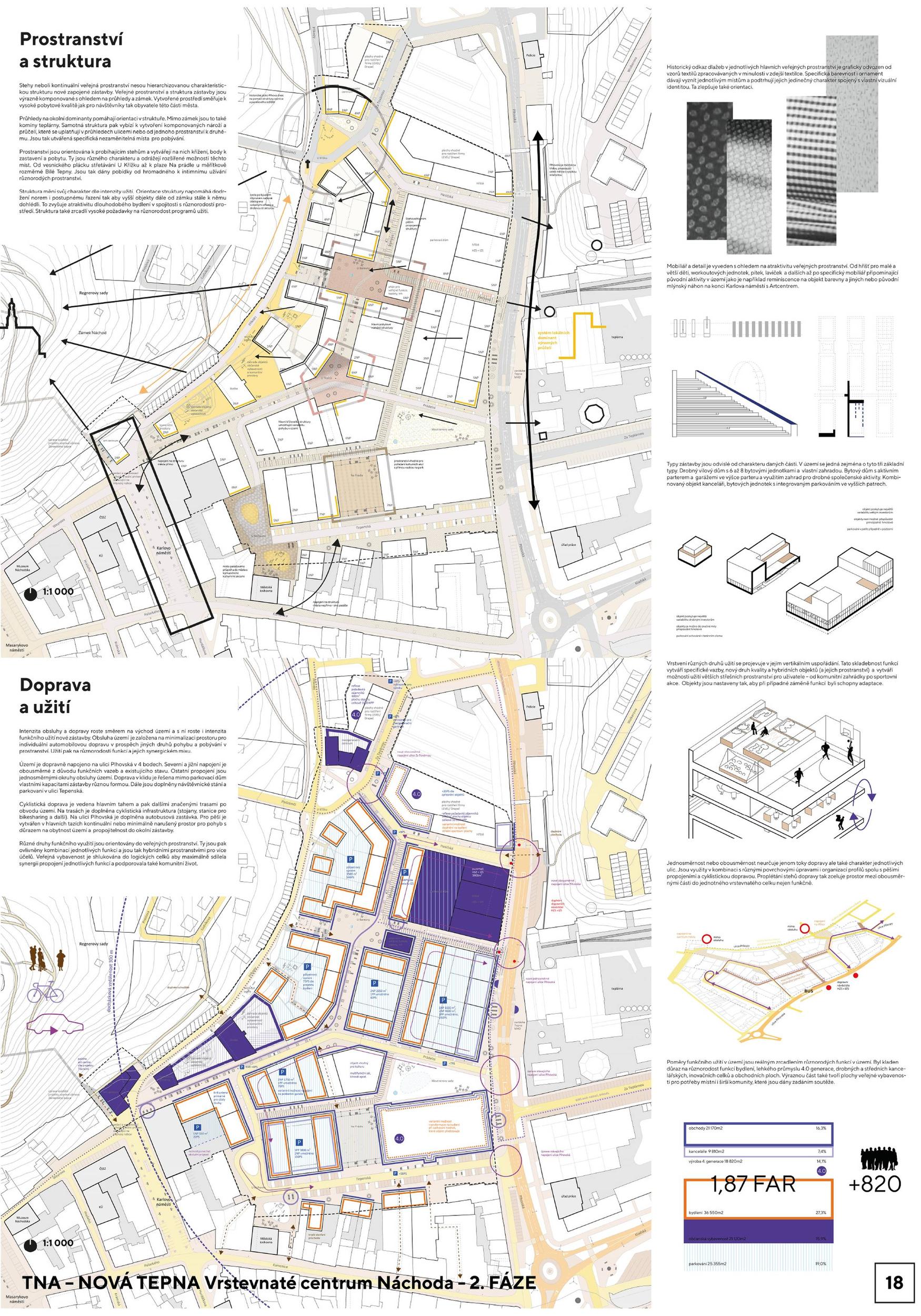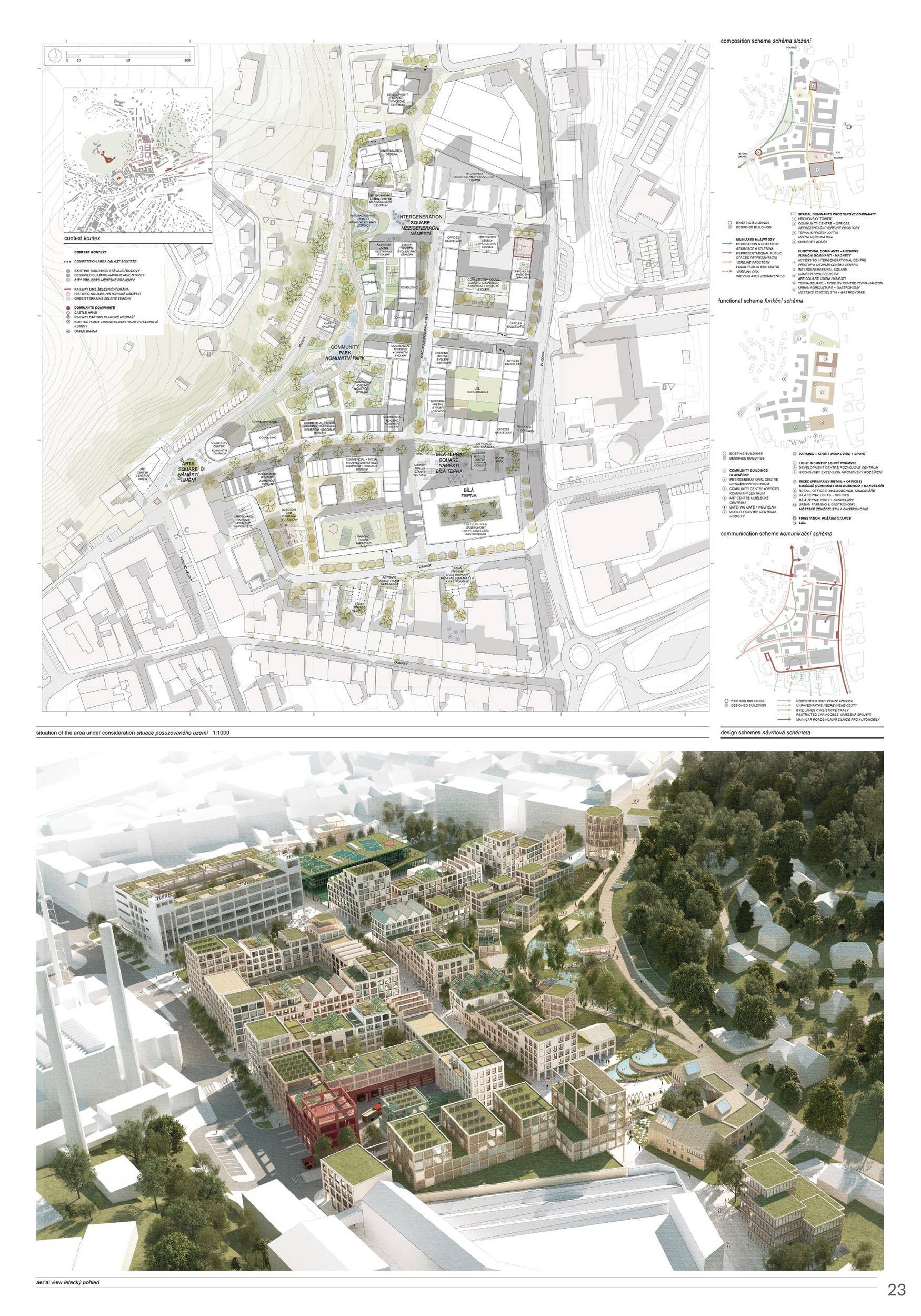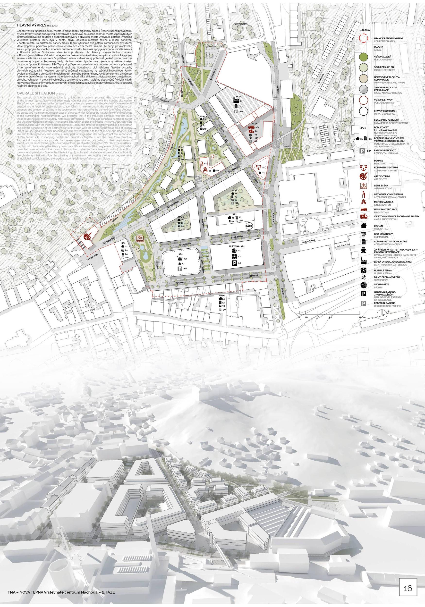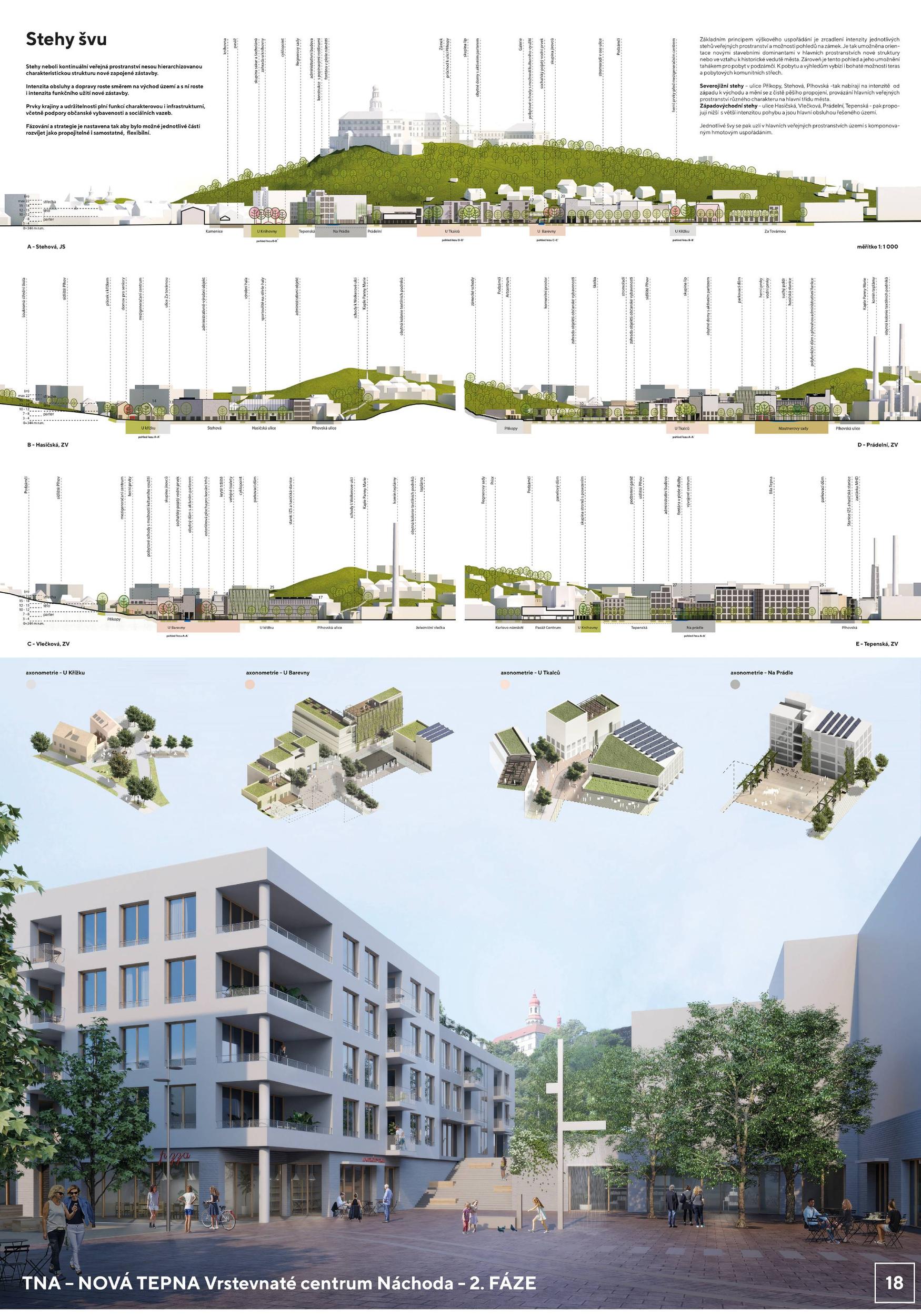 Autoři návrhu velmi dobře trefili urbanistické měřítko a v práci s jednotlivými městskými prostory si počínají velmi zdatně. Jejich konkrétní fyzická forma je přesvědčivá svým lidským měřítkem a jistě by nabídla příjemnou atmosféru. Trojúhelníkové náměstí severně od objektu Tepny ve vazbě na komín a výhled na zámek je povedené, stejně tak poloha pro významnou městskou instituci, na kterou se vážou vedle tohoto náměstí ještě další dvě boční náměstíčka. Návrh dobře reaguje na vlastnické poměry v místě a stávající stavby, přesto mu chybí jistá elegance v celkové organizaci prostoru. Poněkud nedořešená je vazba na zámek a příliš úzký stavební blok u Příkopů. Menší stavební bloky vytváří hustou síť uliček a náměstí, která je však v této poloze města diskutabilní, protože rozlévá energii obchodního parteru do příliš velkého území. Určitá koncentrace pohybu lidí přináší atraktivitu a oživení ulic, protože počet uživatelů žijících v okolí těchto prostor je již daný. Menší stavební bloky také omezí způsob fázování a práci v čase při proměně území. Není úplně jasný záměr s jižní frontou ulice Tepenská. Nemá se zacelit a „zkompaktnit“, aby jako definice ulice fungovala? Velmi sympatická je možnost na cestě ze sídliště Plhov zvolit cestu více krajinnou, podél úpatí Regnerových sadů, anebo městskou, procházející téměř všemi klíčovými prostory nově navržené čtvrti. Paradoxem návrhu je, že zatímco urbanistické řešení vzbuzovalo jen ta nejlepší očekávání, co se týče atmosféry městských prostorů, architektonické řešení rozhodně nepůsobilo tak malebně. Parkovací dům i budova IZS se zdají předimenzované. Návrh představuje ukázku pochopení důležitosti pohledu na město shora, nabídnutí pestré škály činností odehrávajících se ve výšce, zvláště pak v kombinaci s řešením zeleně a dláždění nových ulic a náměstíček. Velmi oceňujeme důslednou práci s průhledy na místní dominanty, ať už historické, tak ty industriální.