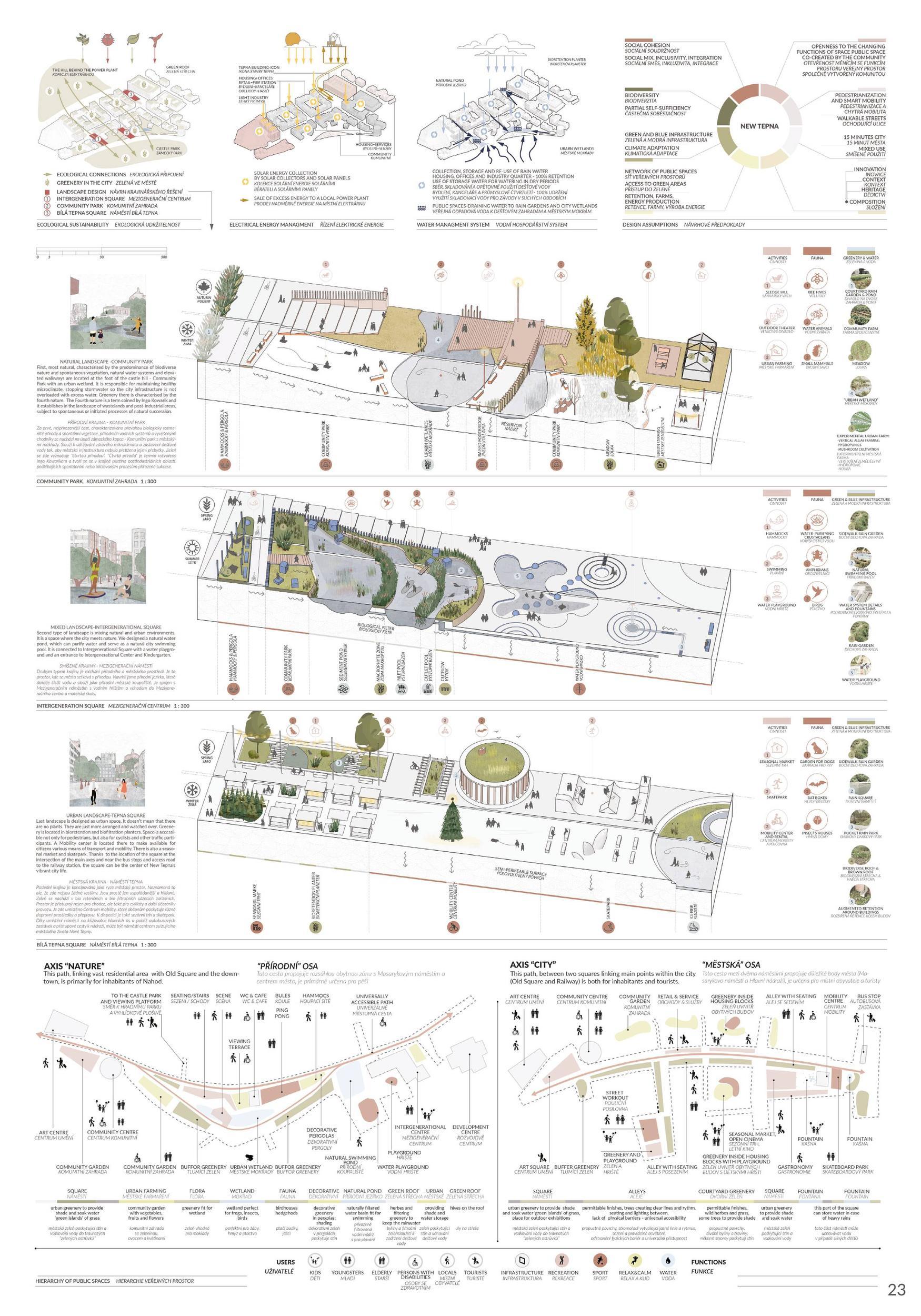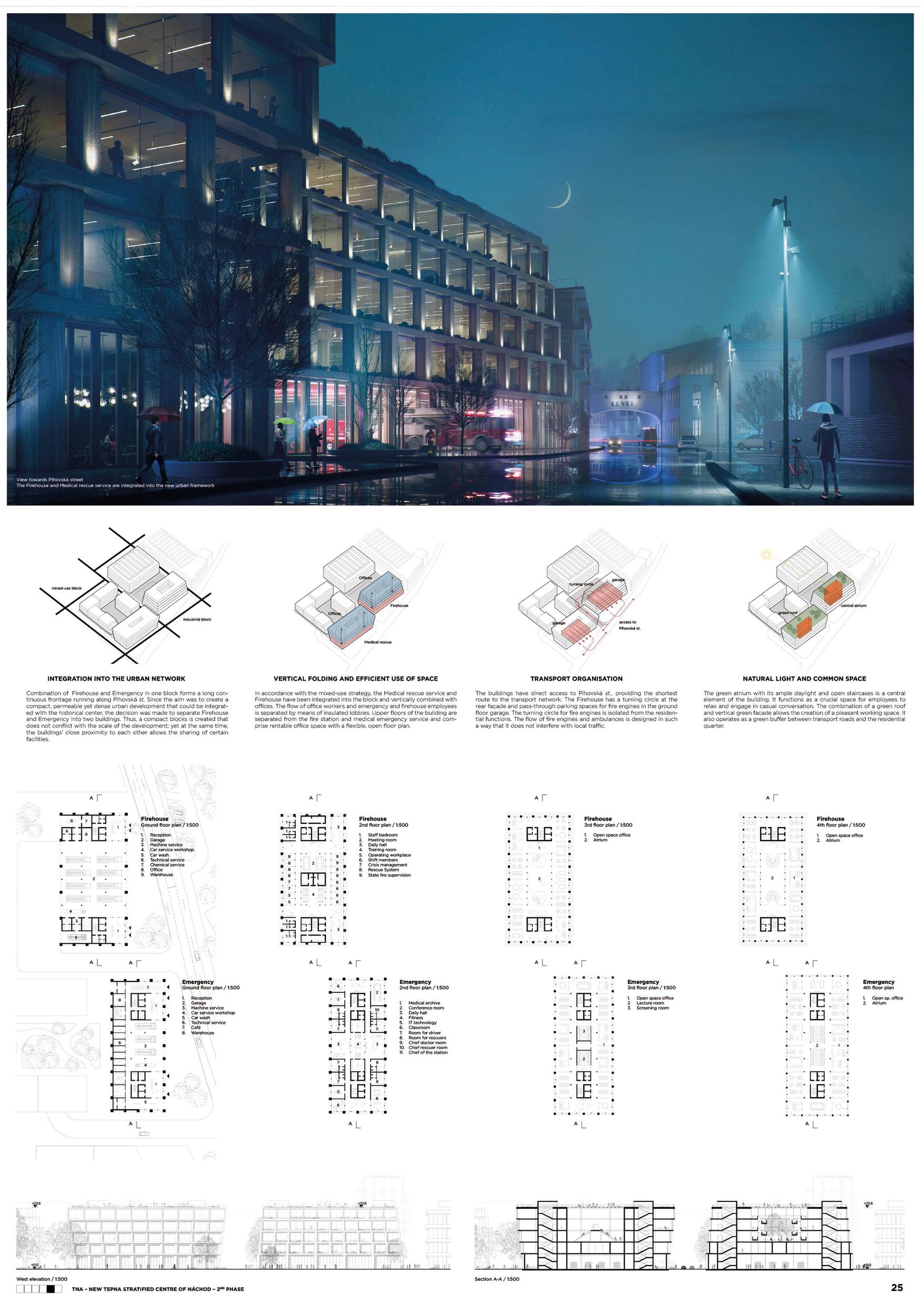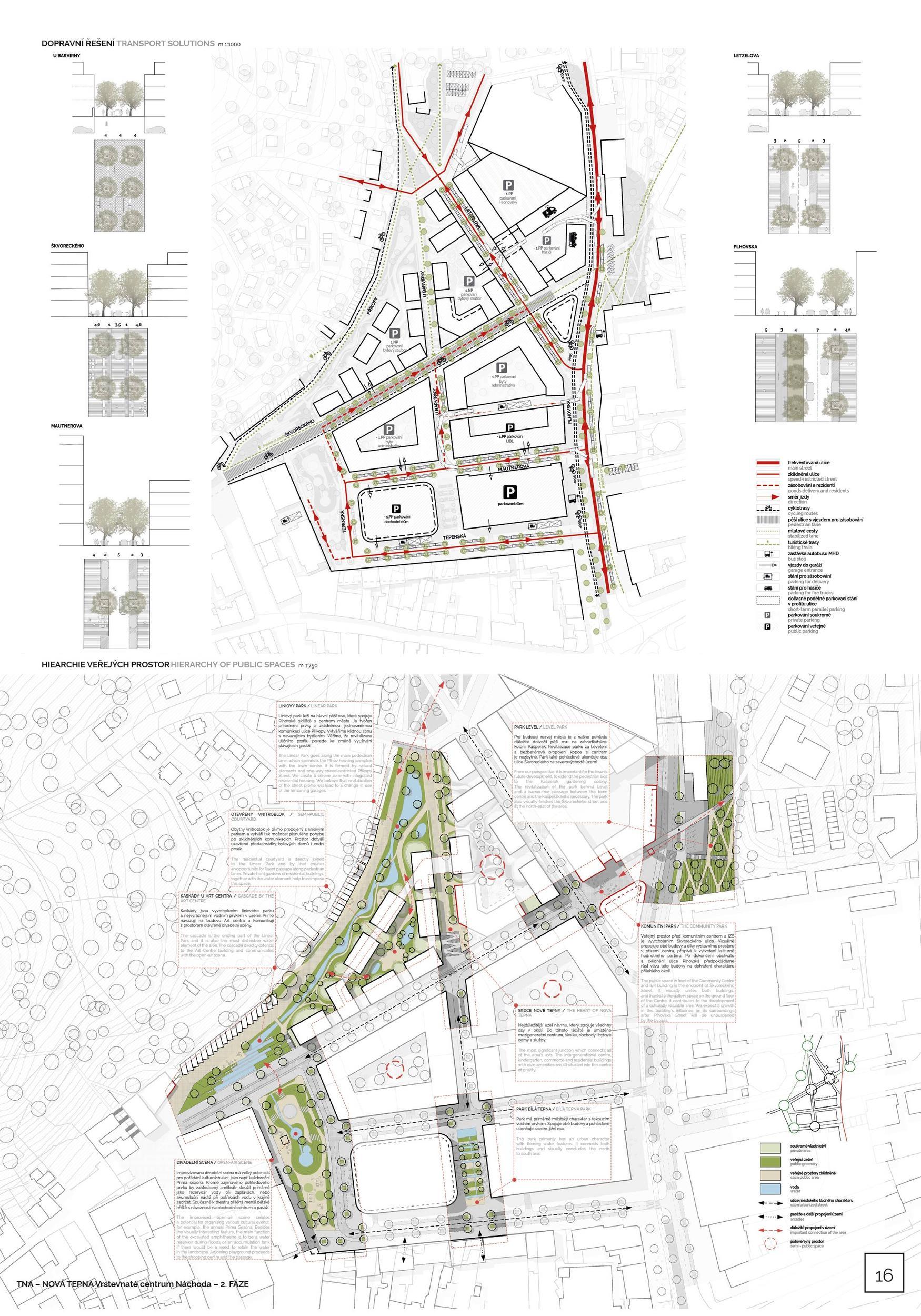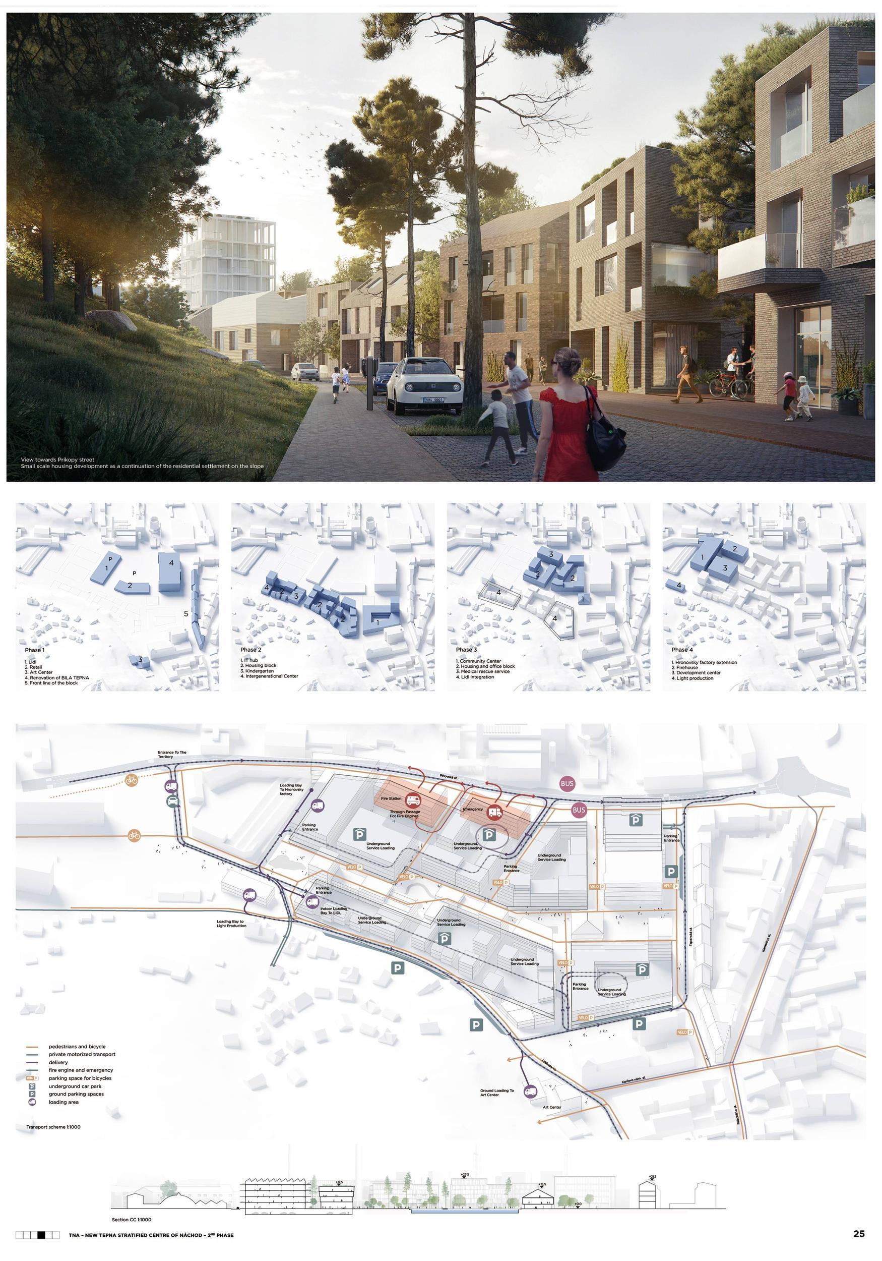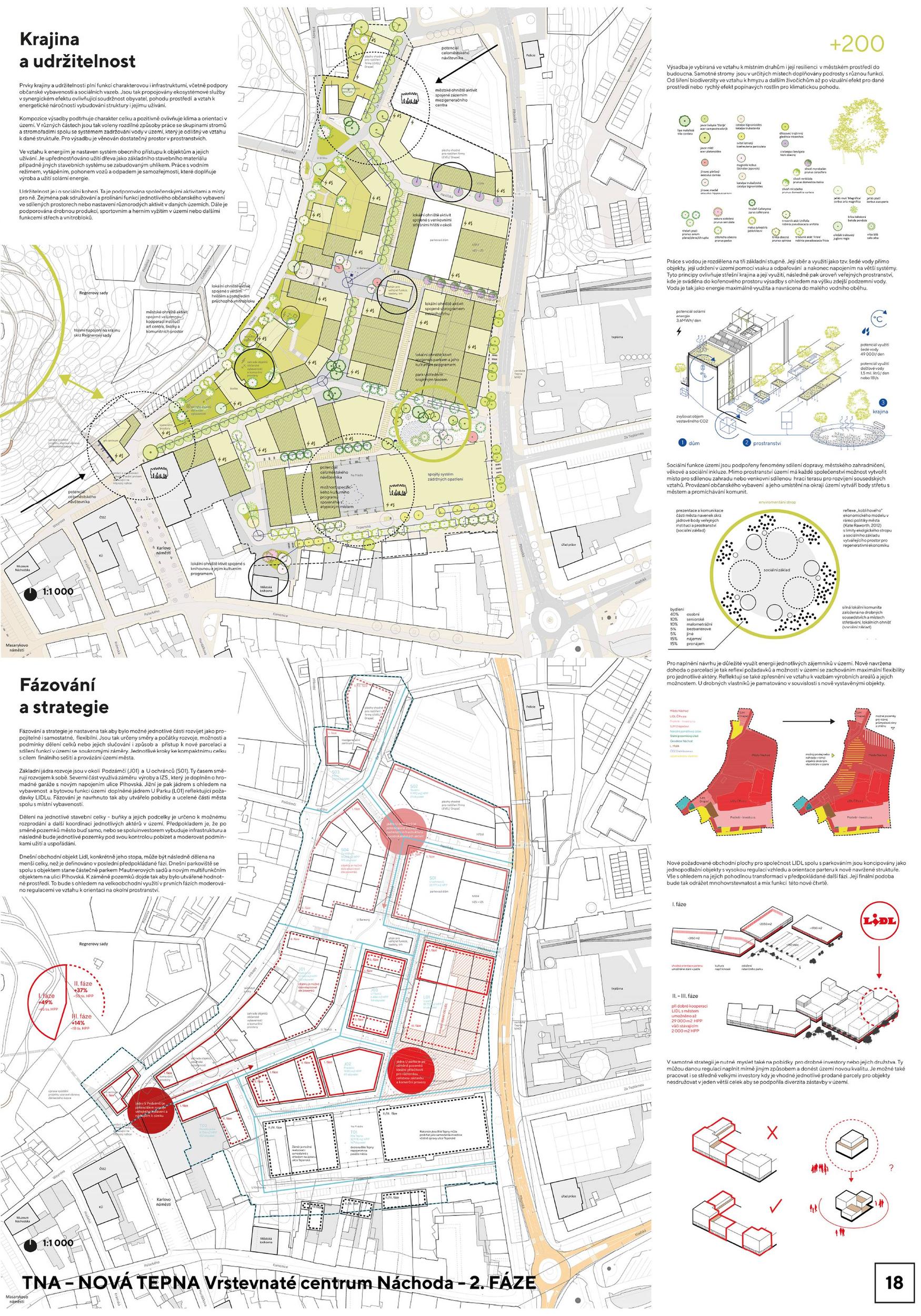 Autoři návrhu velmi dobře trefili urbanistické měřítko a v práci s jednotlivými městskými prostory si počínají velmi zdatně. Jejich konkrétní fyzická forma je přesvědčivá svým lidským měřítkem a jistě by nabídla příjemnou atmosféru. Trojúhelníkové náměstí severně od objektu Tepny ve vazbě na komín a výhled na zámek je povedené, stejně tak poloha pro významnou městskou instituci, na kterou se vážou vedle tohoto náměstí ještě další dvě boční náměstíčka. Návrh dobře reaguje na vlastnické poměry v místě a stávající stavby, přesto mu chybí jistá elegance v celkové organizaci prostoru. Poněkud nedořešená je vazba na zámek a příliš úzký stavební blok u Příkopů. Menší stavební bloky vytváří hustou síť uliček a náměstí, která je však v této poloze města diskutabilní, protože rozlévá energii obchodního parteru do příliš velkého území. Určitá koncentrace pohybu lidí přináší atraktivitu a oživení ulic, protože počet uživatelů žijících v okolí těchto prostor je již daný. Menší stavební bloky také omezí způsob fázování a práci v čase při proměně území. Není úplně jasný záměr s jižní frontou ulice Tepenská. Nemá se zacelit a „zkompaktnit“, aby jako definice ulice fungovala? Velmi sympatická je možnost na cestě ze sídliště Plhov zvolit cestu více krajinnou, podél úpatí Regnerových sadů, anebo městskou, procházející téměř všemi klíčovými prostory nově navržené čtvrti. Paradoxem návrhu je, že zatímco urbanistické řešení vzbuzovalo jen ta nejlepší očekávání, co se týče atmosféry městských prostorů, architektonické řešení rozhodně nepůsobilo tak malebně. Parkovací dům i budova IZS se zdají předimenzované. Návrh představuje ukázku pochopení důležitosti pohledu na město shora, nabídnutí pestré škály činností odehrávajících se ve výšce, zvláště pak v kombinaci s řešením zeleně a dláždění nových ulic a náměstíček. Velmi oceňujeme důslednou práci s průhledy na místní dominanty, ať už historické, tak ty industriální.