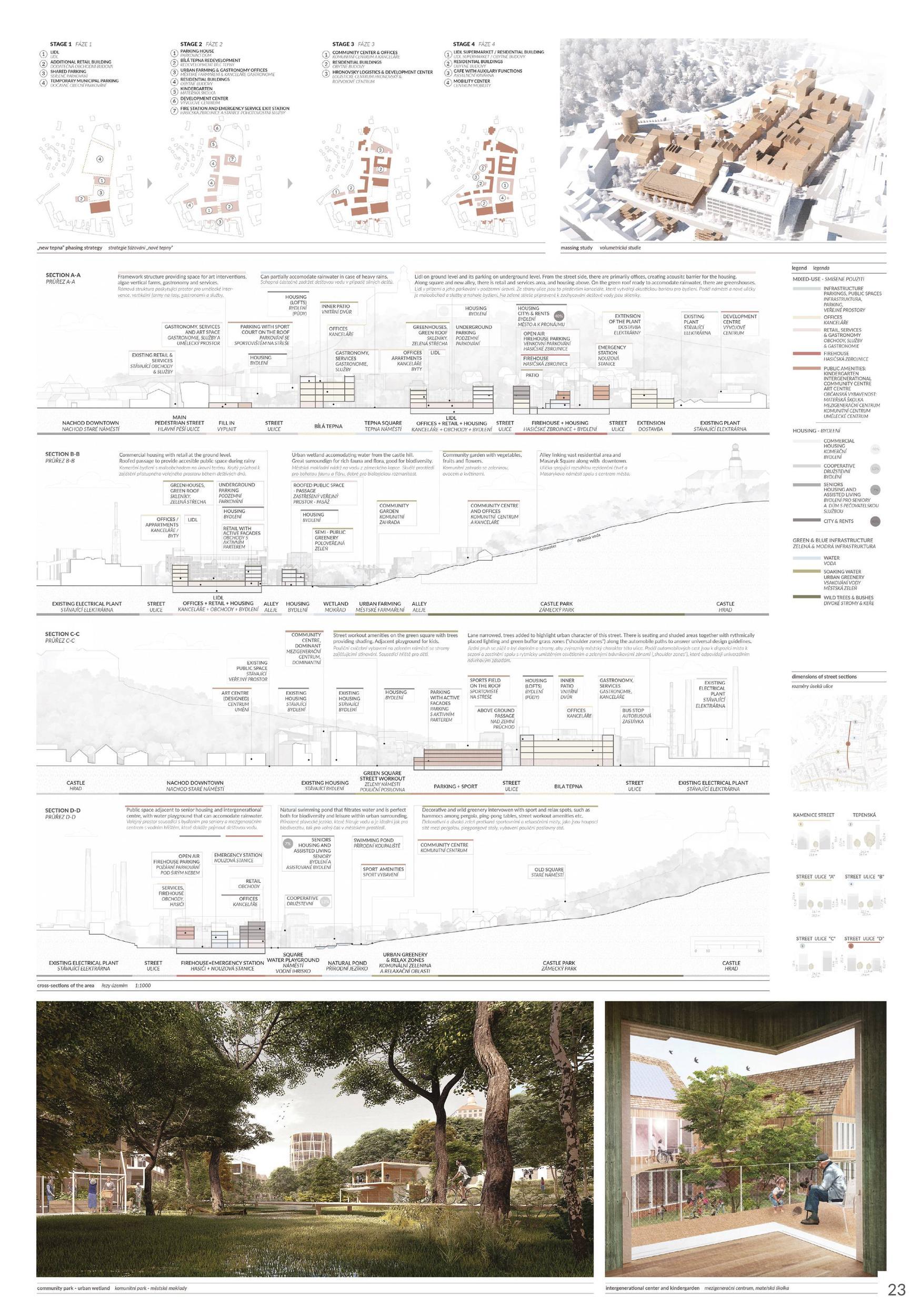 Autoři návrhu člení území na větší stavební bloky, které jsou praktické pro různé druhy využití a umí lépe reagovat na složitější majetkové poměry. Například blok, kde se nachází LIDL může svou velikostí nabídnout více možných scénářů pro budoucí využití, než když by byl rozdělen na menší. Silnou stránkou návrhu je dále prostor podél zámeckého parku, kde vzniká pěkná hrana veřejného prostoru. V tomto pojetí by však návrhu slušela úprava soukromých garáží, která je však v dohledné době obtížně představitelná. V celkovém prostorovém ztvárnění ulic a náměstí návrh, bohužel, již není tak přesvědčivý a plně nevyužívá potenciál místa. Náměstí U Přádelny je tvarově hůře čitelné a rozpadá se do více volných prostor bez jasné hierarchie a tvarování. Podobně pak i náměstí u historického centra nemá kolem sebe dostatek uzavření fasádami, aby jej člověk jako náměstí mohl skutečně označit. Trasování uličních os vyvolávalo u poroty otázky. Zřejmé bylo napojení na Karlovo náměstí mířící na náměstí U Přádelny. Odtud vedoucí ulice ale postrádají návaznost. Končí většinou fasádou a T křižovatkou. Přirozená cesta ze sídliště Plhov na Masarykovo náměstí je vedena pod úpatím zámeckého vrchu, de facto současnou cestou. Není tedy jasné, co bude přivádět pěší do nově definovaného centra. Zvolené měřítko hmot budov je uživatelsky přátelské. Dlouhé fasády podél hranice řešeného území by mohly být občas obohaceny o průhled zejména u komplexu parkovacího domu a IZS. Pohled z ptačí perspektivy prozrazuje jemné tvarování a uskakování střech, v nejvyšších podlažích vytváří terasy náležející k bytům. Tvarování a jemné rozehrání však porota považuje spíše za formální, čemuž napovídá i plošné přetažení střech zeleným kobercem, u kterého není přesvědčivě prezentována a dotažena jeho využitelnost pro obyvatele horních bytů a už vůbec ne pro kohokoliv jiného. Výjimku tvoří pouze víceúčelové hřiště na budově Integrovaného záchranného systému.