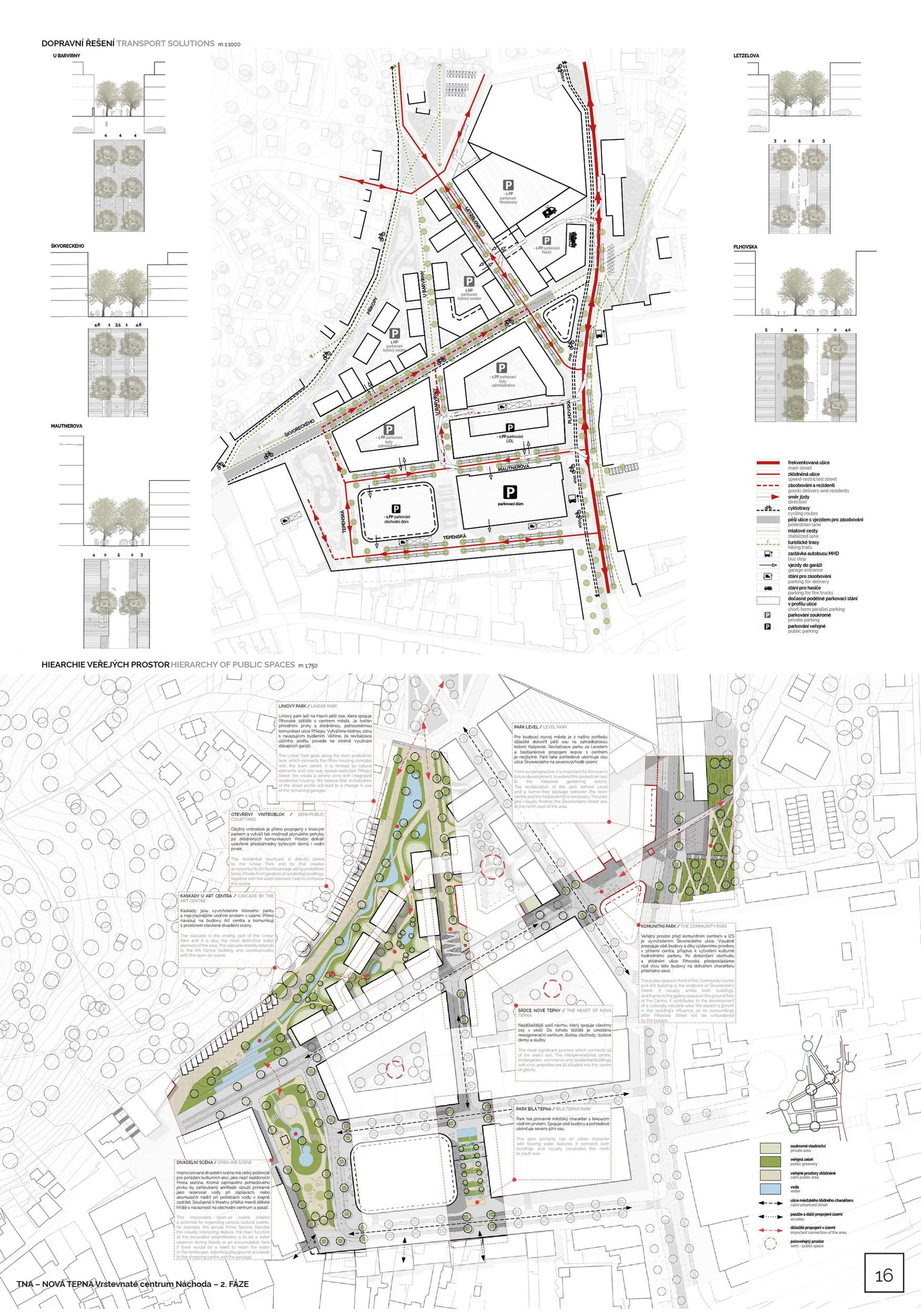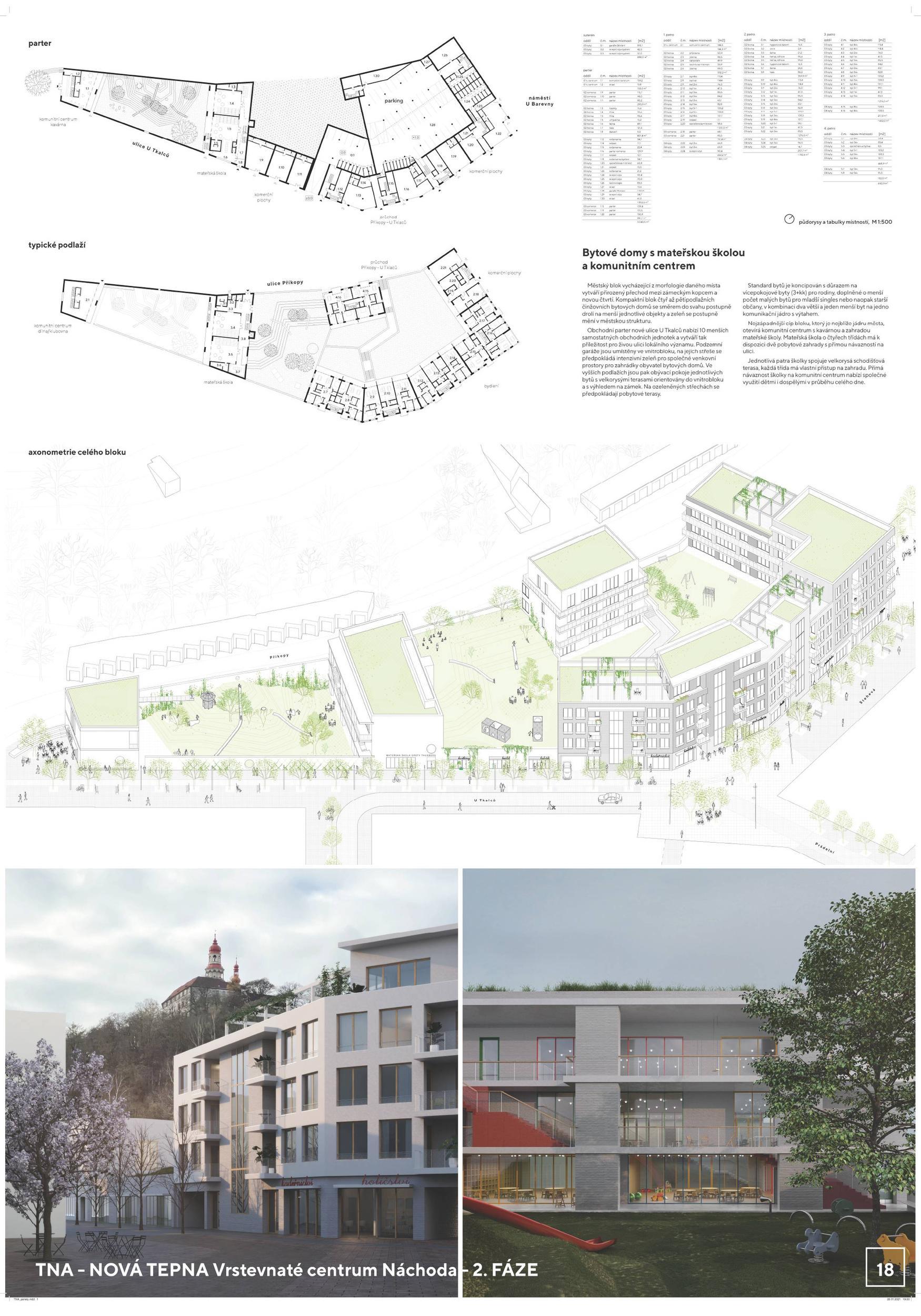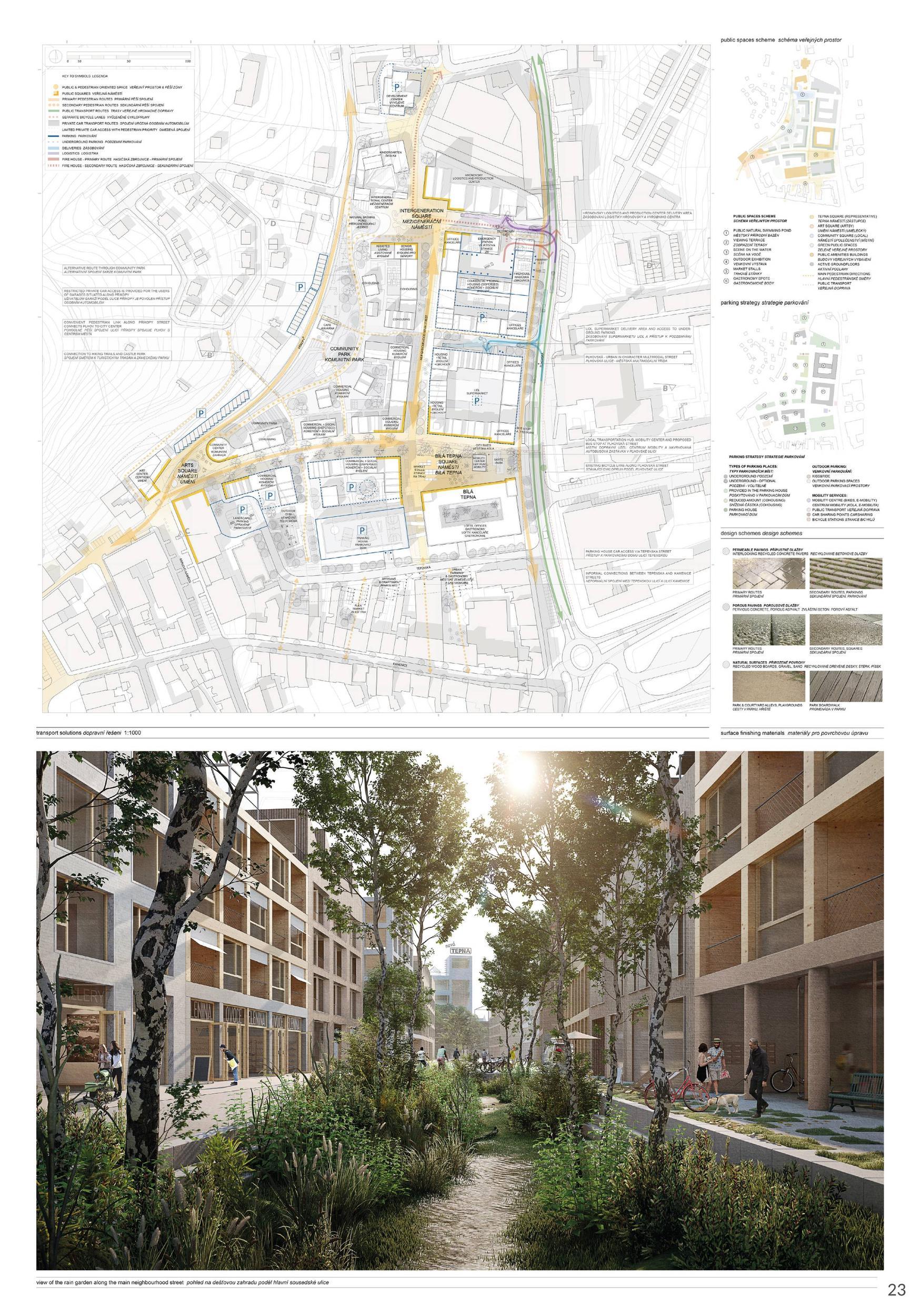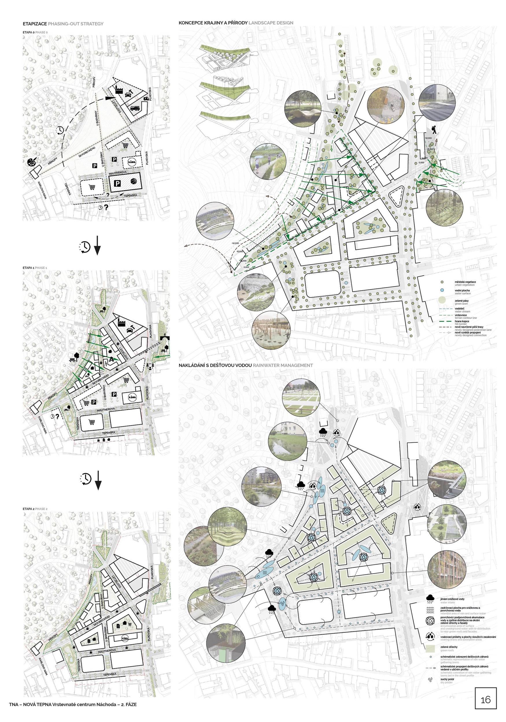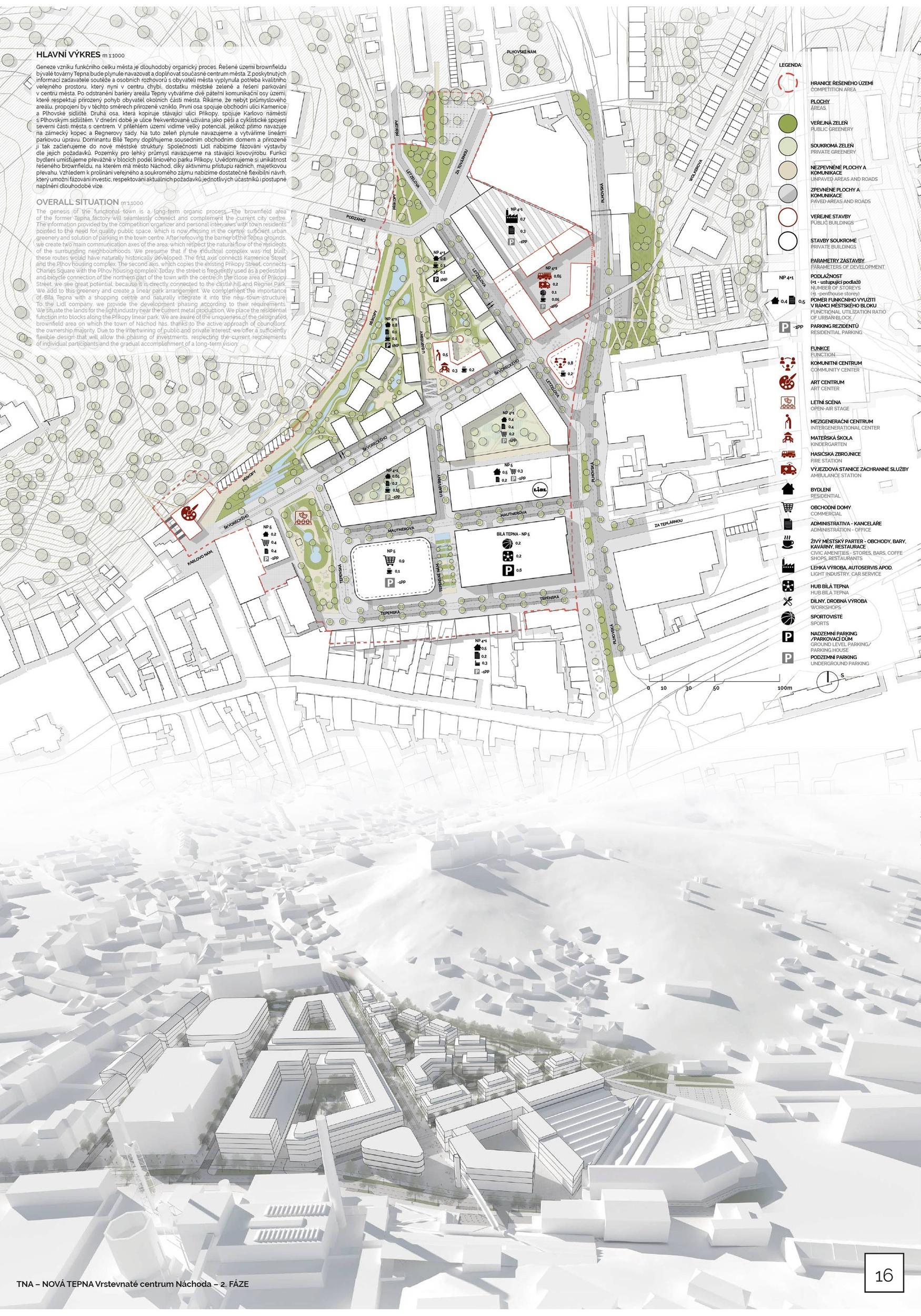 Jedním ze základních principů návrhu je přeložení a otevření Radechovského potoka, který by se měl stát jistou páteří nové výstavby. Středem nové výstavby by se tak měl vinout veřejný prostor přístupný pouze pro pěší a cyklisty, přičemž obsluha automobilovou dopravou by byla pouze po obvodu. Tato premisa severojižní osy s sebou nicméně nese nutnost demolice rohového domu při ústí do Palackého ulice. Bez tohoto zásahu by princip ztratil svůj šarm a smysl. Lze si však jen obtížně představit, že by se návrh demolice setkal se vřelým přijetím veřejností, a tak je tento jinak kvalitní návrh, bohužel, obtížně realizovatelný. Městské prostory jsou navrženy citlivě a přiměřeně, stejně tak rozložení budov dává jasnou představu, že se jinak jedná o životaschopný plán. Diskutabilní však zůstává reakce na majetkovou mapu a řešení prodejny LIDL, které nemá možnost časové etapizace. Porota ocenila hlavně pestrost městských prostorů proměňující průchod ze sídliště Plhov do centra v urbánní příběh. Dvě elegantní výškové dominanty při vstupech do území hodnotí porota kladně. Zbývající výšková hladina s převážně plochými střechami je možná až příliš klidná a monotónní, neodpovídající rozehrané urbanistické struktuře. Díky převládajícímu přetažení střech pravidelnou soustavou solárních panelů tak celá čtvrť působí spíš dojmem vývojového centra uprostřed malého města. Doplnění některých částí o skleníky, hřiště i jiné než ploché střechy se uplatnilo jen v malé míře a náznaku.