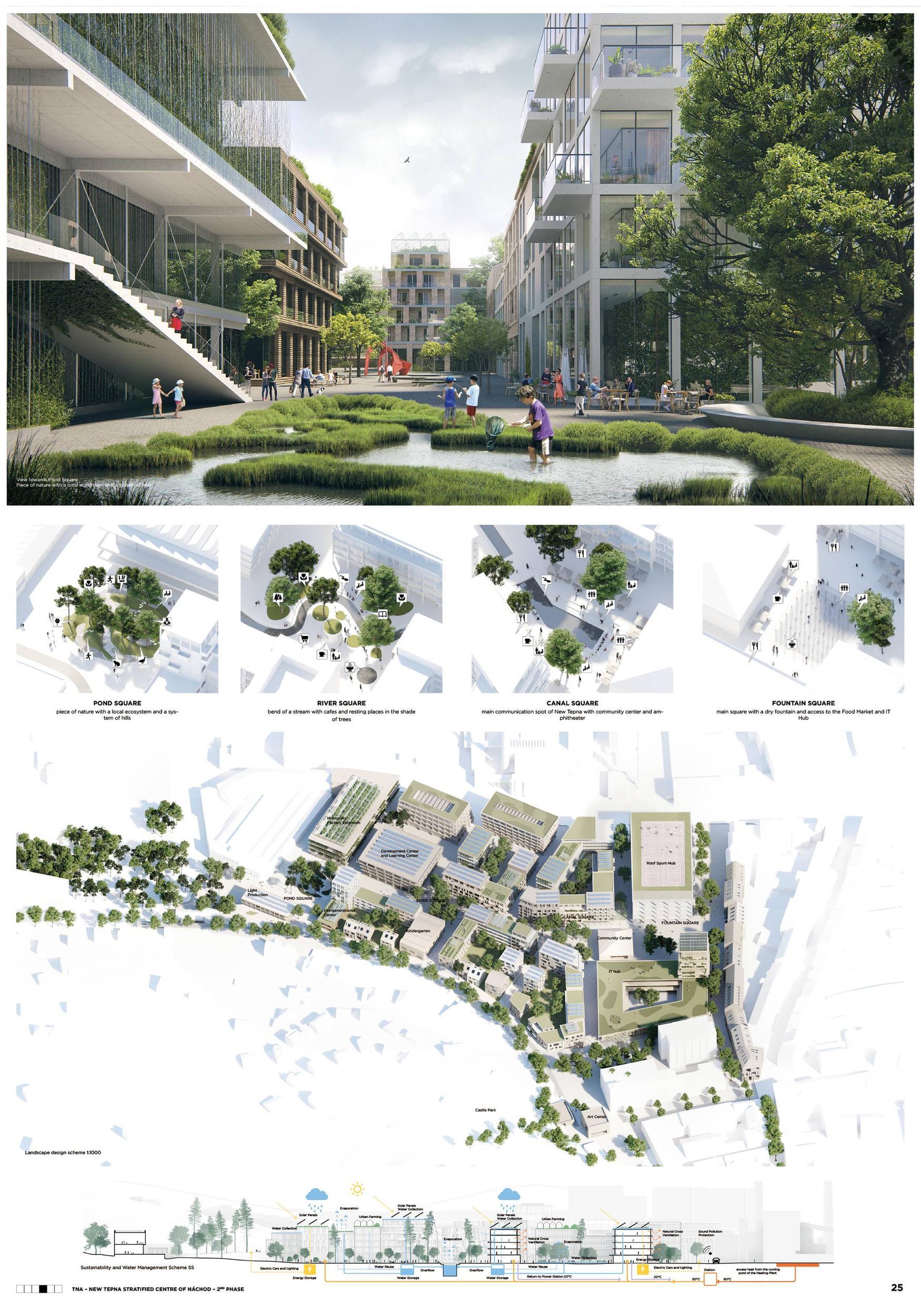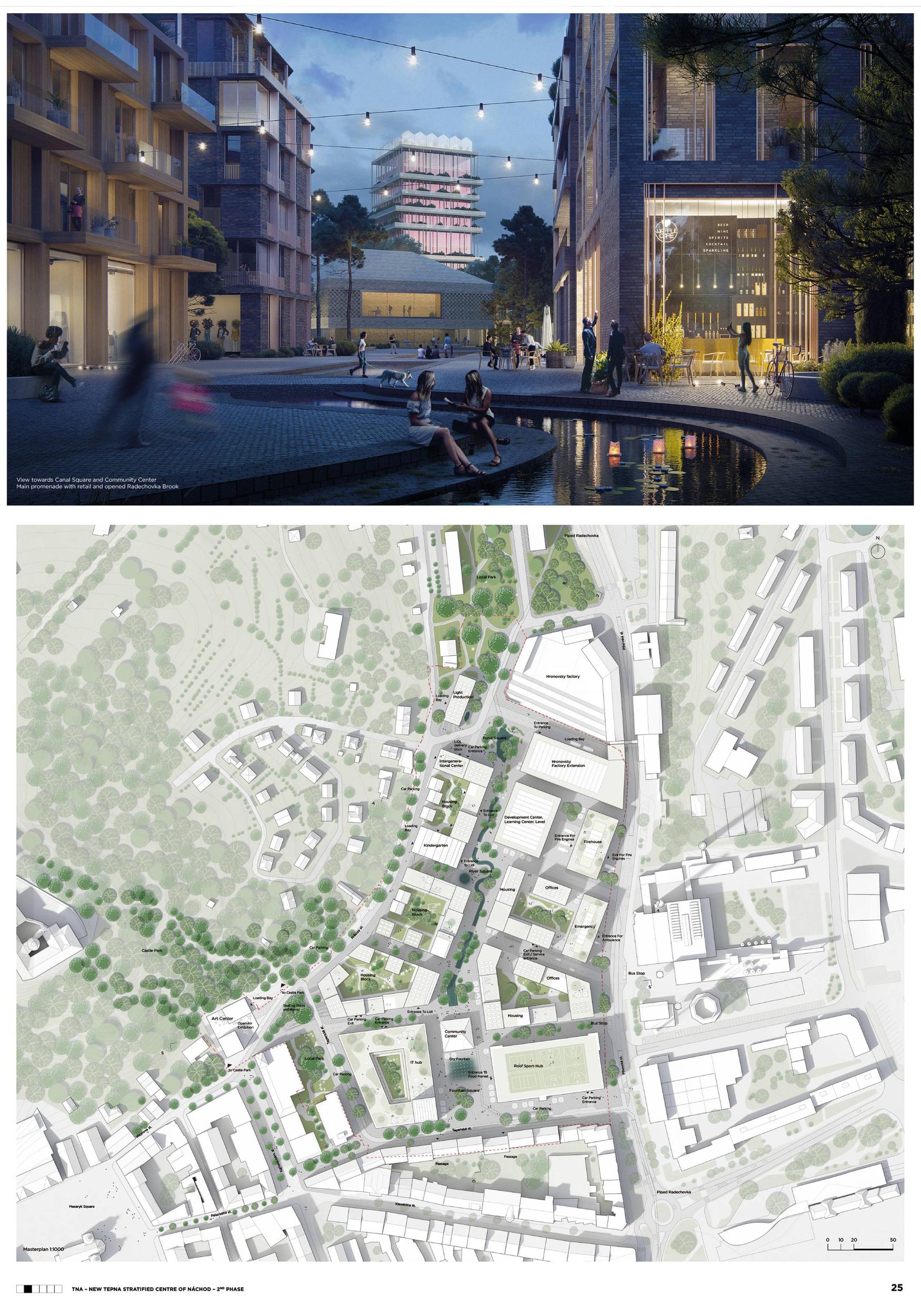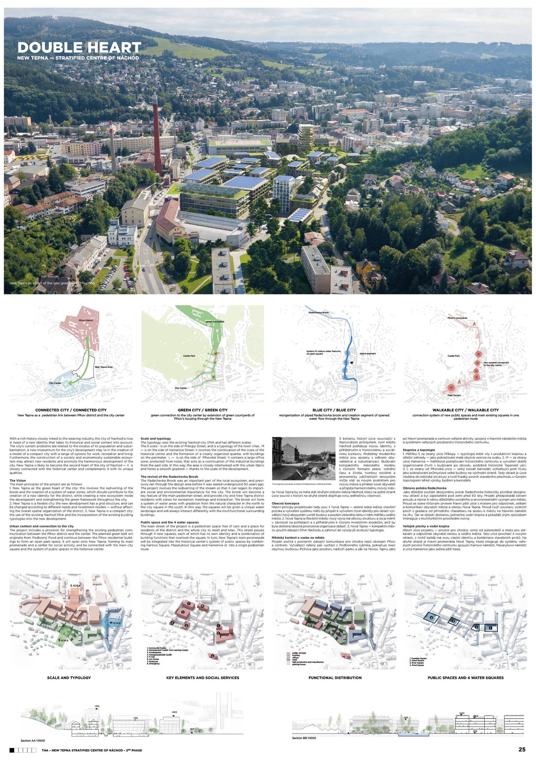 Návrh si po všech stránkách zaslouží první místo, protože jeho autoři nejlépe pochopili vztahy v území a vyřešili jejich doplnění novou vrstvou. Založení dvou os, které vycházejí od navrženého náměstí u Tepny logicky a přehledně člení území na urbanistické bloky. Zásadním jevem těchto os je, že někam vedou, že mají začátek a konec v místech dalších vložených významů. Osa od historického jádra, která je natvarovaná do příjemné měkké křivky a ústí do nového náměstí u Tepny, nabídne krásný pohled na věž zámku a na druhé straně na industriální stavby s masivním komínem. Severní propojení směřuje k menšímu komunitnímu náměstí, odkud je vazba na hlavní ulici a zástavbu pod zámkem. Podružná dělící ulice také není umístěna náhodou a vizuálně se napojuje na jádro nově založeného parku na jedné straně a vysoký komín na straně druhé. Nový park doplňuje masiv vzrostlé zeleně pod zámkem a umocňuje její dojem. Plán je jednoduchý a přehledný, respektuje ve velké míře stávající stavby a majetkové poměry v místě. Jednotlivé stavební bloky lze postupně zaplňovat v čase a není nutné je jako celek stavět najednou. To je pro další uvažování, jak toto zanedbané místo v těsné blízkosti centra zvelebit, naprosto určující. Plán obsahuje jasný systém center, vymezuje pole prostorového účinku městské atmosféry a pracuje s promyšlenou gradací. Při detailnějším zpracování doporučujeme zvážit vazbu na park, protože jeho přesnější vymezení stavbami by mohlo ještě více umocnit jeho prostorovou kvalitu a zároveň nabídnout ty nejlepší parcely, kde bude výhled do parku i na zámek zároveň. Výrazným prvkem návrhu je práce s vodou. I když míra krajinářského pojetí severozápadního sektoru návrhu je překvapivě vysoká (vzhledem k již existujícímu fenoménu Regnerových sadů), funguje toto pojetí v kontrastu s kompaktní městskou strukturou zbytku návrhu dobře. Návrh dobře s obrazem města, jeho zrnitostí a malebností a také s dominantami stávajícími a doplněnými. Jasná a srozumitelná odpověď na veledůležitou otázku, jak bude začlenění nové městské části do struktury města působit při pohledu z okolních kopců. Soudobá struktura působí nenásilným dojmem a takřka jako by tu byla odjakživa. Návrh střechami vytváří jakousi pátou fasádu, hravě, nenásilně a plasticky tvarovanou, možná i s odkazy na předchozí industriální estetiku místa. Vysoko nad ulice vyzdvihuje další vrstvu poloveřejného prostoru s neskutečně pestrou možností využití, které je pro budoucí uživatele neoddiskutovatelným bonusem.