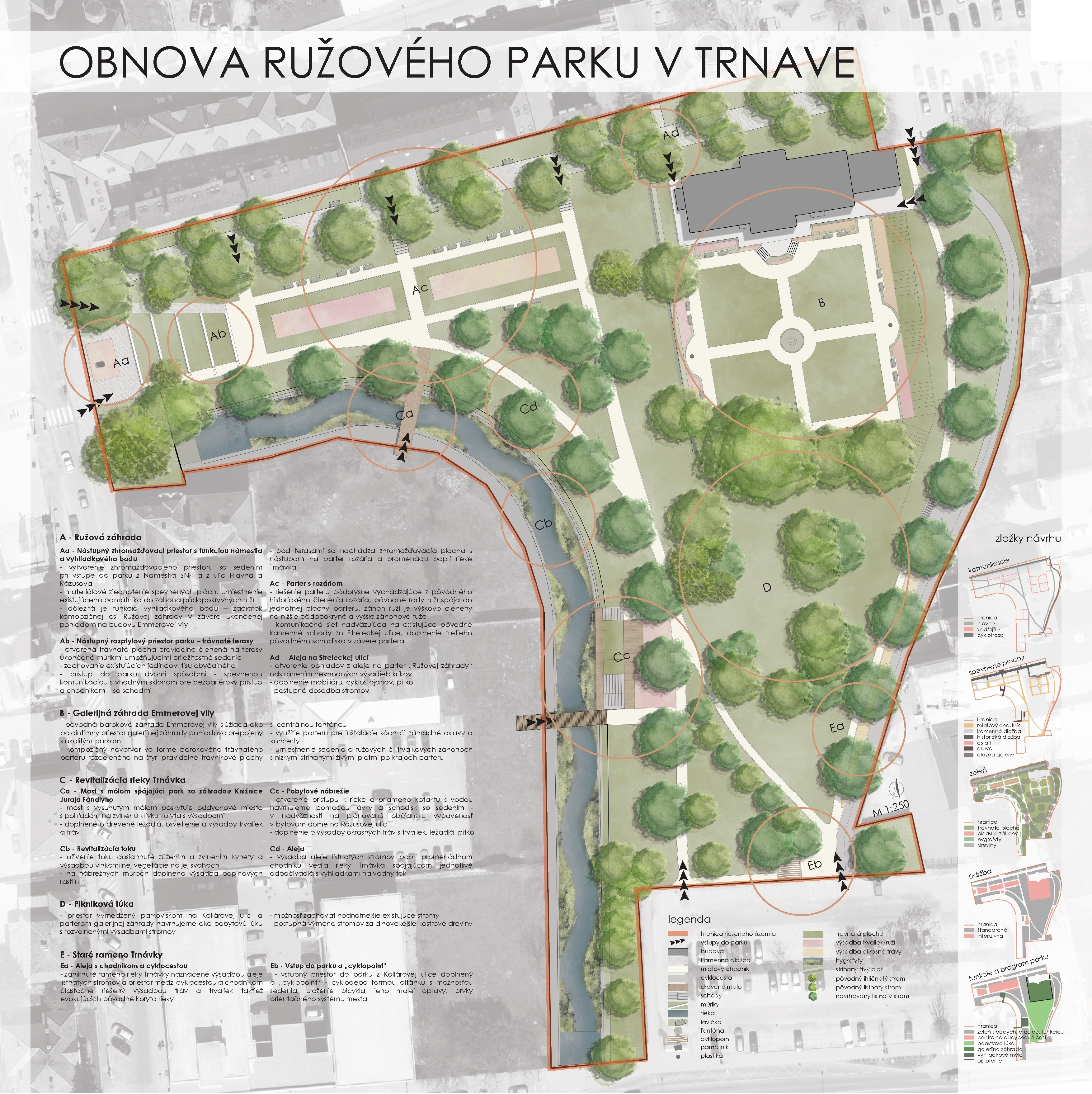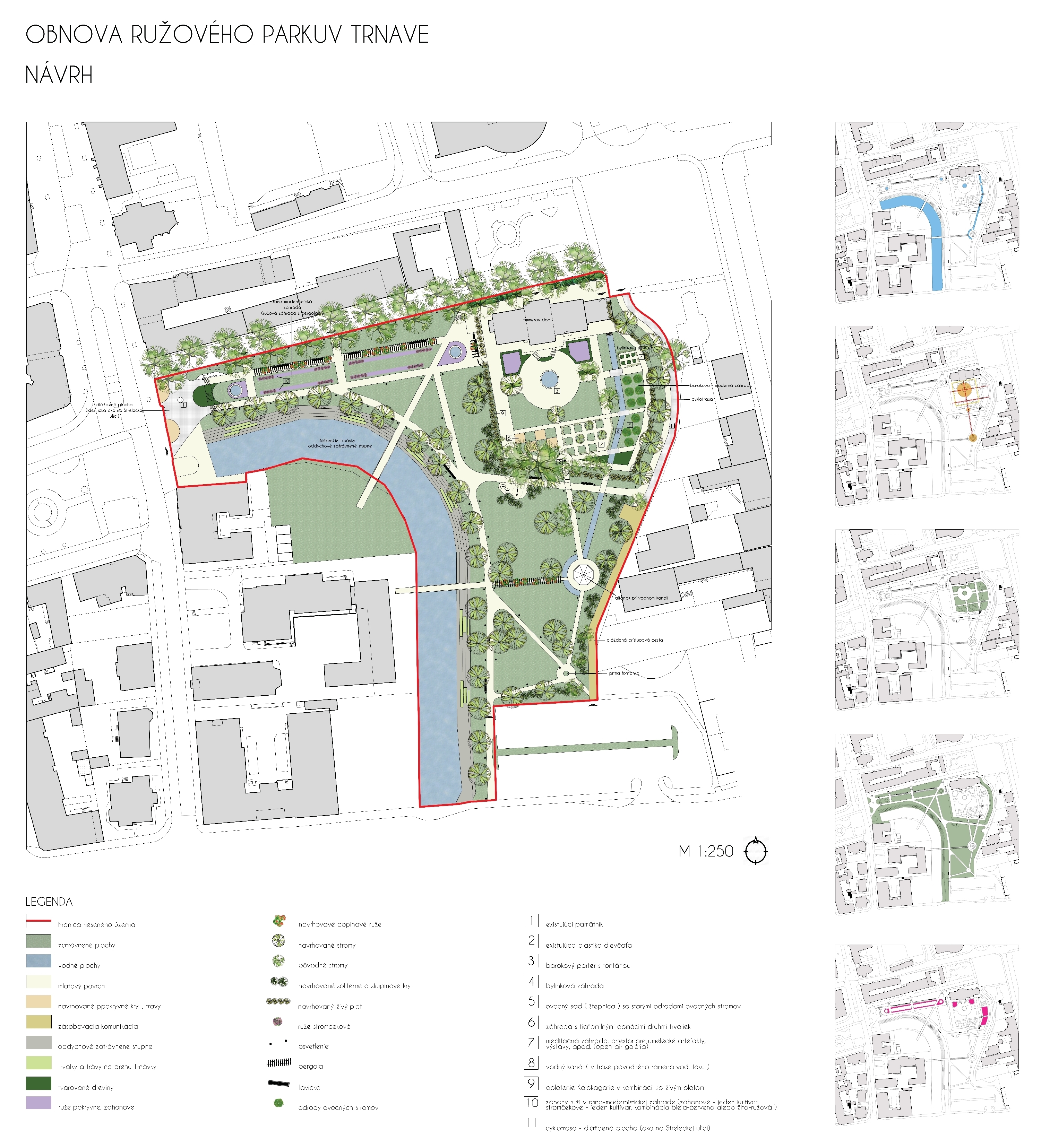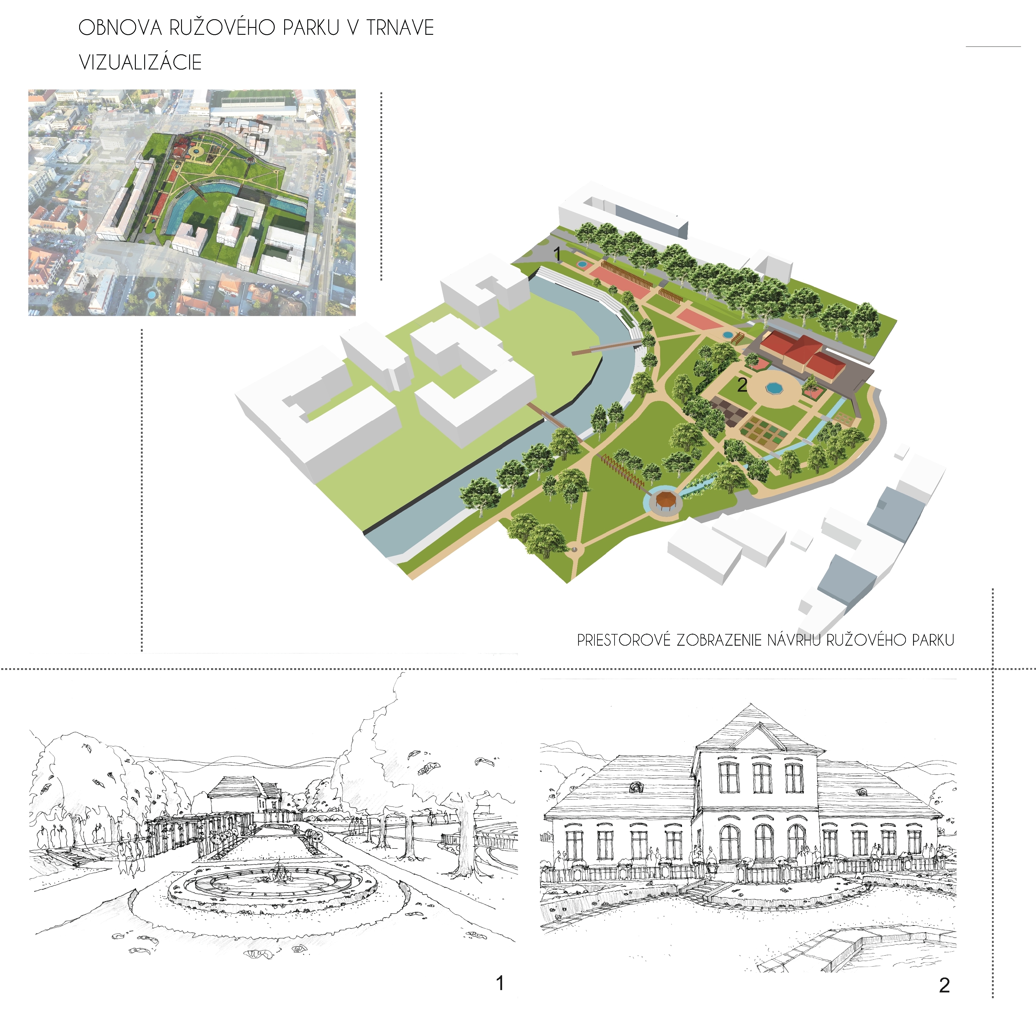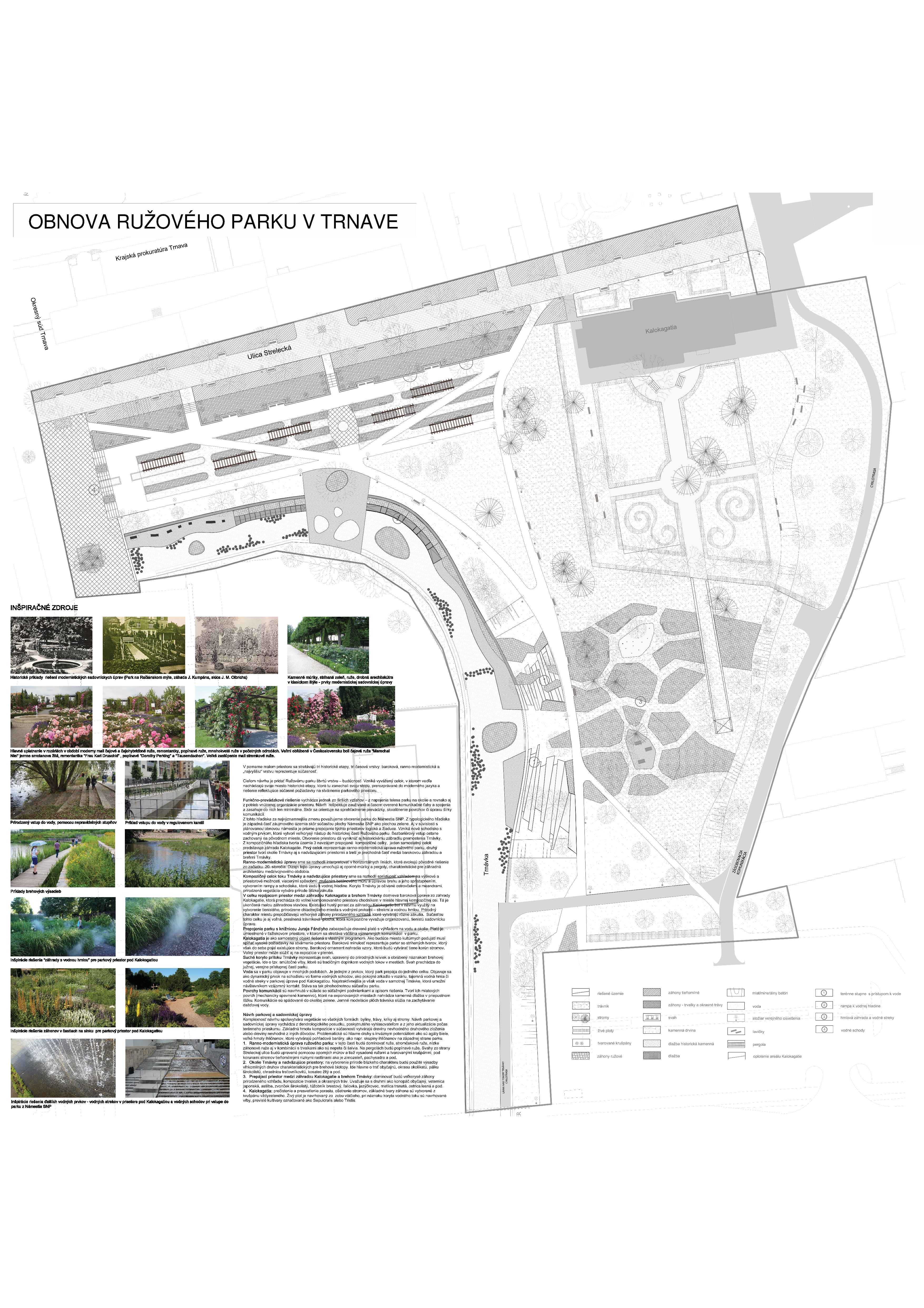 Cieľom návrhu obnovy Ružového parku bolo skĺbiť dve výrazové slohové etapy, a to barokovú pri jestvujúcom objekte Kalokagatie s ostatnou rano – modernistickou časťou parku a bezprostredným okolím toku Trnávky. Priestor parku bolo potrebné ďalej plynule nadviazať na verejný priestor Námestia SNP, ktorý je v zmysle platného Územného plánu centrálnej mestskej zóny Trnava zaradený z hľadiska obnovy medzi mestské priestory reprezentačného charakteru s vysokou mierou zachovanej historickej štruktúry.