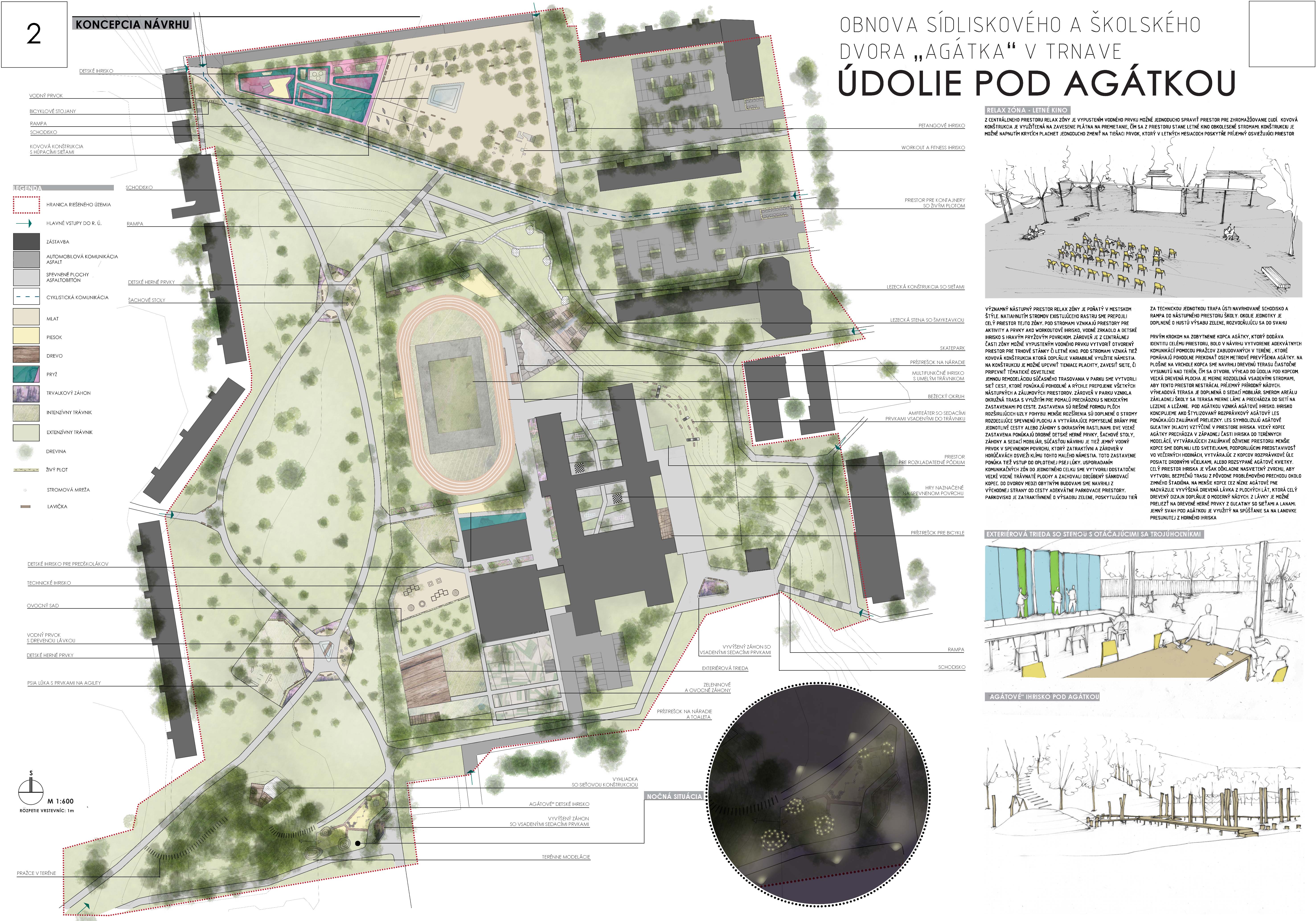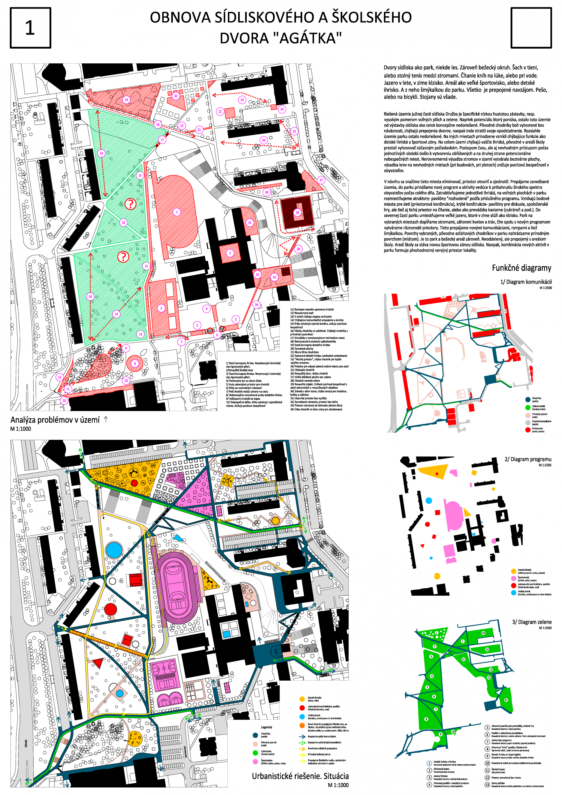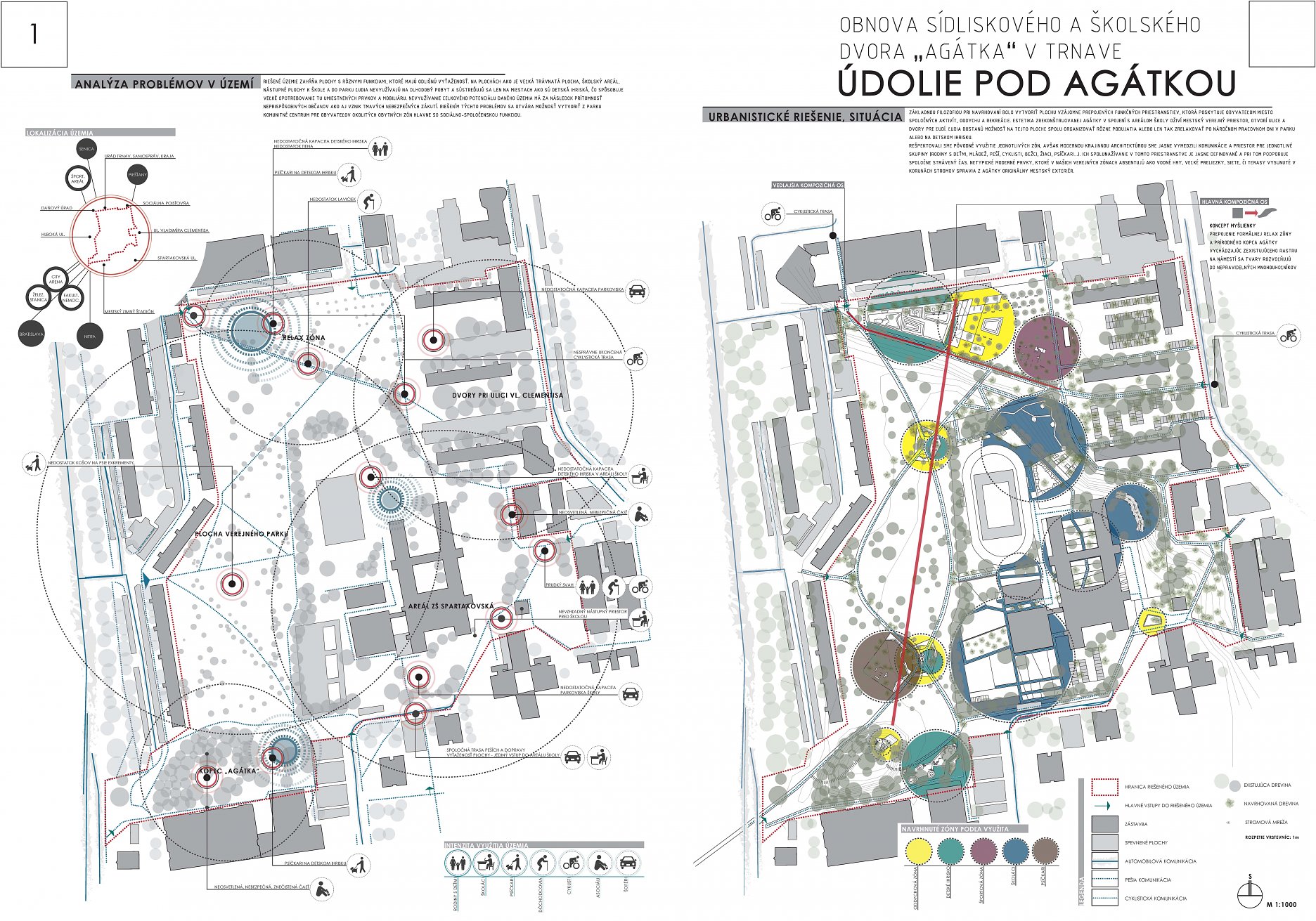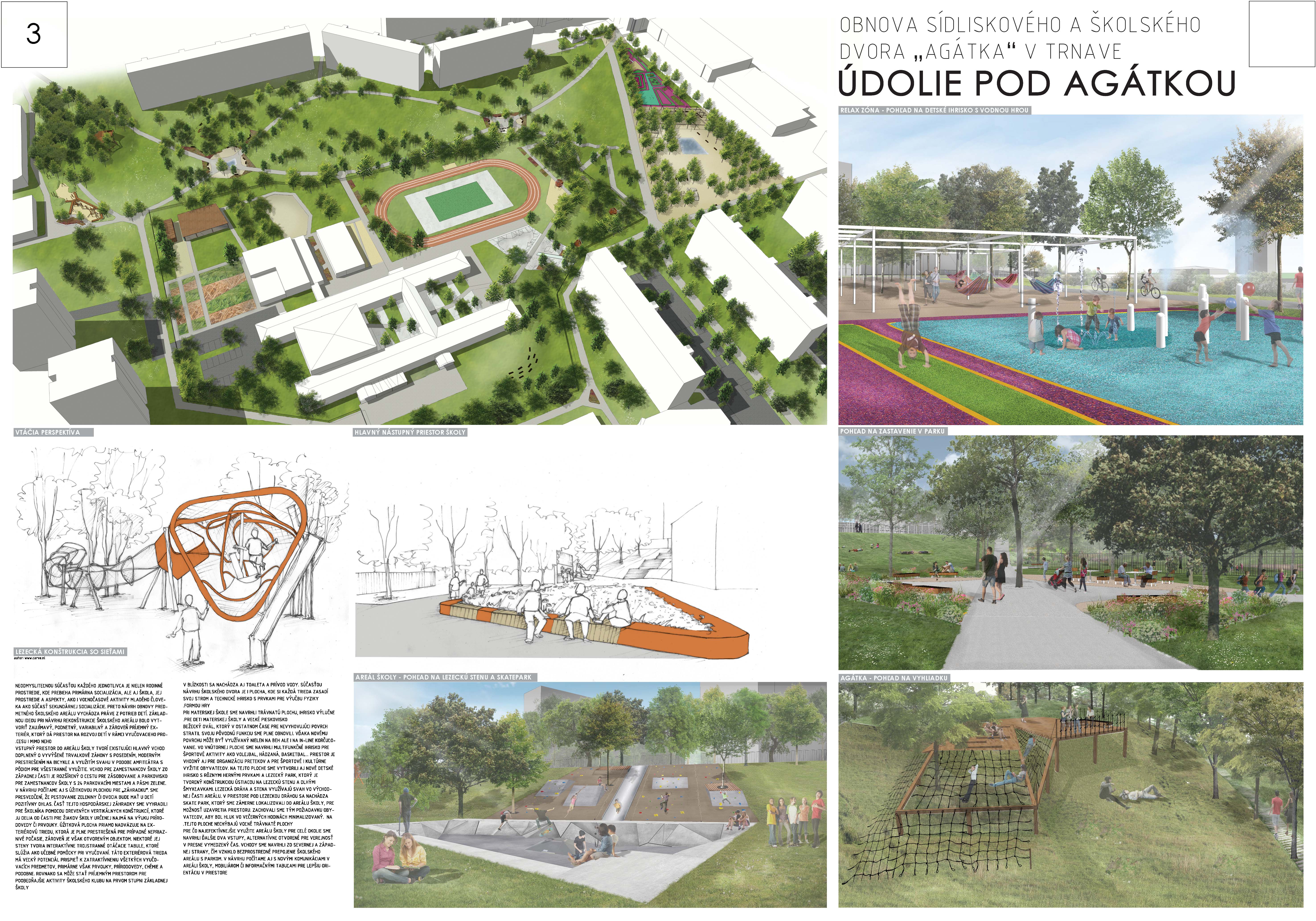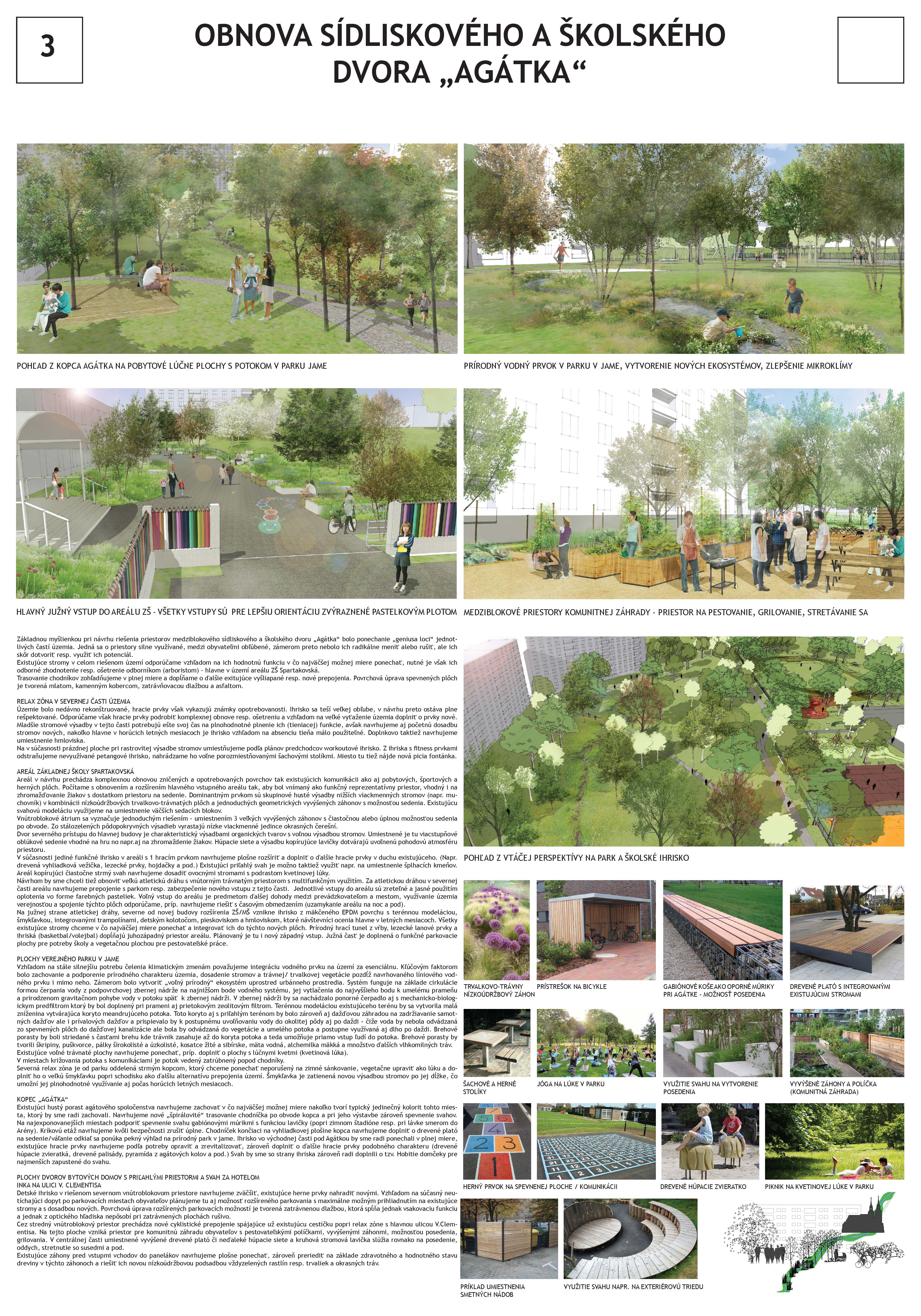 Návrhu príjemne koncipuje pešie trasy v území a napája sa na okolie. Bohužial v mieste ich kríženia vznikajú zbytočné a nevhodne akcentované križovatky - napr. riešenie psieho parku v takejto polohe. Relax zóna je neúmerne spevnená a pomerne nové a využívané detské ihrisko v projekte zaniklo. Navýšenie plochy pre parkovanie vo dvoroch na ulici V. Clementisa nezodpovedá potrebnému navýšeniu počtu parkovacích miest a nerieši zázemie pre obyvateľov vnútrobloku (detské ihrisko pre najmenšie deti). Športové plochy alebo univerzálna multifunkčná plocha pre šport v školskom areáli chýba. Pozitívne hodnotíme rozmiestnenie a prepojenie funkčných zón územia ako aj umiestnenie vyhliadky na kopci Agátka a tiež snahu o navrhnutie jedinečných - atypických detailov riešenia svahu v areáli školy.
