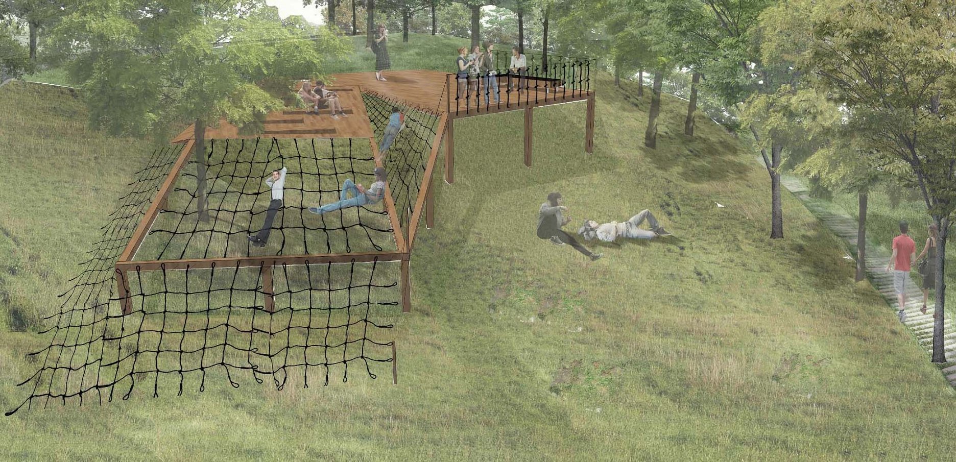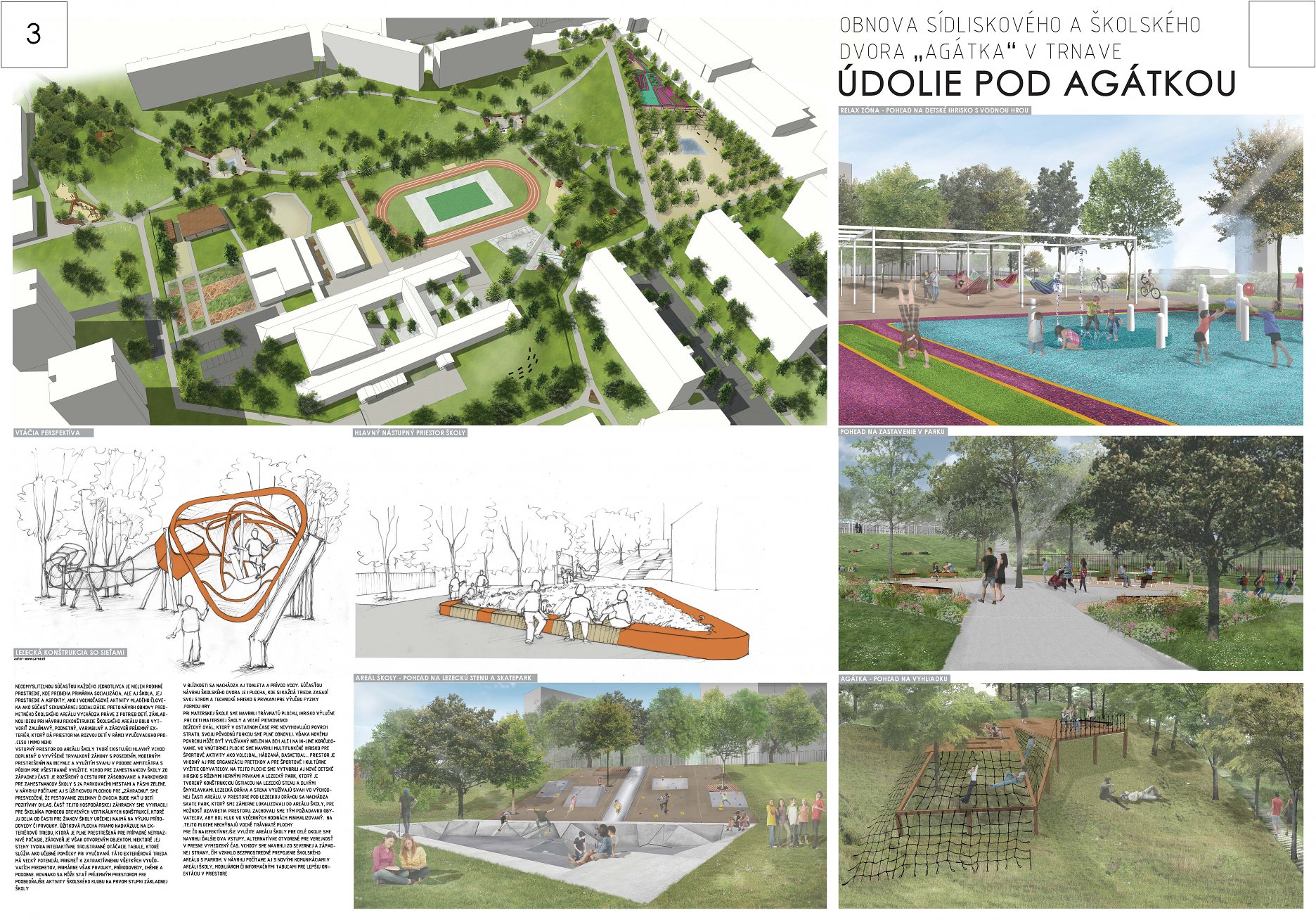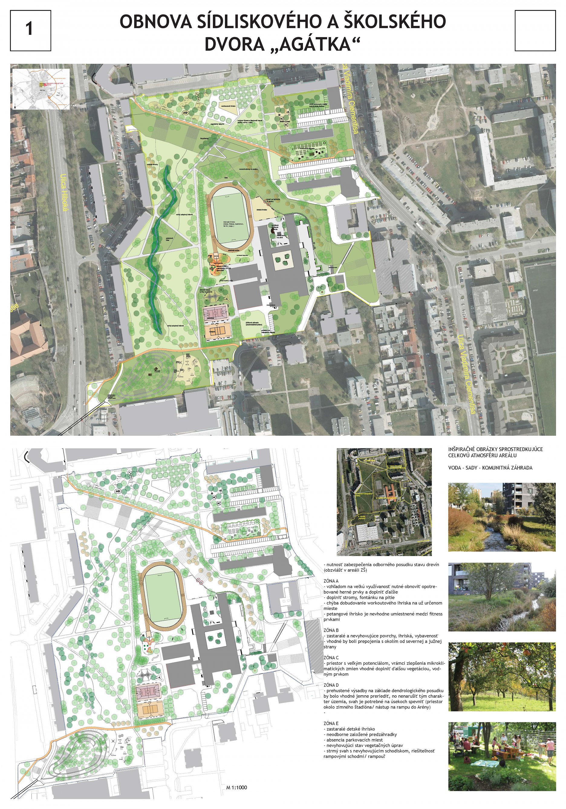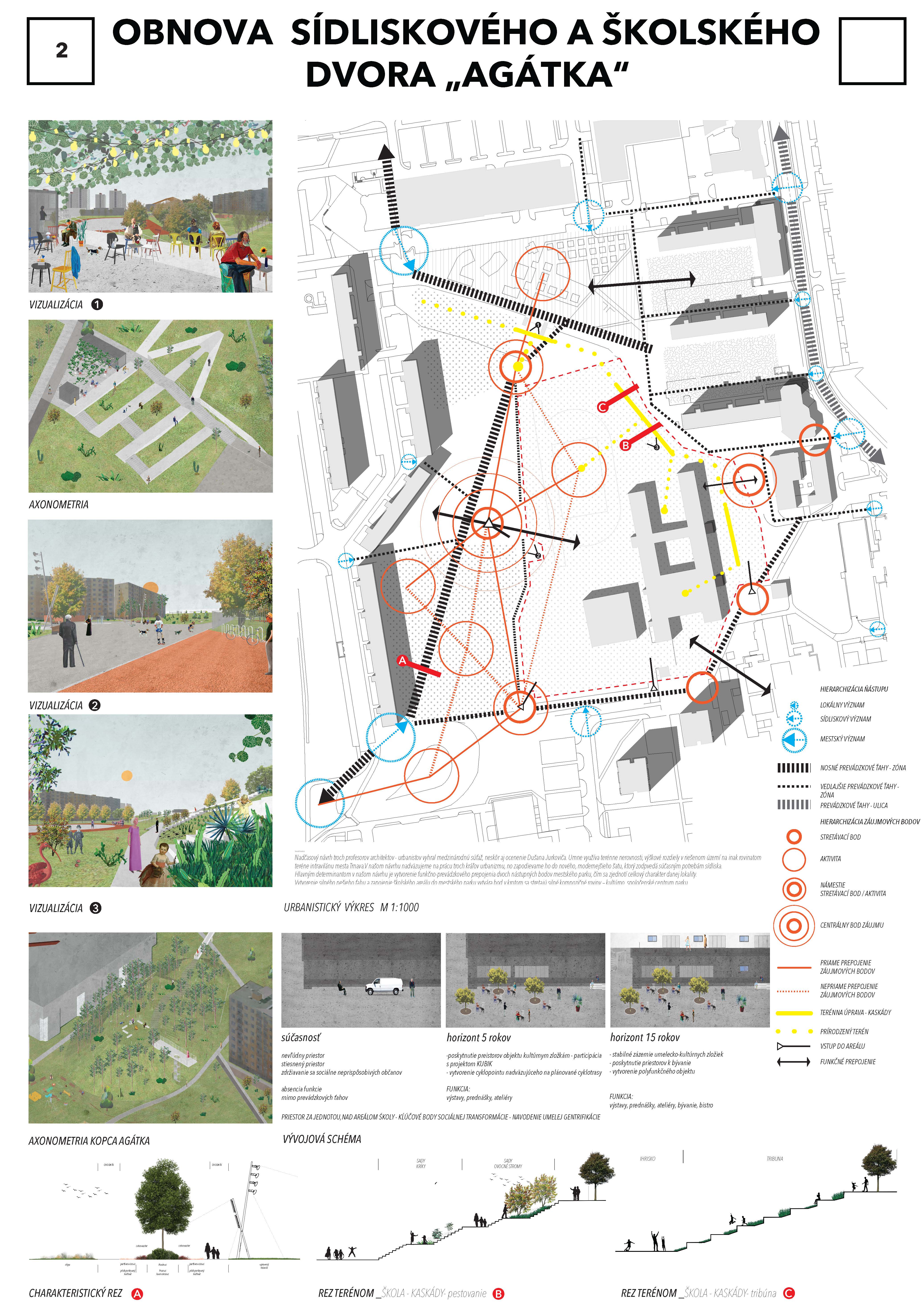 Návrhu príjemne koncipuje pešie trasy v území a napája sa na okolie. Bohužial v mieste ich kríženia vznikajú zbytočné a nevhodne akcentované križovatky - napr. riešenie psieho parku v takejto polohe. Relax zóna je neúmerne spevnená a pomerne nové a využívané detské ihrisko v projekte zaniklo. Navýšenie plochy pre parkovanie vo dvoroch na ulici V. Clementisa nezodpovedá potrebnému navýšeniu počtu parkovacích miest a nerieši zázemie pre obyvateľov vnútrobloku (detské ihrisko pre najmenšie deti). Športové plochy alebo univerzálna multifunkčná plocha pre šport v školskom areáli chýba. Pozitívne hodnotíme rozmiestnenie a prepojenie funkčných zón územia ako aj umiestnenie vyhliadky na kopci Agátka a tiež snahu o navrhnutie jedinečných - atypických detailov riešenia svahu v areáli školy.
