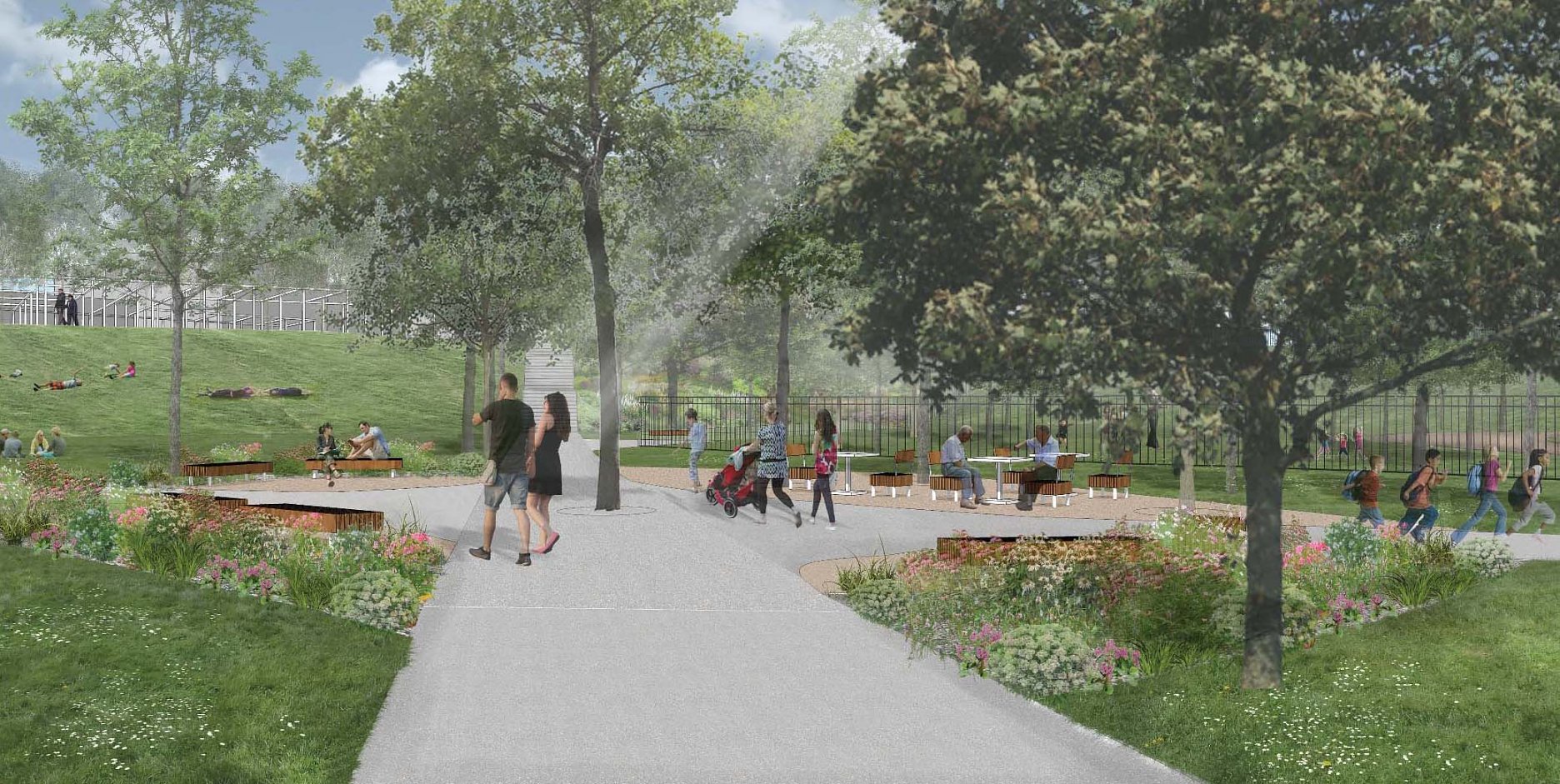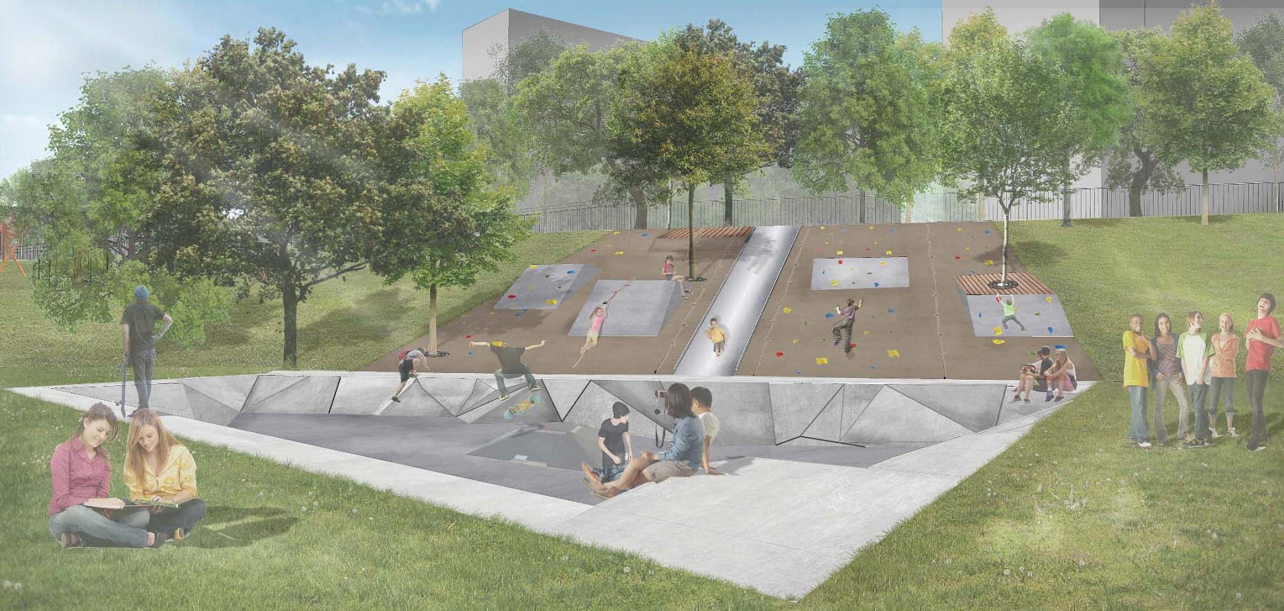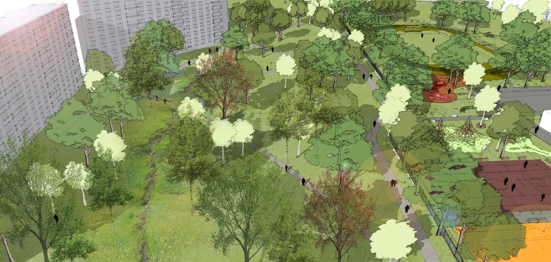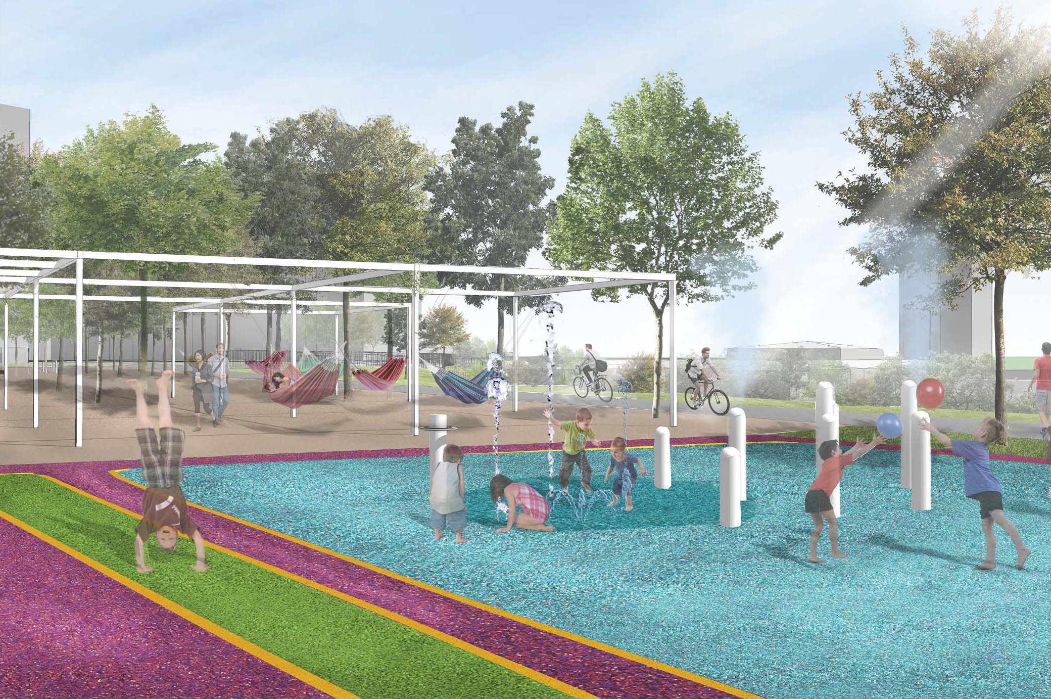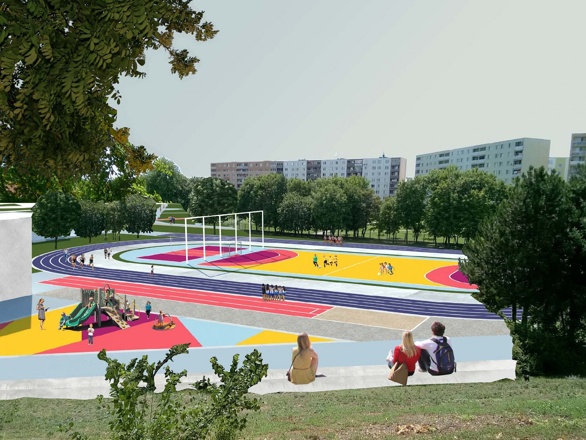 Návrhu príjemne koncipuje pešie trasy v území a napája sa na okolie. Bohužial v mieste ich kríženia vznikajú zbytočné a nevhodne akcentované križovatky - napr. riešenie psieho parku v takejto polohe. Relax zóna je neúmerne spevnená a pomerne nové a využívané detské ihrisko v projekte zaniklo. Navýšenie plochy pre parkovanie vo dvoroch na ulici V. Clementisa nezodpovedá potrebnému navýšeniu počtu parkovacích miest a nerieši zázemie pre obyvateľov vnútrobloku (detské ihrisko pre najmenšie deti). Športové plochy alebo univerzálna multifunkčná plocha pre šport v školskom areáli chýba. Pozitívne hodnotíme rozmiestnenie a prepojenie funkčných zón územia ako aj umiestnenie vyhliadky na kopci Agátka a tiež snahu o navrhnutie jedinečných - atypických detailov riešenia svahu v areáli školy.