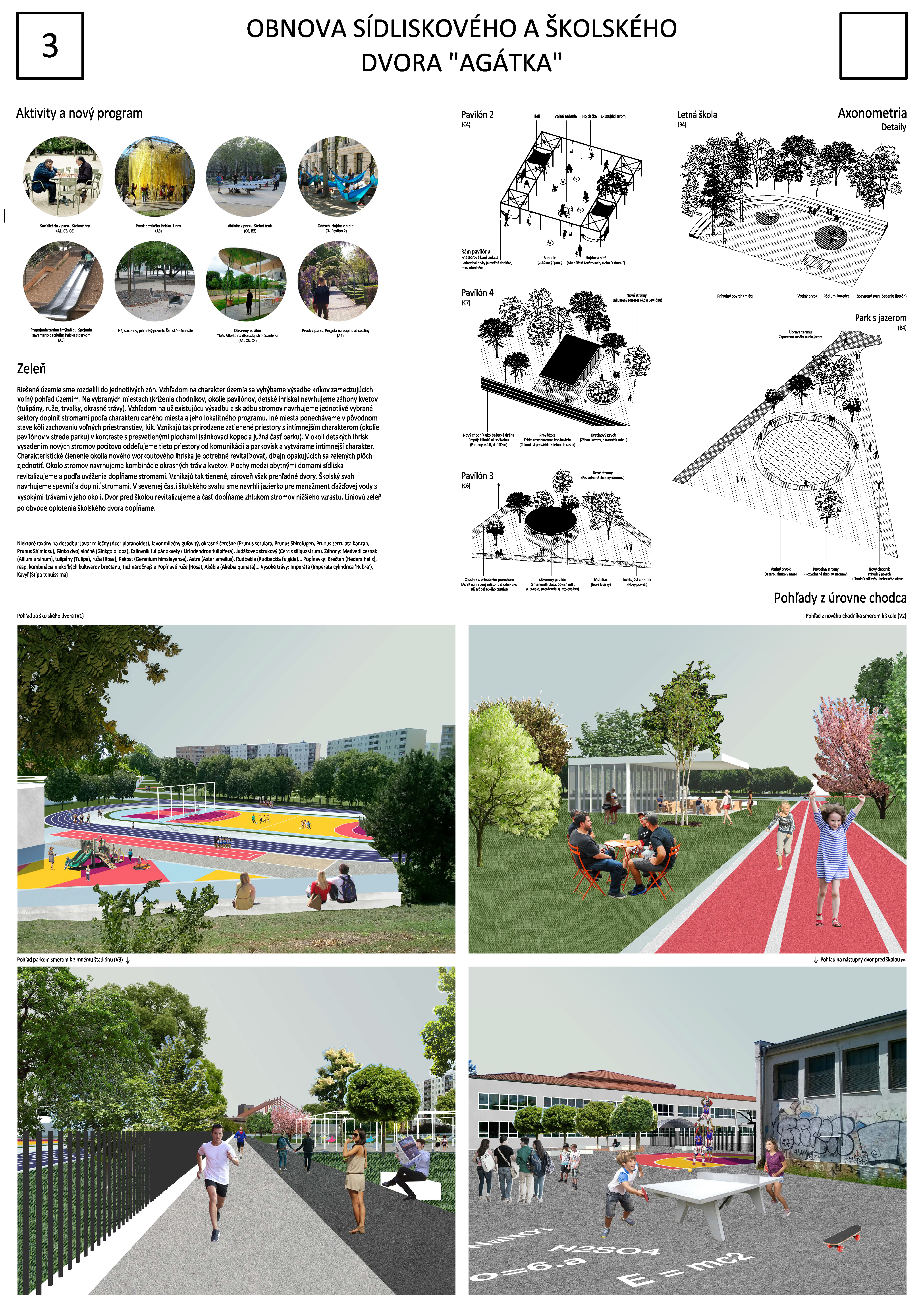 Kvalitné koncepčné riešenie, ktoré chápe vzťahy a osi v území, ktoré jasne prenáša do kostry návrhu, no svojou hĺbkou spracovania je nedostatočné. Riešenie parkovania v časti E - dvory na ul. V. Clementisa sú predimenzované a nevhodné. Taktiež centrálny priestor s fontánou a komunikačná os medzi vyhliadkou a kopcom Agátka sú predimenzované. V návrhu absentuje začlenenie plánovanej prístavby škôlky. Kladne hodnotíme prepojenie areálu ZŠ a MŠ formou hracej plochy, aj vôbec celkové prepojenie areálu školy s okolím. Oceňujeme že v návrhu je uvažované o tzv. sánkovacom kopci, je tu umiestnená reštaurácia v mieste, kde sú v priestore najkrajšie výhľady na okolie. Návrh je schematický a pripomína analýzu územia, no neponúka celkové riešenie, skoro vôbec nevyužíva prvky súčasnej krajinno-architektonickej tvorby, čo je pri tomto zadaní nevyhnutnosťou.