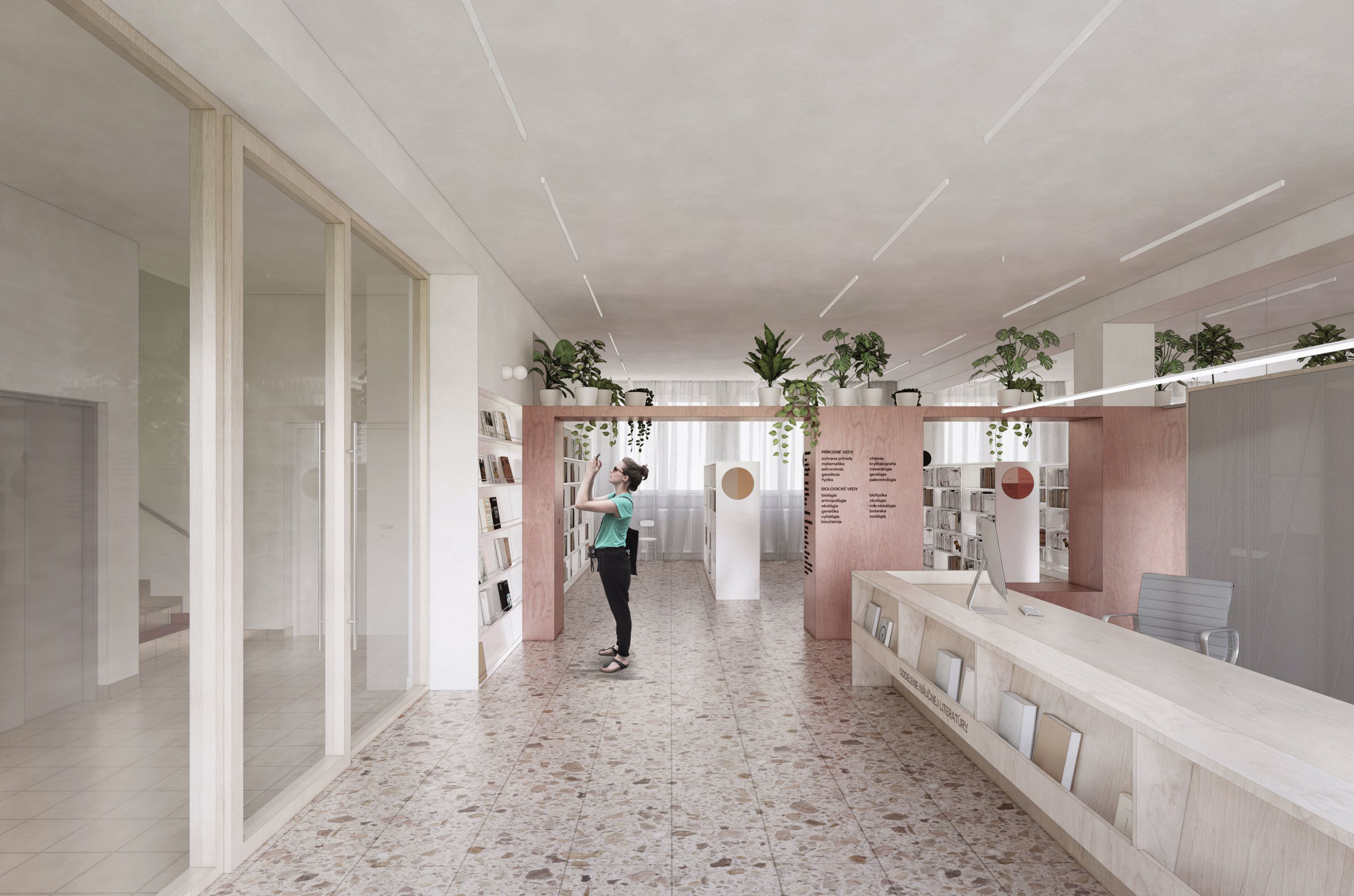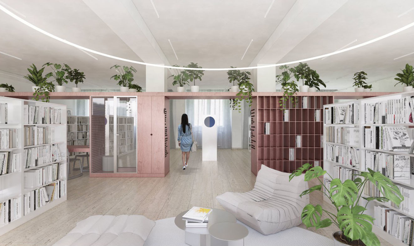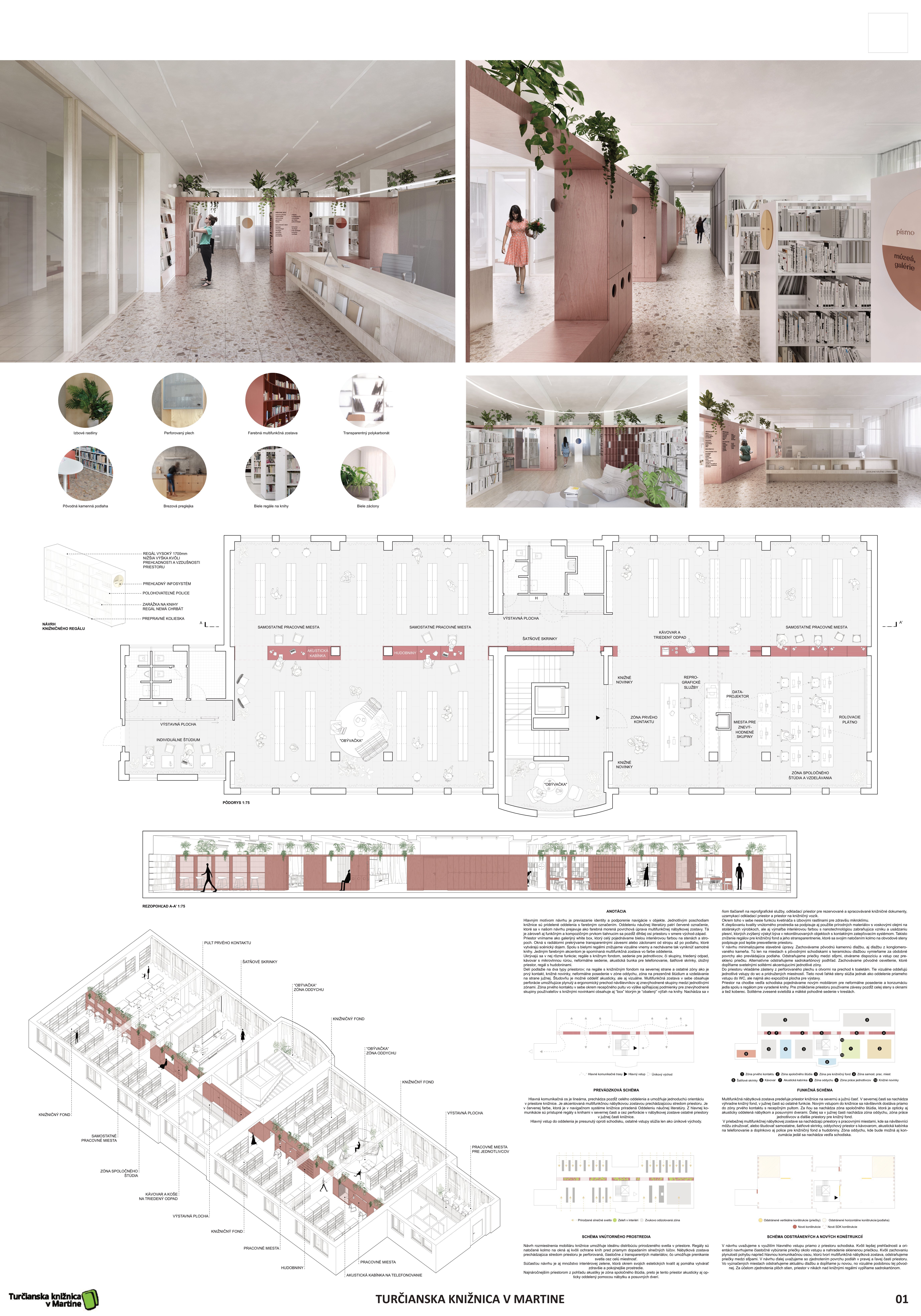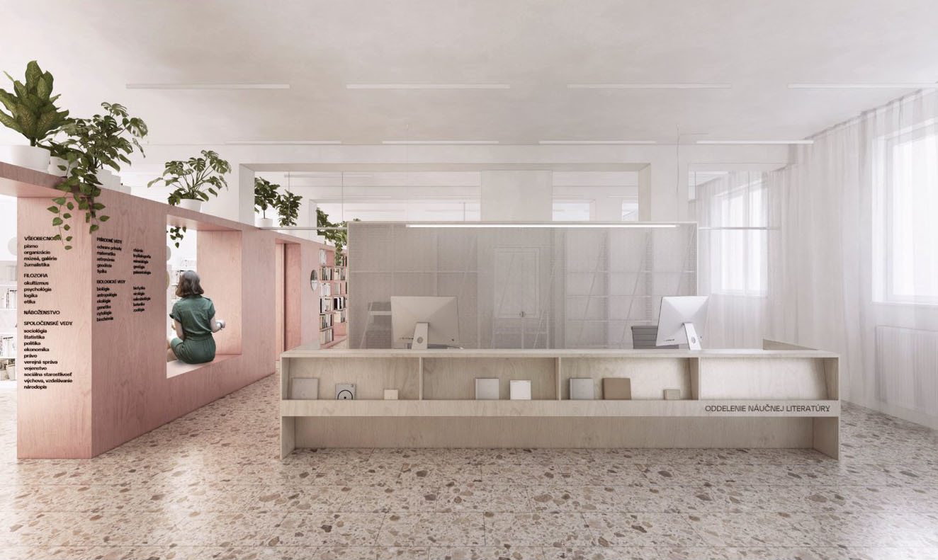 Zámer návrhu by mohol byť charakterizovaný ako prepájanie a kontinuita. Nielen priestorová, ale najmä myšlienková a koncepčná. Hľadanie a zastieranie optických bariér si dáva za cieľ minimalizovať dvojakosť oddelenia knižnice na jednom podlaží. Priestor je dnes delený na dva stavebné celky, ktoré pretína komunikačné jadro - bariéra. Návrh multifunkčnej nábytkovej zostavy, vo farbe oddelenia náučnej literatúry, priebežne prechádza oboma časťami podlažia a je hravým stvárnením novej funkcionality priestoru. Nejedná sa však o bežnú knižnú zostavu, ale súbor pracovných miest, neformálnych sedení, skriniek či iných úložných priestorov. Skrýva tak v sebe obslužné prvky, a umiestňuje ich na miestach na to potrebných. Línia multifunkčnej zostavy taktiež pomáha zónovať priestor knižnice podľa funkčnej náplne. Pritom však zachováva svojimi perforáciami a výškou prehľad o nadväzujúcich zónach. Porota vnímala tento novotvar ako zásadný a jasne čitateľný benefit návrhu.